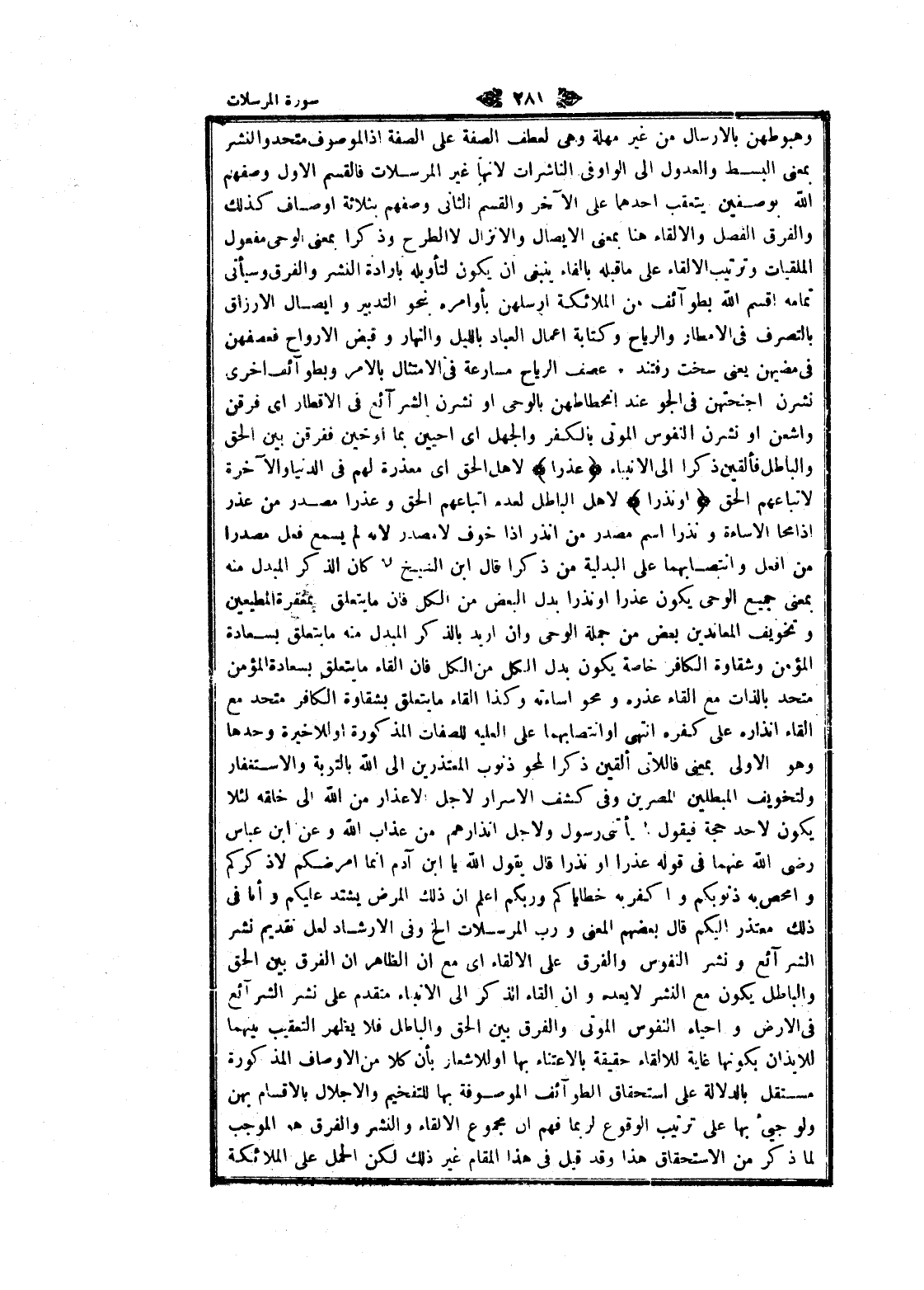 وهبوطهن بالإرسال من غير مهلة وهى لعطف الصفة على الصفة إذ الموصوف متحد والنشر بمعنى البسط والعدول الى الواو فى الناشرات لانها غير المرسلات فالقسم الاول وصفهم الله بوصفين يتعقب أحدهما على الآخر والقسم الثاني وصفهم بثلاثة أوصاف كذلك والفرق الفصل والإلقاء هنا بمعنى الإيصال والانزال لا الطرح وذكرا بمعنى الوحى مفعول الملقيات وترتيب الإلقاء على ما قبله بالفاء ينبغى ان يكون لتأويله بارادة النشر والفرق وسيأتى تمامه اقسم الله بطوائف من الملائكة أرسلهن بأوامره بنحو التدبير وإيصال الأرزاق بالتصرف فى الأمطار والرياح وكتابة اعمال العباد بالليل والنهار وقبض الأرواح فعصفهن فى مضيهن يعنى سخت رفتند. عصف الرياح مسارعة فى الامتثال بالأمر وبطوائف اخرى نشرن أجنحتهن فى الجو عند انحطاطهن بالوحى او نشرن الشرائع فى الأقطار اى فرقن واشعن او نشرن النفوس الموتى بالكفر والجهل اى احيين بما اوحين ففرقن بين الحق والباطل فألقين ذكرا الى الأنبياء عُذْراً لاهل الحق اى معذرة لهم فى الدنيا والآخرة لاتباعهم الحق أَوْ نُذْراً لاهل الباطل لعدم اتباعهم الحق وعذرا مصدر من عذر إذا محا الاساءة ونذرا اسم مصدر من انذر إذا خوف لا مصدر لانه لم يسمع فعل مصدرا من افعل وانتصابهما على البدلية من ذكرا قال ابن الشيخ ان كان الذكر المبدل منه بمعنى جميع الوحى يكون عذرا او نذرا بدل البعض من الكل فان ما يتعلق بمغفرة المطيعين وتخويف المعاندين بعض من جملة الوحى وان أريد بالذكر المبدل منه ما يتعلق بسعادة المؤمن وشقاوة الكافر خاصة يكون بدل الكل من الكل فان إلقاء ما يتعلق بسعادة المؤمن متحد بالذات مع إلقاء عذره ومحو إساءته وكذا إلقاء ما يتعلق بشقاوة الكافر متحد مع إلقاء إنذاره على كفره انتهى او انتهى او انتصابهما على العليه للصفات المذكورة او للاخيرة وحدها وهو الاولى بمعنى فاللاتى ألقين ذكرا لمحو ذنوب المعتذرين الى الله بالتوبة والاستغفار ولتخويف المبطلين المصرين وفى كشف الاسرار لاجل الاعذار من الله الى خلقه لئلا يكون لاحد حجة فيقول لما يأتنى رسول ولاجل إنذارهم من عذاب الله وعن ابن عباس رضى الله عنهما فى قوله عذرا او نذرا قال يقول الله يا ابن آدم انما امرضكم لا ذكركم وامحص به ذنوبكم واكفر به خطاياكم وربكم اعلم ان ذلك المرض يشتد عليكم وأنا فى ذلك معتذر إليكم قال بعضهم المعنى ورب المرسلات إلخ وفى الإرشاد لعل نقديم نشر الشرائع ونشر النفوس والفرق على الإلقاء اى مع ان الظاهر ان الفرق بين الحق والباطل يكون مع النشر لا بعده وان إلقاء الذكر الى الأنبياء متقدم على نشر الشرائع فى الأرض واحياء النفوس الموتى والفرق بين الحق والباطل فلا يظهر التعقيب بينهما للايذان بكونها غاية للالقاء حقيقة بالاعتناء بها او للاشعار بأن كلا من الأوصاف المذكورة مستقل بالدلالة على استحقاق الطوائف الموصوفة بها للتفخيم والإجلال بالاقسام بهن ولو جيئ بها على ترتيب الوقوع لربما فهم ان مجموع الإلقاء والنشر والفرق هو الموجب لما ذكر من الاستحقاق هذا وقد قيل فى هذا المقام غير ذلك لكن الحمل على الملائكة