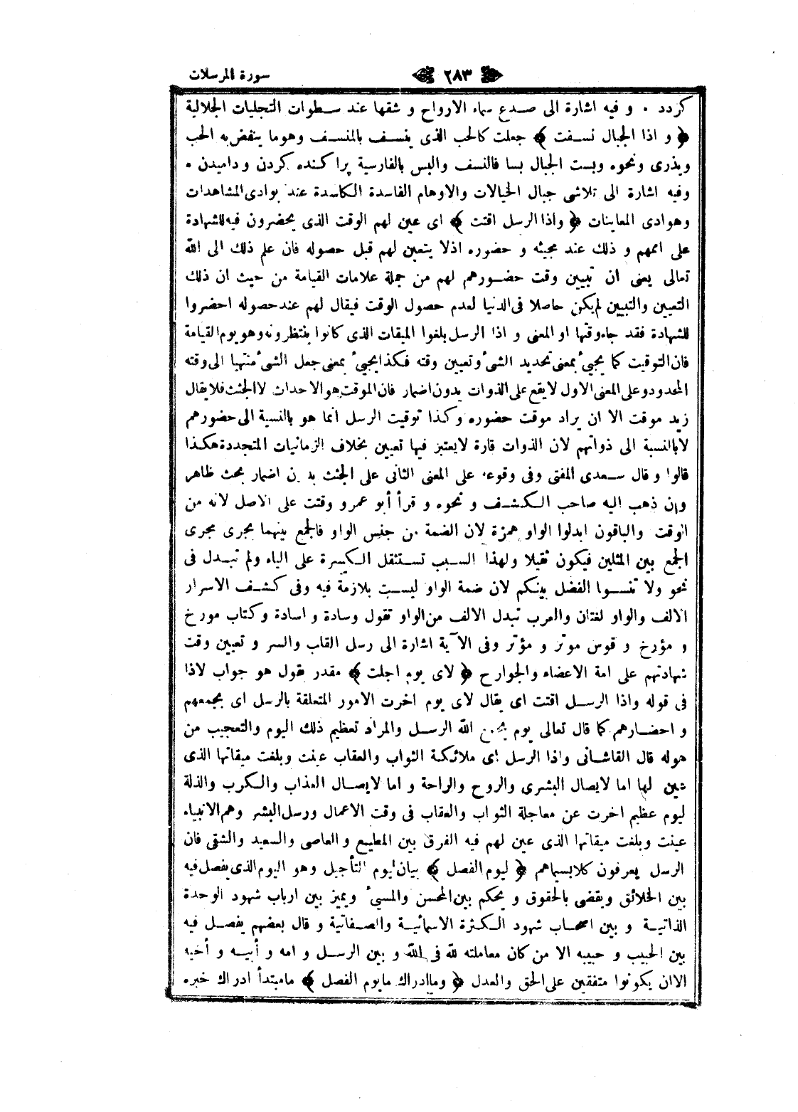 وفيه اشارة الى تلاشى جبال الخيالات والأوهام الفاسدة الكاسدة عند بوادي المشاهدات وهوادى المعاينات وَإِذَا الرُّسُلُ أُقِّتَتْ اى عين لهم الوقت الذي يحضرون فيه للشهادة على أممهم وذلك عند مجيئه وحضوره إذ لا يتعين لهم قبل حصوله فان علم ذلك الى الله تعالى يعنى ان تبيين وقت حضورهم لهم من جملة علامات القيامة من حيث ان ذلك التعيين والتبيين لم يكن حاصلا فى الدنيا لعدم حصول الوقت فيقال لهم عند حصوله احضروا للشهادة فقد جاء وقتها او المعنى وإذا الرسل بلغوا الميقات الذي كانوا ينتظرونه وهو يوم القيامة فان التوقيت كما يجيئ بمعنى تحديد الشيء وتعيين وقته فكذا يجيئ بمعنى جعل الشيء منتهيا الى وقته المحدود وعلى المعنى الاول لا يقع على الذوات يدون إضمار فان الموقت هو الأحداث لا الجثث فلا يقال زيد موقت الا ان يراد موقت حضوره وكذا توقيت الرسل انما هو بالنسبة الى حضورهم لا بالنسبة الى ذواتهم لان الذوات قارة لا يعتبر فيها تعيين بخلاف الزمانيات المتجددة هكذا قالوا وقال سعدى المفتى وفى وقوعه على المعنى الثاني على الجثث بدون إضمار بحث ظاهر وان ذهب اليه صاحب الكشف ونحوه وقرأ أبو عمرو وقتت على الأصل لانه من الوقت والباقون ابدلوا الواو همزة لان الضمة من جنس الواو فالجمع بينهما يجرى مجرى الجمع بين المثلين فيكون ثقيلا ولهذا السبب تستثقل الكسرة على الياء ولم تبدل فى نحو ولا تنسوا الفضل بينكم لان ضمة الواو ليست بلازمة فيه وفى كشف الاسرار الالف والواو لغتان والعرب تبدل الالف من الواو تقول وسادة واسادة وكتاب مورخ ومؤرخ وقوس موتر ومؤتر وفى الآية اشارة الى رسل القلب والسر وتعيين وقت شهادتهم على امة الأعضاء والجوارح لِأَيِّ يَوْمٍ أُجِّلَتْ مقدر بقول هو جواب لاذا فى قوله وإذا الرسل أقتت اى يقال لاى يوم أخرت الأمور المتعلقة بالرسل اى بجمعهم وإحضارهم كما قال تعالى يوم يجمع الله الرسل والمراد تعظيم ذلك اليوم والتعجيب من هوله قال القاشاني وإذا الرسل اى ملائكة الثواب والعقاب عينت وبلغت ميقاتها الذي عين لها اما لايصال البشرى والروح والراحة واما لايصال العذاب والكرب والذلة ليوم عظيم أخرت عن معاجلة الثواب والعقاب فى وقت الأعمال ورسل البشر وهم الأنبياء عينت وبلغت ميقاتها الذي عين لهم فيه الفرق بين المطيع والعاصي والسعيد والشقي فان الرسل يعرفون كلا بسيماهم لِيَوْمِ الْفَصْلِ بيان ليوم التأجيل وهو اليوم الذي يفصل فيه بين الخلائق ويقضى بالحقوق ويحكم بين المحسن والمسيئ ويميز بين ارباب شهود الوحدة الذاتية وبين اصحاب شهود الكثرة الاسمائية والصفاتية وقال بعضهم يفصل فيه بين الحبيب وحبيبه الا من كان معاملته لله فى الله وبين الرسل وامه وأبيه وأخيه الا ان يكونوا متفقين على الحق والعدل وَما أَدْراكَ ما يَوْمُ الْفَصْلِ ما مبتدأ ادراك خبره
