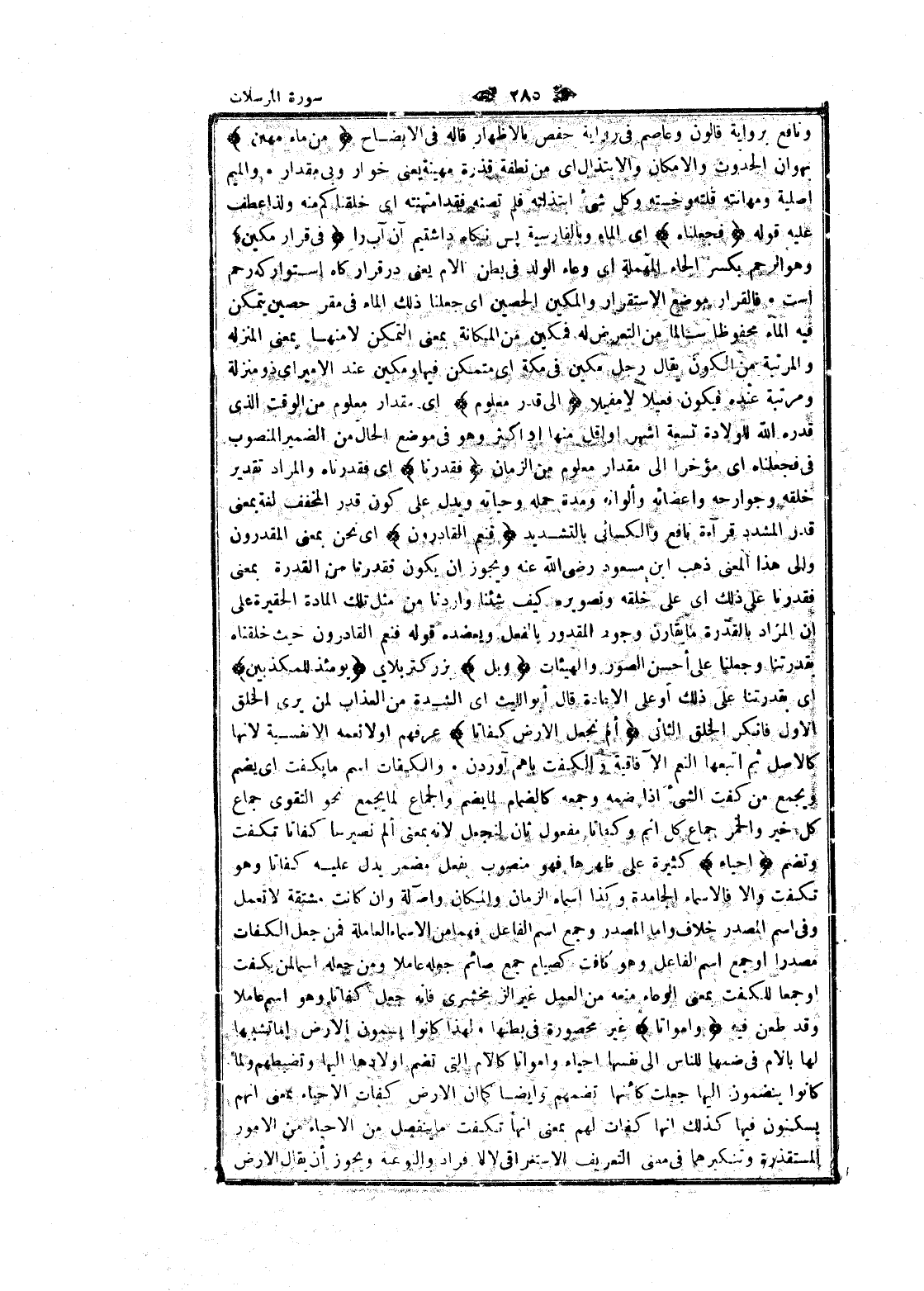 ونافع برواية قالون وعاصم فى رواية حفص بالإظهار قاله فى الإيضاح مِنْ ماءٍ مَهِينٍ بهوان الحدوث والإمكان والابتذال اى من نطفة قذرة مهينة يعنى خوار وبى مقدار. والميم اصلية ومهانته قلته وخسته وكل شىء ابتذلته فلم تصنه فقد امتهنته اى خلقناكم منه ولذا عطف عليه قوله فَجَعَلْناهُ اى الماء وبالفارسية پس نكاه داشتيم آن آب را فِي قَرارٍ مَكِينٍ وهو الرحم بكسر الحاء المهملة اى وعاء الولد فى بطن الام يعنى در قرارگاه استوار كه رحم است. فالقرار موضع الاستقرار والمكين الحصين اى جعلنا ذلك الماء فى مقر حصين يتمكن فيه الماء محفوظا سالما من التعرض له فمكين من المكانة بمعنى التمكن لا منها بمعنى المنزلة والمرتبة من الكون يقال رجل مكين فى مكة اى متمكن فيها ومكين عند الأمير اى ذو منزلة ومرتبة عنده فيكون فعيلا لا مفيلا إِلى قَدَرٍ مَعْلُومٍ اى مقدار معلوم من الوقت الذي قدره الله للولادة تسعة أشهر او اقل منها او اكثر وهو فى موضع الحال من الضمير المنصوب فى فجعلناه اى مؤخرا الى مقدار معلوم من الزمان فَقَدَرْنا اى فقدرناه والمراد تقدير خلقه وجوارحه وأعضائه وألوانه ومدة حمله وحياته ويدل على كون قدر المخفف لغة بمعنى قدر المشدد قراءة نافع والكسائي بالتشديد فَنِعْمَ الْقادِرُونَ اى نحن بمعنى المقدرون والى هذا المعنى ذهب ابن مسعود رضى الله عنه ويجوز ان يكون فقدرنا من القدرة بمعنى فقدرنا على ذلك اى على خلقه ونصويره كيف شئنا وأردنا من مثل تلك المادة الحقيرة على ان المراد بالقدرة ما يقارن وجود المقدور بالفعل ويعضده قوله فنعم القادرون حيث خلقناه بقدرتنا وجعلنا على أحسن الصور والهيئات وَيْلٌ بزركتر بلايى يَوْمَئِذٍ لِلْمُكَذِّبِينَ اى بقدرتنا على ذلك او على الاعادة قال أبو الليث اى الشدة من العذاب لمن يرى الخلق الاول فانكر الخلق الثاني أَلَمْ نَجْعَلِ الْأَرْضَ كِفاتاً عرفهم او لانعمه الانفسية لانها كالاصل ثم اتبعها النعم الآفاقية والكفت باهم آوردن. والكفات اسم ما يكفت اى يضم ويجمع من كفت الشيء إذا ضمه وجمعه كالضمام لما يضم والجماع لما يجمع نحو التقوى جماع كل خير والخمر جماع كل إثم وكفاتا مفعول ثان لنجعل لانه بمعنى ألم نصيرها كفاتا تكفت وتضم أَحْياءً كثيرة على ظهرها فهو منصوب بفعل مضمر يدل عليه كفاتا وهو تكفت والا فالاسماء الجامدة وكذا اسماء الزمان والمكان واصلة وان كانت مشتقة لا تعمل وفى اسم المصدر خلاف واما المصدر وجمع اسم الفاعل فهما من الأسماء العاملة فمن جعل الكفات مصدرا او جمع اسم الفاعل وهو كافت كصيام جمع صائم جعله عاملا ومن جعله اسما لمن بكفت او جمعا للكفت بمعنى الوعاء منعه من العمل غير الزمخشري فانه جعل كفاتا وهو اسم عاملا وقد طعن فيه وَأَمْواتاً غير محصورة فى بطنها ولهذا كانوا يسمون الأرض اما تشبيها لها بالأم فى ضمها للناس الى نفسها احياء وأمواتا كالام التي تضم أولادها إليها وتضبطهم ولما كانوا ينضمون إليها جعلت كأنها تضمهم وايضا كما ان الأرض كفات الاحياء بمعنى انهم يسكنون فيها كذلك انها كفات لهم بمعنى انها تكفت ما ينفصل من الاحياء من الأمور المستقذرة وتنكيرهما فى معنى التعريف الاستغراقى لا لافراد والنوعية ويجوز أن يقال الأرض