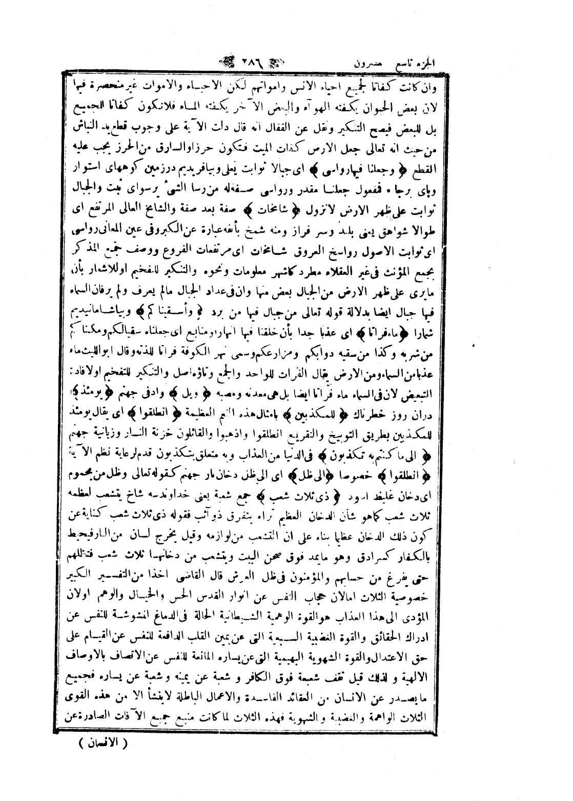 وان كانت كفاتا لجميع احياء الانس وأمواتهم لكن الاحياء والأموات غير منحصرة فيها لان بعض الحيوان يكفته الهولء والبعض الآخر يكفته الماء فلا تكون كفاتا للجميع بل للبعض فيصح التنكير ونقل عن القفال انه قال دلت الآية على وجوب قطع يد النباش من حيث انه تعالى جعل الأرض كفات الميت فتكون حرز او السارق من الحرز يجب عليه القطع وَجَعَلْنا فِيها رَواسِيَ اى جبالا ثوابت يعلى وبيافريديم در زمين كوههاى استوار و پاى برجا. فمفعول جعلنا مقدر ورواسى صفة له من رسا الشيء يرسو اى ثبت والجبال ثوابت على ظهر الأرض لا نزول شامِخاتٍ صفة بعد صفة والشامخ العالي المرتفع اى طوالا شواهق يعنى بلند وسرفراز ومنه شمخ بأنفه عبارة عن الكبر وفى عين المعاني رواسى اى ثوابت الأصول رواسخ العروق شامخات اى مرتفعات الفروع ووصف جمع المذكر بجمع المؤنث فى غير العقلاء مطرد كاشهر معلومات ونحوه والتنكير للتفخيم او للاشعار بأن ما يرى على ظهر الأرض من الجبال بعض منها وان فى عداد الجبال ما لم يعرف ولم يرفان السماء فيها جبال ايضا بدلالة قوله تعالى من جبال فيها من برد وَأَسْقَيْناكُمْ وبياشامانيديم شما را ماءً فُراتاً اى عذبا جدا بأن خلقنا فيها أنهارا ومنابع اى جعلناه سقيا لكم ومكناكم من شربه وكذا من سقيه دوابكم ومزارعكم وسمى نهر الكوفة فراتا للذته وقال ابو الليث ماء عذبا من السماء ومن الأرض يقال الفرات للواحد والجمع وتاؤه اصل والتنكير للتفخيم او لافادة التبعيض لان فى السماء ماء فراتا ايضا بل هى معدنه ومصبه وَيْلٌ واد في جهنم يَوْمَئِذٍ در ان روز خطرناك لِلْمُكَذِّبِينَ بامثال هذه النعم العظيمة انْطَلِقُوا اى يقال يومئذ للمكذبين بطريق التوبيخ والتقريع انطلقوا واذهبوا والقائلون خزنة النار وزبانية جهنم إِلى ما كُنْتُمْ بِهِ تُكَذِّبُونَ فى الدنيا من العذاب وبه متعلق بتكذبون قدم لرعاية نظم الآية انْطَلِقُوا خصوصا إِلى ظِلٍّ اى الى ظل دخان نار جهنم كقوله تعالى وظل من يحموم اى دخان غليظ اسود ذِي ثَلاثِ شُعَبٍ جمع شعبة يعنى خداوند سه شاخ يتشعب لعظمه ثلاث شعب كما هو شأن الدخان العظيم تراه يتفرق ذوآئب فقوله ذى ثلاث شعب كناية عن كون ذلك الدخان عظيما بناء على ان التشعب من لوازمه وقيل يخرج لسان من النار فيحيط بالكفار كسرادق وهو ما يمد فوق صحن البيت ويتشعب من دخانها ثلاث شعب فتظلهم حتى يفرغ من حسابهم والمؤمنون فى ظل العرش قال القاضي أخذا من التفسير الكبير خصوصية الثلاث اما لان حجاب النفس عن أنوار القدس الحس والخيال والوهم أو لأن المؤدى الى هذا العذاب هو القوة الوهمية الشيطانية الحالة فى الدماغ المشوشة للنفس عن ادراك الحقائق والقوة الغضبية السبعية التي عن بمين القلب الدافعة للنفس عن القيام على حق الاعتدال والقوة الشهوية البهيمية التي عن يساره المانعة للنفس عن الاتصاف بالأوصاف الالهية ولذلك قيل تقف شعبعة فوق الكافر وشعبة عن يمينه وشعبة عن يساره فجميع ما يصدر عن الإنسان من العقائد الفاسدة والأعمال الباطلة لا ينشأ الا من هذه القوى الثلاث الواهمة والغضبية والشهوية فهذه الثلاث لما كانت منبع جميع الآفات الصادرة عن