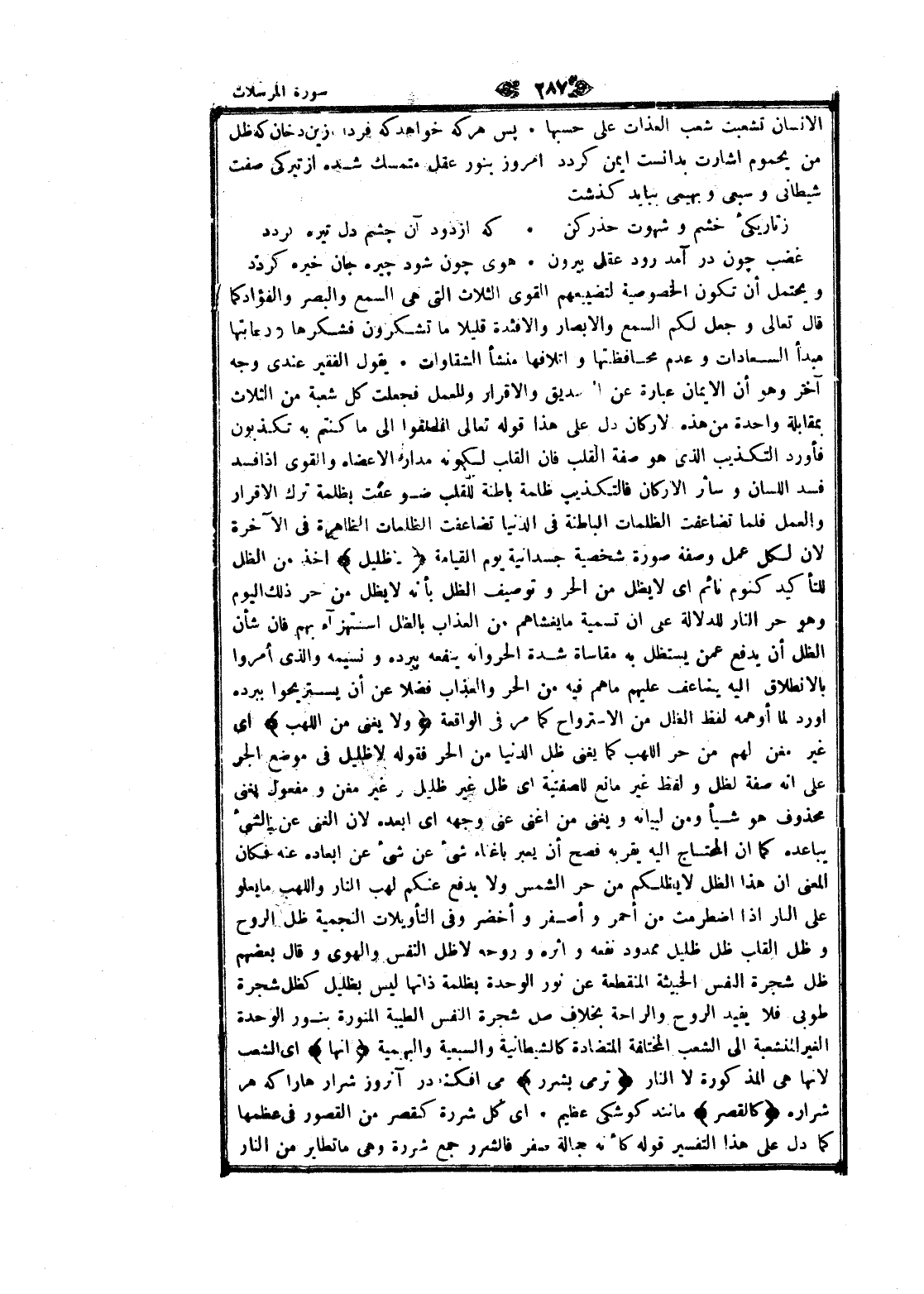 ويحتمل أن تكون الخصوصية لتضييعهم القوى الثلاث التي هى السمع والبصر والفؤاد كما قال تعالى وجعل لكم السمع والابصار والافئدة قليلا ما تشكرون فشكرها ودعابتها مبدأ السعادات وعدم محافظتها واتلافها منشأ الشقاوات. يقول الفقير عندى وجه آخر وهو أن الايمان عبارة عن التصديق والإقرار وللعمل فجعلت كل شعبة من الثلاث بمقابلة واحدة من هذه الأركان دل على هذا قوله تعالى انطلقوا الى ما كنتم به تكذبون فأورد التكذيب الذي هو صفة القلب فان القلب لكونه مدارة الأعضاء والقوى إذا فسد فسد اللسان وسائر الأركان فالتكذيب ظلمة باطنة للقلب ضوعفت بظلمة ترك الإقرار والعمل فلما تضاعفت الظلمات الباطنة فى الدنيا تضاعفت الظلمات الظاهرة فى الآخرة لان لكل عمل وصفة صورة شخصية جسدانية يوم القيامة لا ظَلِيلٍ أخذ من الظل للتأكيد كنوم نائم اى لا يظل من الحر وتوصيف الظل بأنه لا يظل من حر ذلك اليوم وهو حر النار للدلالة على ان تسمية ما يغشاهم من العذاب بالظل استهزاء بهم فان شأن الظل أن يدفع عمن يستظل به مقاساة شدة الحر وأنه ينفعه ببرده ونسيمه والذي أمروا بالانطلاق اليه يضاعف عليهم ما هم فيه من الحر والعذاب فضلا عن أن يستريحوا ببرده أورد لما أوهمه لفظ الظل من الاسترواح كما مر فى الواقعة وَلا يُغْنِي مِنَ اللَّهَبِ اى غير مغن لهم من حر اللهب كما يغنى ظل الدنيا من الحر فقوله لا ظليل فى موضع الجر على انه صفة لظل ولفظ غير مانع للصفتية اى ظل غير ظليل وغير مغن ومفعول بغنى محذوف هو شيأ ومن لبيانه ويغنى من اغنى عنى وجهه اى أبعده لان الغنى عن الشيء يباعده كما ان المحتاج اليه يقربه فصح أن يعبر باغناء شىء عن شىء عن ابعاده عنه فكان المعنى ان هذا الظل لا يظلكم من حر الشمس ولا يدفع عنكم لهب النار واللهب ما يعلو على النار إذا اضطرمت من أحمر وأصفر وأخضر وفى التأويلات النجمية ظل الروح وظل القلب ظل ظليل ممدود نفعه واثره وروحه لا ظل النفس والهوى وقال بعضهم ظل شجرة النفس الخبيثة المنقطعة عن نور الوحدة بظلمة ذاتها ليس بظليل كظل شجرة طوبى فلا يفيد الروح والراحة بخلاف صل شجرة النفس الطيبة المنورة بنور الوحدة الغير المنشعبة الى الشعب المختلفة المتضادة كالشيطانية والسبعية والبهمية إِنَّها اى الشعب لانها هى المذكورة لا النار تَرْمِي بِشَرَرٍ مى افكند در آن روز شرارها را كه هر شراره كَالْقَصْرِ مانند كوشكى عظيم. اى كل شررة كقصر من القصور فى عظمها كما دل على هذا التفسير قوله كأنه جمالة صفر فالشرر جمع شررة وهى ما تطاير من النار