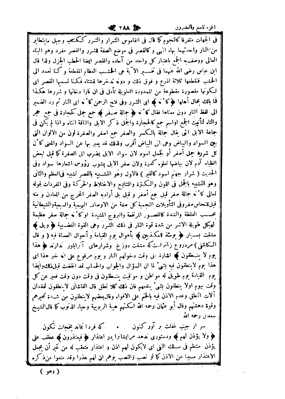 فى الجهات متفرقا كالنجوم كما قال فى القاموس الشرار والشرر ككتاب وجبل ما يتطاير من النار واحدتهما بهاء انتهى وكالقصر فى موضع الصفة للشرر والقصر مفرد وهو البناء العالي ووصف به الجمع باعتبار كل واحد من آحاده والقصر ايضا الحطب الجزل ولذا قال ابن عباس رضى الله عنهما فى تفسير الآية هى الخشب العظام المقطعة وكنا نعمد الى الخشب فنقطعها ثلاثة اذرع وفوق ذلك ودونه تدخرها للشتاء فكنا نسميها القصر اى لكونها مقصورة مقطوعة من الممدودة الطويلة تأمل فى ان نارا دخانها وشررها هكذا فما بالك بحال أهلها كَأَنَّهُ اى الشرر وفى فتح الرحمن كأنه اى النار ثم رد الضمير الى لفظ النار دون معناها فقال كأنه جِمالَتٌ صُفْرٌ جمع جمل كحجارة فى جمع حجر والتاء لتأنيث الجمع او اسم جمع كالحجارة والجمل ذكر الإبل والناقة انثاه وإذا لم يكن فى جماعة الإبل أنثى يقال جمالة بالكسر والصفر جمع اصفر والصفرة لون من الألوان التي بين السواد والبياض وهى ان البياض أقرب ولذلك قد يعبر بها عن السواد والمعنى كأن كل شررة جمل أصفر أو كجمل اسود لان سواد الإبل يضرب الى الصفرة كما قيل لبعض الظباء آدم لان بياضها تعلوه كدرة ولان صفر الإبل يشوب رؤوس اشعارها سواد وفى الحديث (شرار جهنم اسود كالقير) فالاول وهو التشبيه بالقصر تشبيه فى العظم والثاني وهو التشبيه بالجمل فى اللون والكثرة والتتابع والاختلاط والحركة وفى المفردات قوله تعالى كأنه جمالة صفر قيل جمع أصفر وقيل بل أراد به الصفر المخرج من المعادن ومنه قيل للنحاس صفر وفى التأويلات النجمية كل صفة من الأوصاف البهيمية والسبعية والشيطانية بحسب الغلظة والشدة كالقصور المرتفعة والبروج المشيدة او كأنه جمالة صفر عظيمة لهيكل طويلة الأشر من شدة قوة النار فى ذلك الشرر وهى القوة الغضبية وَيْلٌ مشقت بسيار يَوْمَئِذٍ لِلْمُكَذِّبِينَ بأهوال يوم القيامة وأحوال العصاة فيه (وقال الكاشفى) مر دروغ زنانراست كه مشقت دوزخ وشرارهاى آنرا باور ندارند هذا يَوْمُ لا يَنْطِقُونَ اشارة الى وقت دخولهم النار ويوم مرفوع على انه خبر هذا اى هذا يوم لا ينطقون فيه بشئ لما ان السؤال والجواب والحساب قد انقضت قبل ذلك وايضا يوم القيامة يوم طويل له مواطن ومواقيت ينطقون فى وقت دون وقت فعبر عن كل وقت بيوم اولا ينطقون بشئ ينفعهم فان ذلك كلا نطق قال القاشاني لا ينطقون لفقدان آلات النطق وعدم الاذن فيه بالختم على الأفواه وقال بعضهم لا ينطقون من شدة تحيرهم وقوة دهشتهم وقال أبو عثمان رحمه الله أسكتهم هيبة الربوبية وحياء الذنوب كما قال الشيخ سعدى رحمه الله