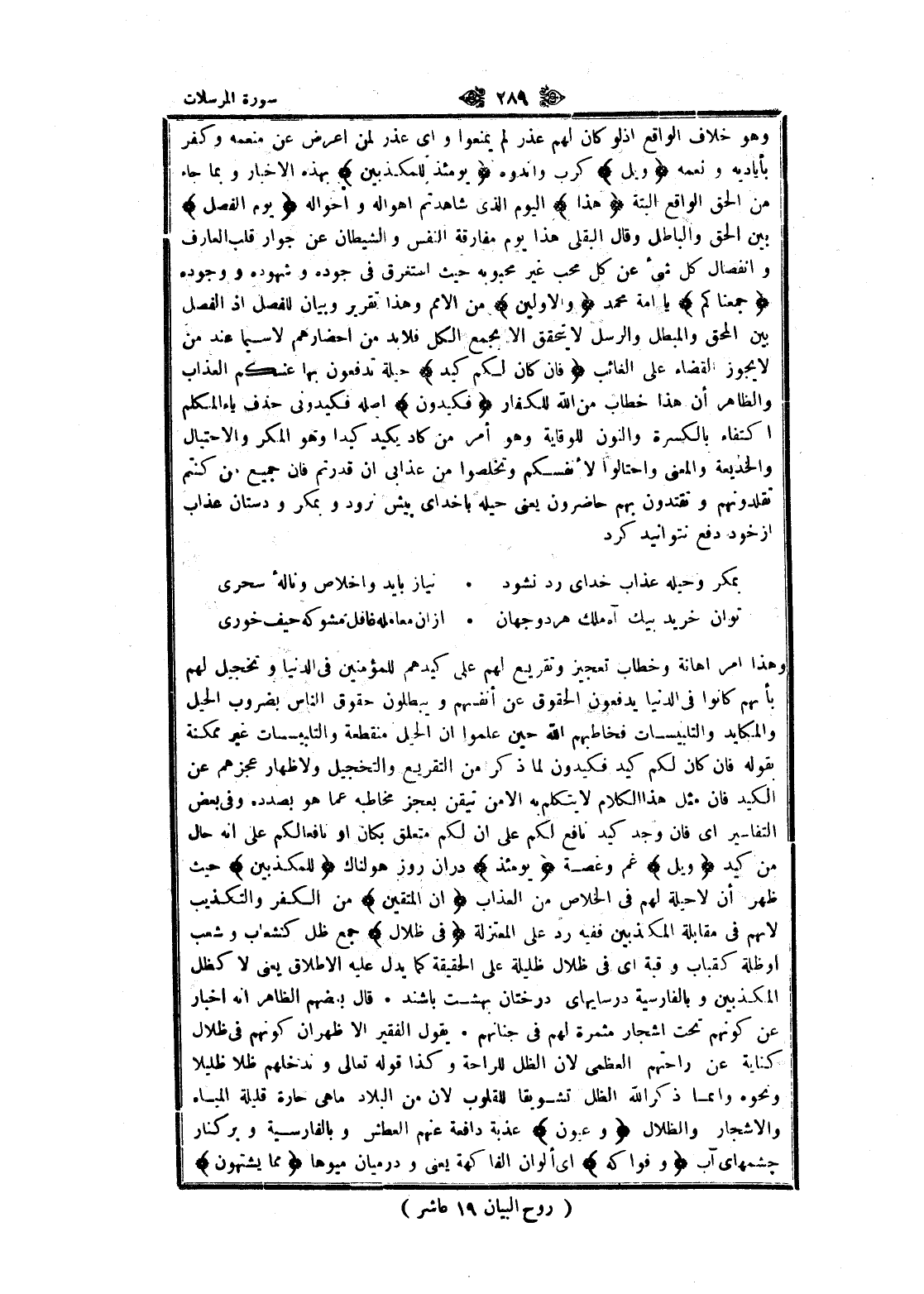وهذا امر اهانة وخطاب تعجيز وتقريع لهم على كيدهم للمؤمنين فى الدنيا وتخجيل لهم بأنهم كانوا فى الدنيا يدفعون الحقوق عن أنفسهم ويبطلون حقوق الناس بضروب الحيل والمكايد والتلبيسات فخاطبهم الله حين علموا ان الحيل منقطعة والتلبيسات غير ممكنة بقوله فان كان لكم كيد فكيدون لما ذكر من التقريع والتخجيل ولاظهار عجزهم عن الكيد فان مثل هذا الكلام لا يتكلم به الا من تيقن بعجز مخاطبه عما هو بصدده وفى بعض التفاسير اى فان وجد كيد نافع لكم على ان لكم متعلق بكان او نافعالكم على انه حال من كيد وَيْلٌ غم وغصة يَوْمَئِذٍ در ان روز هولناك لِلْمُكَذِّبِينَ حيث ظهر أن لا حيلة لهم فى الخلاص من العذاب إِنَّ الْمُتَّقِينَ من الكفر والتكذيب لانهم فى مقابلة المكذبين ففيه رد على المعتزلة فِي ظِلالٍ جمع ظل كشعاب وشعب او ظلة كقباب وقبة اى فى ظلال ظليلة على الحقيقة كما يدل عليه الإطلاق يعنى لا كظل المكذبين وبالفارسية در سايهاى درختان بهشت باشند. قال بعضهم الظاهر انه اخبار عن كونهم تحت أشجار مثمرة لهم فى جنانهم. يقول الفقير الأظهر أن كونهم فى ظلال كناية عن راحتهم العظمى لان الظل للراحة وكذا قوله تعالى وندخلهم ظلا ظليلا ونحوه وانما ذكر الله الظل تشويقا للقلوب لان من البلاد ما هى حارة قليلة المباه والأشجار والظلال وَعُيُونٍ عذبة دافعة عنهم العطش وبالفارسية وبر كنار چشمهاى آب وَفَواكِهَ اى ألوان الفاكهة يعنى ودر ميان ميوها مِمَّا يَشْتَهُونَ