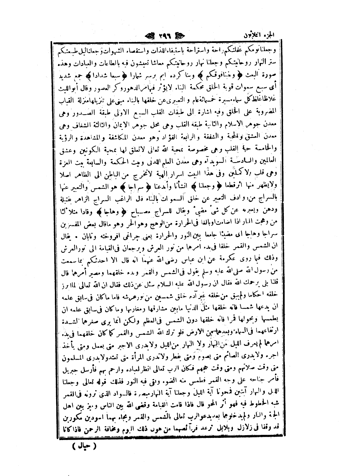 وجعلنا نومكم غفلتكم راحة واستراحة باستيفاء اللذات واستقصاء الشهوات وجعلنا ليل طبعتكم ستر النهار روحانيتكم وجعلنا نهار روحانيتكم معاشا تعيشون فيه بالطاعات والعبادات وهذه صورة البعث وَبَنَيْنا فَوْقَكُمْ وبنا كرده ايم بر سر شما را سَبْعاً شِداداً جمع شديد أي سبع سموات قوية الخلق محكمة البناء لا يؤثر فيها مر الدهور وكر العصور وقال أبو الليث غلاظا غلظ كل سماء مسيرة خمسائة عام والتعبيرى عن خلقها بالبناء مبنى على تنزيلها منزلة القباب المضروبة على الخلق وفيه اشارة الى طبقات القلب السبع الاولى طبقة الصدور وهى معدن جوهر الإسلام والثانية طبقة القلب وهى محل جوهر الايمان والثالثة الشغاف وهى معدن العشق والمحبة والشفقة والرابعة الفؤاد وهو معدن المكاشفة والمشاهدة والرؤية والخامسة حبة القلب وهى مخصوصة نمحبة الله تعالى لا تعلق لها بمحبة الكونين وعشق العالمين والسادسة السويداء وهى معدن العلم اللدني وميت الحكمة والسابعة بيت العزة وهى قلب الأكملين وفى هذا البيت اسرار الهية لا تخرج من الباطن الى الظاهر أصلا ولا يظهر منها اثر قطعا وَجَعَلْنا انشأنا وأمدعنا سِراجاً هو الشمس والتعبير عنها بالسراج من روادف التعبير عن خلق السموات بالبناء قال الراغب السراج الزاهر بفتيلة ودهن ويعبر به عن كل شىء مضيئ ويقال للسراج مصباح وَهَّاجاً وقادا متلألئا من وهجت النار إذا أضاءت او بالغا فى الحرارة من الوهج وهو الحر وهو ما قال بعض المفسرين سراجا وهاجا اى مضيئا جامعا بين النور والحرارة يعنى چراغى افروخته وتابان. يقال ان الشمس والقمر خلقا فى بدء أمرهما من نور العرش ويرجعان فى القيامة الى نور العرش وذلك فيما روى عكرمة عن ابن عباس رضى الله عنهما انه قال الا أحدثكم بما سمعت من رسول الله صلى الله عليه وسلم يقول فى الشمس والقمر وبدء خلقهما ومصير أمرهما قال قلنا بلى يرحمك الله فقال ان رسول الله عليه السلام سئل عن ذلك فقال ان الله تعالى لما ابرز خلقه احكاما ولم يبق من خلقه غير آدم خلق شمسين من نور عرشه فاما ما كان فى سابق علمه ان يدعها شمسا فانه خلقها مثل الدنيا ما بين مشارقها ومغاربها وما كان فى سابق علمه ان يطمسها ويحولها قمرا فانه خلقها دون الشمس فى العظم ولكن انما يرى صغرهما لشدة ارتفاعهما فى السماء وبعدهما من الأرض فلو ترك الله الشمس والقمر كما كان خلقهما فى بدء أمرهما لم يعرف الليل من النهار ولا النهار من الليل ولا يدرى الأجير متى يعمل ومتى يأخذ اجره ولا يدرى الصائم متى يصوم ومتى يفطر ولا تدرى المرأة متى تعتدو لا يدرى المسلمون متى وقت صلاتهم ومتى وقت حجهم فكان الرب تعالى انظر لعباده وارحم بهم فأرسل جبريل فأمر جناحه على وجه القمر فطمس منه الضوء وبقي فيه النور فذلك قوله تعالى وجعلنا الليل والنهار آيتين فمحونا آية الليل وجعلنا آية النهار مبصرة فالسواد الذي ترونه فى القمر شبه الخطوط فيه فهو أثر المحو قال فاذا قامت القيامة وقضى الله بين الناس وميز بين اهل الجنة والنار ولم يدخلوهما بعد يدعو الرب تعالى بالشمس والقمر ويجاء بهما أسودين مكورين قد وقفا فى زلازل وبلابل ترعد فرآئصهما من هول ذلك اليوم ومخافة الرحمن فاذا كانا