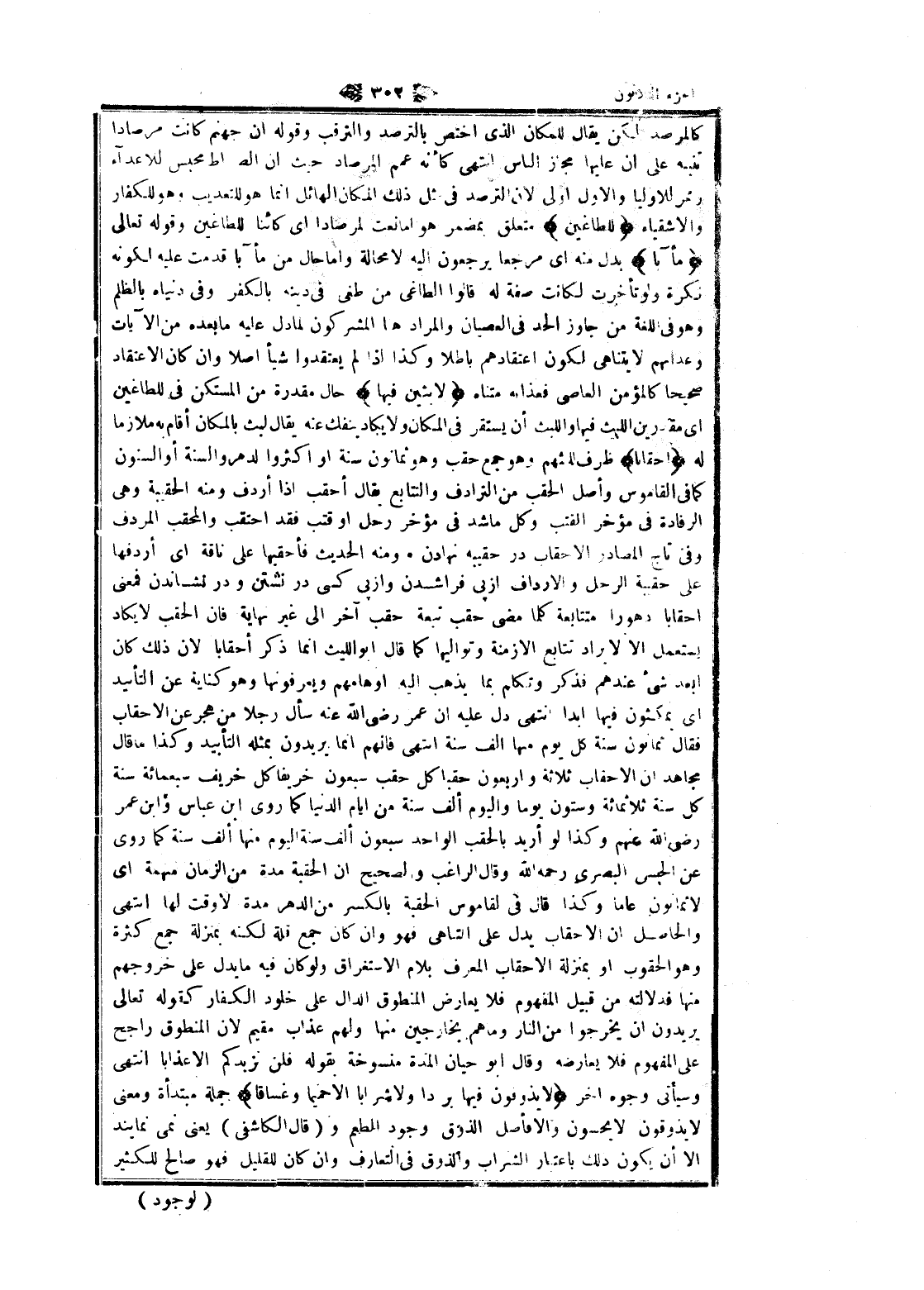كالمرصد لكن يقال للمكان الذي اختص بالترصد والترقب وقوله ان جهنم كانت مرصادا تنبيه على ان عليها مجاز الناس انتهى كأنه عمم المرصاد حيث ان الصراط محبس للاعداء وممر للاوليا والاول اولى لان الترصد فى مثل ذلك المكان الهائل انما هو للتعذيب وهو للكفار والأشقياء لِلطَّاغِينَ متعلق بمضمر هو إما نعت لمرصادا اى كائنا للطاغين وقوله تعالى مَآباً بدل منه اى مرجعا يرجعون اليه لا محالة واما حال من مأبا قدمت عليه لكونه نكرة ولو تأخرت لكانت صفة له قالوا الطاغي من طغى فى دينه بالكفر وفى دنياه بالظلم وهو فى اللغة من جاوز الحد فى العصيان والمراد هنا المشركون لما دل عليه ما بعده من الآيات وعدانهم لا يتناهى لكون اعتقادهم باطلا وكذا إذا لم يعتقدوا شيأ أصلا وان كان الاعتقاد صحيحا كالمؤمن العاصي فعذابه متناه لابِثِينَ فِيها حال مقدرة من المستكن فى للطاغين اى مقدرين اللبث فيها واللبث أن يستقر فى المكان ولا يكاد ينفك عنه يقال لبث بالمكان أقام به ملازما له أَحْقاباً ظرف للثهم وهو جمع حقب وهو ثمانون سنة او اكثر والدهر والسنة أو السنون كما فى القاموس وأصل الحقب من الترادف والتتابع يقال أحقب إذا أردف ومنه الحقيبة وهى الرفادة فى مؤخر القتب وكل ما شد فى مؤخر رحل او قتب فقد احتقب والمحقب المردف وفى تاج المصادر الاحقاب در حقيبه نهادن. ومنه الحديث فأحقبها على ناقة اى أردفها على حقيبة الرحل والارداف از پى فرا شدن واز پى كسى در نشستن ودر نشاندن فمعنى أحقابا دهورا متتابعة كلما مضى حقب تبعة حقب آخر الى غير نهاية فان الحقب لا يكاد يستعمل الا لا يراد تتابع الازمنة وتواليها كما قال ابو الليث انما ذكر أحقابا لان ذلك كان ابعد شىء عندهم فذكر وتكلم بما يذهب اليه اوهامهم ويعرفونها وهو كناية عن التأبيد اى يمكثون فيها ابدا انتهى دل عليه ان عمر رضى الله عنه سأل رجلا من هجر عن الاحقاب فقال ثمانون سنة كل يوم منها الف سنة انتهى فانهم انما يريدون بمثله التأبيد وكذا ما قال مجاهد ان الاحقاب ثلاثة وأربعون حقبا كل حقب سبعون خريفا كل خريف سبعمائة سنة كل سنة ثلاثمائة وستون يوما واليوم ألف سنة من ايام الدنيا كما روى ابن عباس وابن عمر رضى الله عنهم وكذا لو أريد بالحقب الواحد سبعون ألف سنة اليوم منها ألف سنة كما روى عن الحبس البصري رحمه الله وقال الراغب والصحيح ان الحقبة مدة من الزمان مهمة اى لا ثمانون عاما وكذا قال فى لقاموس الحقبة بالكسر من الدهر مدة لا وقت لها انتهى والحاصل ان الاحقاب يدل على التناهى فهو وان كان جمع قلة لكنه بمنزلة جمع كثرة وهو الحقوب او بمنزلة الاحقاب المعرف بلام الاستغراق ولو كان فيه ما يدل على خروجهم منها فدلالته من قبيل المفهوم فلا يعارض المنطوق الدال على خلود الكفار كقوله تعالى يريدون ان يخرجوا من النار وما هم يخارجين منها ولهم عذاب مقيم لان المنطوق راجح على المفهوم فلا يعارضه وقال ابو حيان المدة منسوخة بقوله فلن نزيدكم الا عذابا انتهى وسيأتى وجوه اخر لا يَذُوقُونَ فِيها بَرْداً وَلا شَراباً إِلَّا حَمِيماً وَغَسَّاقاً جملة مبتدأة ومعنى لا يذوقون لا يحسون والا فأصل الذوق وجود الطعم و (قال الكاشفى) يعنى نمى نمايند الا أن يكون ذلك باعتبار الشراب والذوق فى التعارف وان كان للقليل فهو صالح للكثير