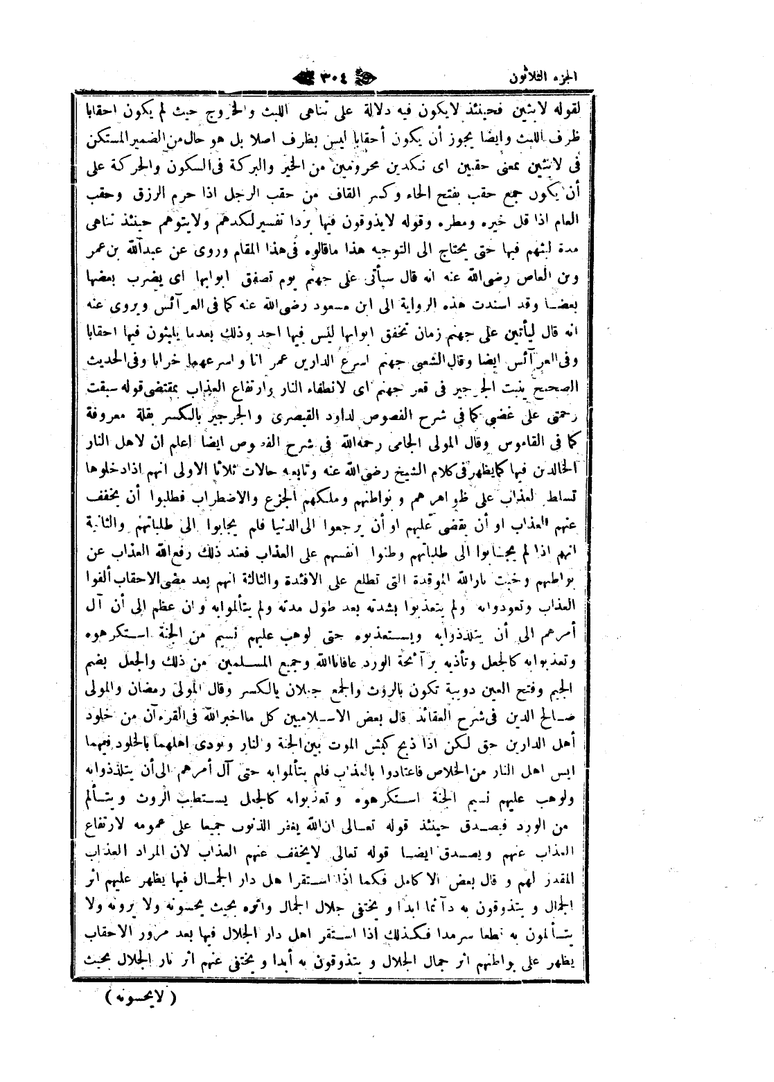 لقوله لابثين فحينئذ لا يكون فيه دلالة على تناهى اللبث والخروج حيث لم يكون أحقابا ظرف اللبث وايضا يجوز أن يكون أحقابا ليس بظرف أصلا بل هو حال من الضمير المستكن فى لابثين بمعنى حقين اى نكدين محرومين من الخير والبركة فى السكون والحركة على أن يكون جمع حقب بفتح الحاء وكسر القاف من حقب الرجل إذا حرم الرزق وحقب العام إذا قل خيره ومطره وقوله لا يذوقون فيها بردا تفسير لكدهم ولا يتوهم حينئذ تناهى مدة لبثهم فيها حتى يحتاج الى التوجيه هذا ما قالوه فى هذا المقام وروى عن عبد الله بن عمر وبن العاص رضى الله عنه انه قال سيأتى على جهنم يوم تصفق ابوابها اى يضرب بعضها بعضا وقد أسندت هذه الرواية الى ابن مسعود رضى الله عنه كما فى العرائس ويروى عنه انه قال ليأتين على جهنم زمان تخفق ابوابها ليس فيها أحد وذلك بعد ما يلبثون فيها أحقابا وفى العرائس ايضا وقال الشعبي جهنم اسرع الدارين عمر انا واسرعهما خرابا وفى الحديث الصحيح ينبت الجرجير فى قعر جهنم اى لانطفاء النار وارتفاع العذاب بمقتضى قوله سبقت رحمتى على غضبى كما فى شرح الفصوص لداود القيصري والجرجير بالكسر بقلة معروفة كما فى القاموس وقال المولى الجامى رحمه الله فى شرح الفصوص ايضا اعلم ان لاهل النار الخالدين فيها كما يظهر فى كلام الشيخ رضى الله عنه وتابعيه حالات ثلاثا الاولى انهم إذا دخلوها تسلط لعذاب على ظواهرهم وبواطنهم وملكهم الجزع والاضطراب فطلبوا أن يخفف عنهم العذاب او