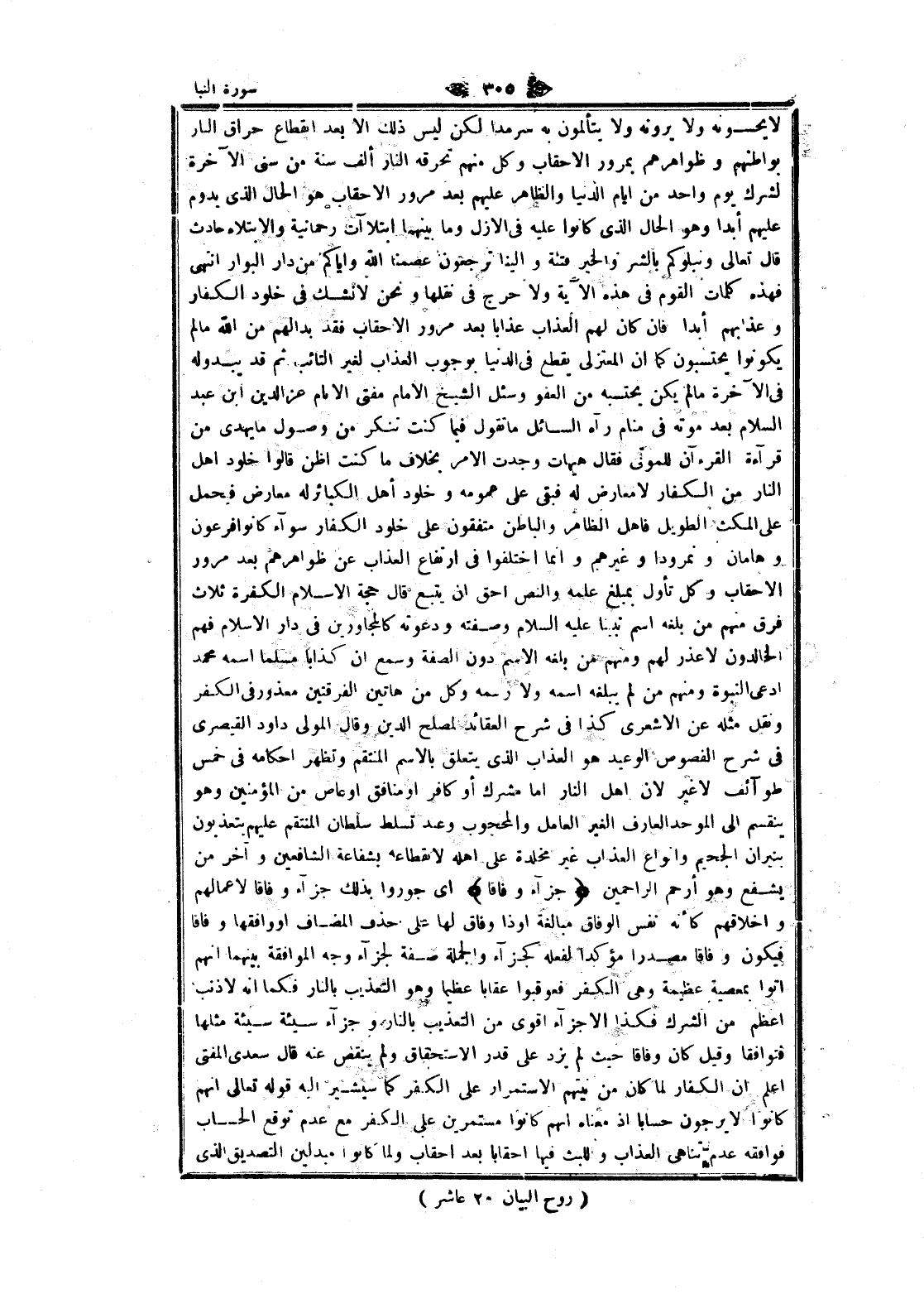 لا يحسونه ولا يرونه ولا يتألمون به سرمدا لكن ليس ذلك الا بعد انقطاع حراق النار بواطنهم وظواهرهم بمرور الاحقاب وكل منهم تحرقه النار ألف سنة من سنى الآخرة لشرك يوم واحد من ايام الدنيا والظاهر عليهم بعد مرور الاحقاب هو الحال الذي يدوم عليهم أبدا وهو الحال الذي كانوا عليه فى الأزل وما بينهما ابتلاءات رحمانية والابتلاء حادث قال تعالى ونبلوكم بالشر والخير فتنة وإلينا ترجعون عصمنا الله وإياكم من دار البوار انتهى فهذه كلمات القوم فى هذه الآية ولا حرج فى نقلها ونحن لا نشك فى خلود الكفار وعذابهم أبدا فان كان لهم العذاب عذابا بعد مرور الاحقاب فقد بدا لهم من الله ما لم يكونوا يحتسبون كما ان المعتزلي يقطع فى الدنيا بوجوب العذاب لغير التائب ثم قد يبدو له فى الآخرة ما لم يكن يحتسبه من العفو وسئل الشيخ الامام مفتى الامام عز الدين ابن عبد السلام بعد موته فى منام رآه السائل ما تقول فيما كنت تنكر من وصول ما يهدى من قراءة القرآن للموتى فقال هيهات وجدت الأمر بخلاف ما كنت أظن قالوا خلود اهل النار من الكفار لا معارض له فبقى على عمومه وخلود أهل الكبائر له معارض فيحمل على المكث الطويل فاهل الظاهر والباطن متفقون على خلود الكفار سوآء كانوا فرعون وهامان ونمرودا وغيرهم وانما اختلفوا فى ارتفاع العذاب عن ظواهرهم بعد مرور الاحقاب وكل تأول بمبلغ علمه والنص أحق ان يتبع قال حجة الإسلام الكفرة ثلاث فرق منهم من بلغه اسم تبينا عليه السلام وصفته ودعوته كالمجاورين فى دار الإسلام فهم الخالدون لا عذر لهم ومنهم من بلغه الاسم دون الصفة وسمع ان كذابا مسلما اسمه محمد ادعى النبوة ومنهم من لم يبلغه اسمه ولا رسمه وكل من هاتين الفرقتين معذور فى الكفر ونقل مثله عن الأشعري كذا فى شرح العقائد لمصلح الدين وقال المولى داود القيصري فى شرح الفصوص الوعيد هو العذاب الذي يتعلق بالاسم المنتقم وتظهر أحكامه فى خمس طوائف لا غير لان اهل النار اما مشرك أو كافر او منافق او عاص من المؤمنين وهو ينقسم الى الموحد العارف الغير العامل والمحجوب وعند تسلط سلطان المنتقم عليهم يتعذبون بنيران الجحيم وانواع العذاب غير مخلدة على اهله لانقطاعه بشفاعة الشافعين وآخر من يشفع وهو أرحم الراحمين جَزاءً وِفاقاً اى جوروا بذلك جزاء وفاقا لاعمالهم واخلاقهم كأنه نفس الوفاق مبالغة او ذا وفاق لها على حذف المضاف او وافقها وفاقا فيكون وفاقا مصدرا مؤكدا لفعله كجزآء والجملة صفة لجزآء وجه الموافقة بينهما انهم أتوا بمعصية عظيمة وهى الكفر فعوقبوا عقابا عظيما وهو التعذيب بالنار فكما انه لا ذنب أعظم من الشرك فكذا الاجزاء أقوى من التعذيب بالنار وجزاء سيئة سيئة مثلها فتوافقا وقيل كان وفاقا حيث لم يزد على قدر الاستحقاق ولم ينقص عنه قال سعدى المفتى اعلم ان الكفار لما كان من نيتهم الاستمرار على الكفر كما سيشير اليه قوله تعالى انهم كانوا لا يرجون حسابا إذ معناه انهم كانوا مستمرين على الكفر مع عدم توقع الحساب فوافقه عدم تناهى العذاب واللبث فيها أحقابا بعد احقاب ولما كانوا مبدلين التصديق الذي