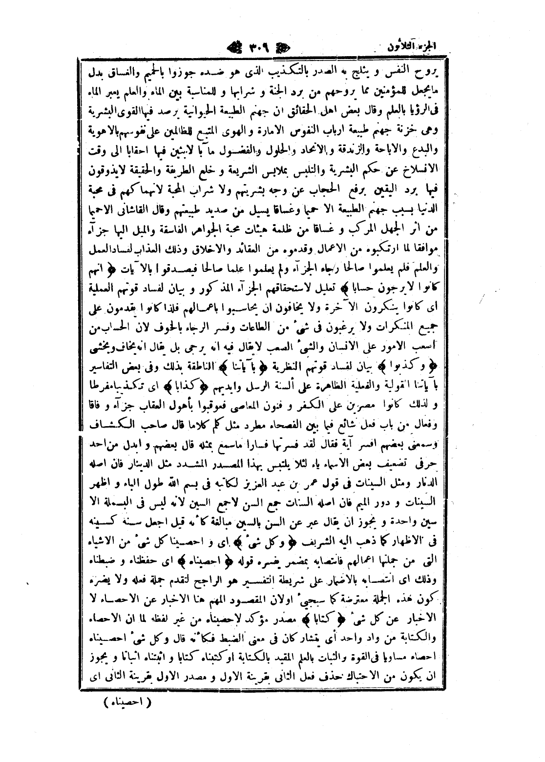 يروح النفس ويثلج به الصدر بالتكذيب الذي هو ضده جوزوا بالحميم والغساق بدل ما يجعل للمؤمنين مما يروحهم من برد الجنة وشرابها وللمناسبة بين الماء والعلم يعبر الماء فى الرؤيا بالعلم وقال بعض اهل الحقائق ان جهنم الطبيعة الحيوانية يرصد فيها القوى البشرية وهى خزنة جهنم طبيعة ارباب النفوس الامارة والهوى المتبع للظالمين على نفوسهم بالاهوية والبدع والإباحة والزندقة والاتحاد والحلول والفضول مآبا لابثين فيها أحقابا الى وقت الانسلاخ عن حكم البشرية والتلبس بملابس الشريعة وخلع الطريقة والحقيقة لا يذوقون فيها برد اليقين برفع الحجاب عن وجه بشريتهم ولا شراب المحبة لانهما كهم فى محبة الدنيا بسبب جهنم الطبيعة الا حميما وغساقا يسيل من صديد طبيعتهم وقال القاشاني الا حميما من اثر الجهل المركب وغساقا من ظلمة هيئات محبة الجواهر الفاسقة والميل إليها جزاء موافقا لما ارتكبوه من الأعمال وقدموه من العقائد والأخلاق وذلك العذاب لفساد العمل والعلم فلم يعلموا صالحا رجاء الجزاء ولم يعلموا علما صالحا فيصدقوا بالآيات إِنَّهُمْ كانُوا لا يَرْجُونَ حِساباً تعليل لاستحقاقهم الجزاء المذكور وبيان لفساد قوتهم العملية اى كانوا ينكرون الآخرة ولا يخافون ان يحاسبوا بأعمالهم فلذا كانوا يقدمون على جميع المنكرات ولا يرغبون فى شىء من الطاعات وفسر الرجاء بالخوف لان الحساب من أصعب الأمور على الإنسان والشيء الصعب لا يقال فيه انه يرجى بل يقال انه يخاف ويخشى وَكَذَّبُوا بيان لفساد قوتهم النظرية بِآياتِنا الناطقة بذلك وفى بعض التفاسير بآياتنا القولية والفعلية الظاهرة على ألسنة الرسل وأيديهم كِذَّاباً اى تكذيبا مفرطا ولذلك كانوا مصرين على الكفر وفنون المعاصي فعوقبوا بأهول العقاب جزاء وفاقا وفعال من باب فعل شائع فيما بين الفصحاء مطرد مثل كلم كلاما قال صاحب الكشاف وسمعنى بعضهم أفسر آية فقال لقد فسرتها فسارا ما سمع بمثله قال بعضهم وأبدل من أحد حرفى تضعيف بعض الأسماء ياء لئلا يلتبس بهذا المصدر المشدد مثل الدينار فان أصله الدنار ومثل السينات فى قول عمر بن عبد العزيز لكاتبه فى بسم الله طول الباء واظهر السينات ودور الميم فان أصله السنات جمع السن لاجمع السين لانه ليس فى البسملة الا سين واحدة ويجوز ان يقال عبر عن السن بالسين مبالغة كأنه قيل اجعل سنة كسينه فى الإظهار كما ذهب اليه الشريف وَكُلَّ شَيْءٍ اى وأحصينا كل شىء من الأشياء التي من جملتها أعمالهم فانتصابه بمضمر يفسره قوله أَحْصَيْناهُ اى حفظناه وضبطناه وذلك اى انتصابه بالاضمار على شريطة التفسير هو الراجح لتقدم جملة فعله ولا يضره كون هذه الجملة معترضة كما سيجيئ او لان المقصود المهم هنا الاخبار عن الإحصاء لا الاخبار عن كل شىء كِتاباً مصدر مؤكد لاحصيناه من غير لفظه لما ان الإحصاء والكتابة من واد واحد أي يتشار كان فى معنى الضبط فكأنه قال وكل شىء أحصيناه إحصاء مساويا فى القوة والثبات بالعلم المقيد بالكتابة او كتبناه كتابا وأثبتناه اثباتا ويجوز ان يكون من الاحتباك حذف فعل الثاني بقرينة الاول ومصدر الاول بقرينة الثاني اى
