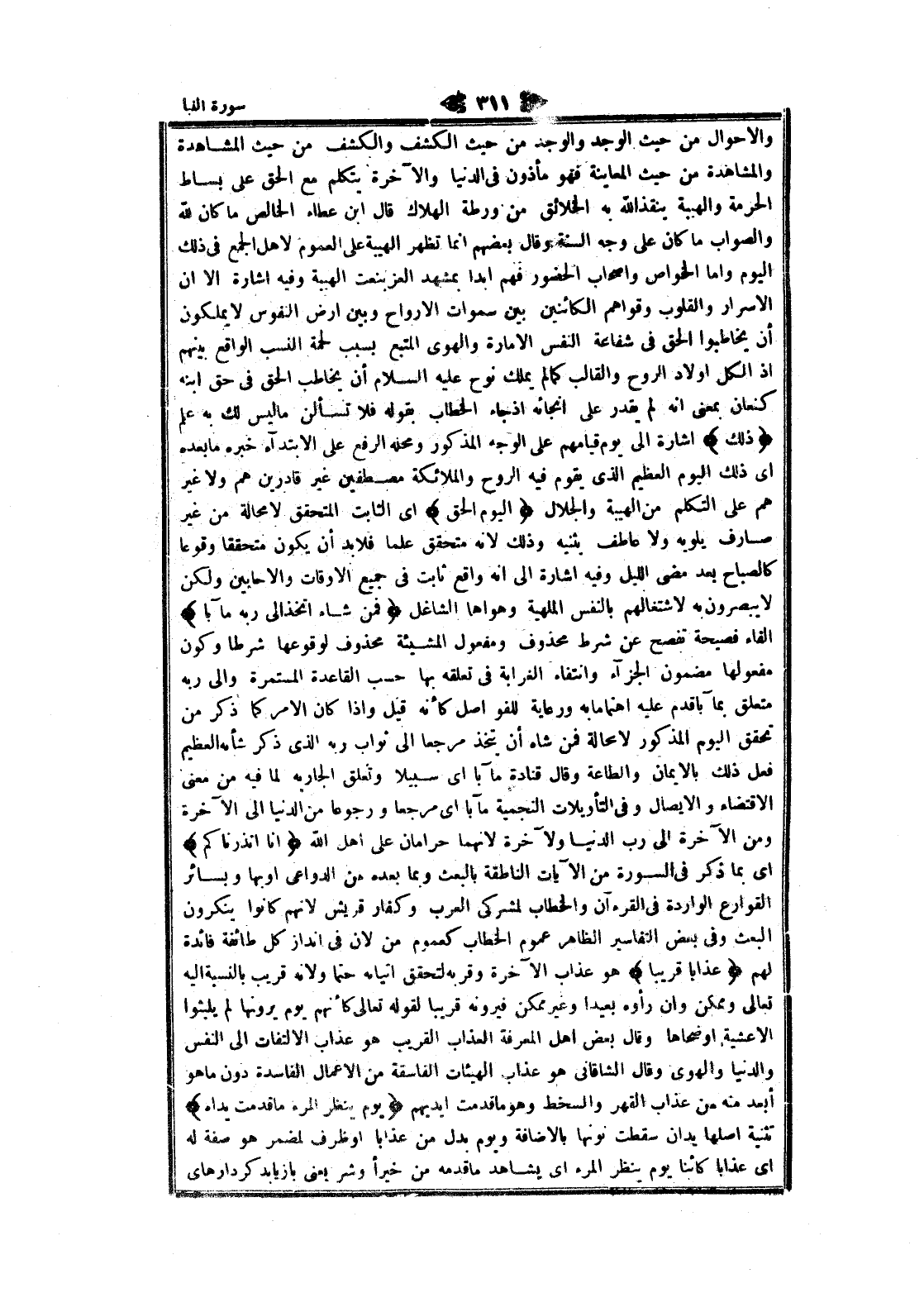 والأحوال من حيث الوجد والوجد من حيث الكشف والكشف من حيث المشاهدة والمشاهدة من حيث المعاينة فهو مأذون فى الدنيا والآخرة يتكلم مع الحق على بساط الحرمة والهيبة ينقذ الله به الخلائق من ورطة الهلاك قال ابن عطاء الخالص ما كان لله والصواب ما كان على وجه السنة وقال بعضهم انما تظهر الهيبة على العموم لاهل الجمع فى ذلك اليوم واما الخواص واصحاب الحضور فهم ابدا بمشهد العز بنعت الهيبة وفيه اشارة الا ان الاسرار والقلوب وقواهم الكائنين بين سموات الأرواح وبين ارض النفوس لا يملكون أن يخاطبوا الحق فى شفاعة النفس الامارة والهوى المتبع بسبب لحمة النسب الواقع بينهم إذ الكل أولاد الروح والقالب كما لم يملك نوح عليه السلام أن يخاطب الحق فى حق ابنه كنعان بمعنى انه لم يقدر على انجائه إذ جاء الخطاب بقوله فلا تسألن ما ليس لك به علم ذلِكَ اشارة الى يوم قيامهم على الوجه المذكور ومحله الرفع على الابتداء خبره ما بعده اى ذلك اليوم العظيم الذي يقوم فيه الروح والملائكة مصطفين غير قادرين هم ولا غير هم على التكلم من الهيبة والجلال الْيَوْمُ الْحَقُّ اى الثابت المتحقق لا محالة من غير صارف يلويه ولا عاطف يثنيه وذلك لانه متحقق علما فلا بد أن يكون متحققا وقوعا كالصباح بعد مضى الليل وفيه اشارة الى انه واقع ثابت فى جميع الأوقات والأحايين ولكن لا يبصرون به لاشتغالهم بالنفس الملهية وهواها الشاغل فَمَنْ شاءَ اتَّخَذَ إِلى رَبِّهِ مَآباً الفاء فصيحة تفصح عن شرط محذوف ومفعول المشيئة محذوف لوقوعها شرطا وكون مفعولها مضمون الجزاء وانتفاء الغرابة فى تعلقه بها حسب القاعدة المستمرة والى ربه متعلق بمآبا قدم عليه اهتماما به ورعاية للفواصل كأنه قيل وإذا كان الأمر كما ذكر من تحقق اليوم المذكور لا محالة فمن شاه أن يتخذ مرجعا الى ثواب ربه الذي ذكر شأنه العظيم فعل ذلك بالايمان والطاعة وقال قتادة مآبا اى سبيلا وتعلق الجاريه لما فيه من معنى الاقتضاء والإيصال وفى التأويلات النجمية مآبا اى مرجعا ورجوعا من الدنيا الى الآخرة ومن الآخرة الى رب الدنيا ولآخرة لانهما حرامان على اهل الله نَّا أَنْذَرْناكُمْ