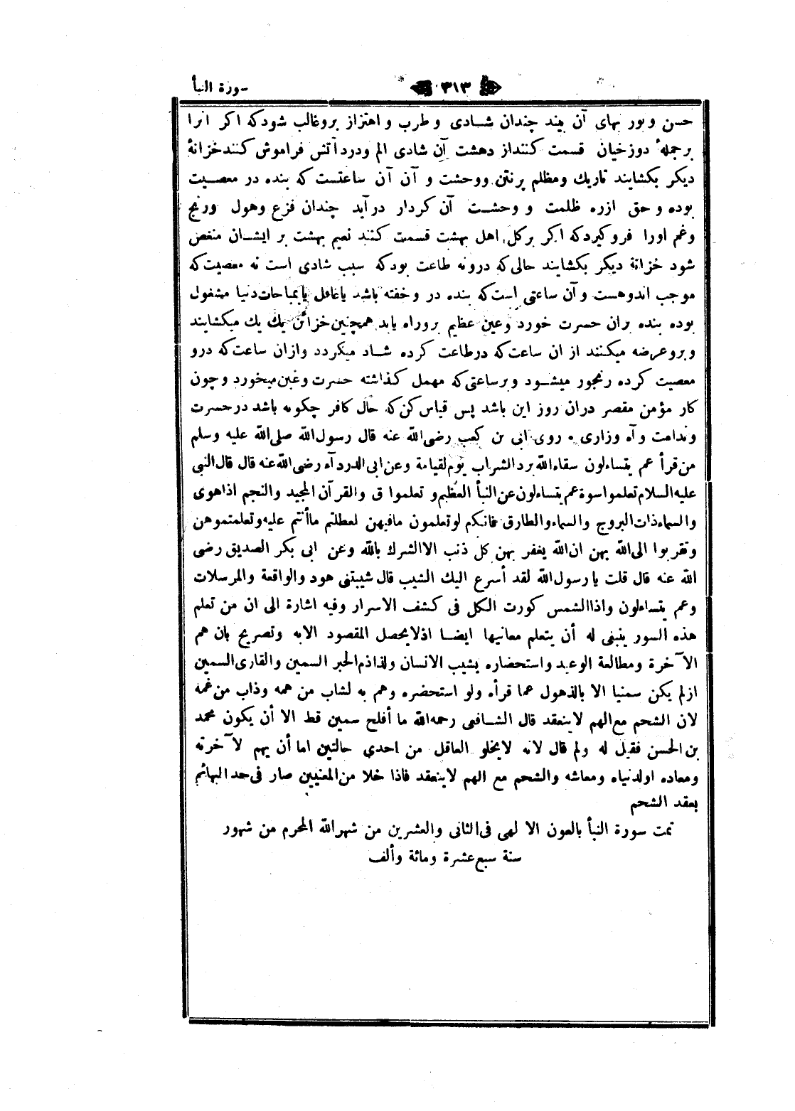 حسن ونور بهاى آن بيند چندان شادى وطرب واهتزاز برو غالب شود كه اگر انرا بر جمله دوزخيان قسمت كنند از دهشت آن شادى الم ودرد آتش فراموش كنند خزانه ديكر بگشايند تاريك ومظلم پر نتن ووحشت وآن آن ساعتست كه بنده در معصيت بوده وحق از ره ظلمت ووحشت آن كردار در آيد چندان فزع وهول ورنج وغم او را فرو كيرد كه اگر بر كل اهل بهشت قسمت كنند نعيم بهشت بر ايشان منغص شود خزانة ديكر بگشايند حالى كه درو نه طاعت بود كه سبب شادى است نه معصيت كه موجب اندوهست وآن ساعتى است كه بنده درو خفته باشد يا غافل يا بمباحات دنيا مشغول بوده بنده بر آن حسرت خورد وعين عظيم برو راه يابد همچنين خزائن يك يك ميكشايند وبرو عرضه ميكنند از ان ساعت كه در طاعت كرده شاد ميكردد واز آن ساعت كه درو معصيت كرده رنجور ميشود وبر ساعتى كه مهمل كذاشته حسرت وغبن ميخورد و چون كار مؤمن مقصر در ان روز اين باشد پس قياس كن كه حال كافر چكونه باشد در حسرت وندامت وآه وزارى. روى ابى بن كعب رضى الله عنه قال رسول الله صلى الله عليه وسلم من قرأ عم يتساءلون سقاء الله برد الشراب يوم لقيامة وعن ابى الدرداء رضى الله عنه قال قال النبي عليه السلام تعلموا سوة عم يتساءلون عن النبأ العظيم وتعلموا ق والقرآن المجيد والنجم إذا هوى والسماء ذات البروج والسماء والطارق فانكم لو تعلمون ما فيهن لعطلتم ما أنتم عليه وتعلمتموهن وتقربوا الى الله بهن ان الله يغفر بهن كل ذنب الا الشرك بالله وعن ابى بكر الصديق رضى الله عنه قال قلت يا رسول الله لقد أسرع إليك الشيب قال شيبتنى هود والواقعة والمرسلات وعم يتساءلون وإذا الشمس كورت الكل فى كشف الاسرار وفيه اشارة الى ان من تعلم هذه السور ينبغى له أن يتعلم معانيها ايضا إذ لا يحصل المقصود الا به وتصريح بان هم الآخرة ومطالعة الوعيد واستحضاره يشيب الإنسان ولذا ذم الحبر السمين والقاري السمين از لم يكن سمينا الا بالذهول عما قرأه ولو استحضره وهم به لشاب من همه وذاب من غمه لان الشحم مع الهم لا ينعقد قال الشافعي رحمه الله ما أفلح سمين قط الا أن يكون محمد بن الحسن فقيل له ولم قال لانه لا يخلو العاقل من احدى حالتين اما أن يهم لآخرته ومعاده او لدنياه ومعاشه والشحم مع الهم لا ينعقد فاذا خلا من المعنيين صار فى حد البهائم بعقد الشحم تمت سورة النبأ بالعون الإلهي فى الثاني والعشرين من شهر الله المحرم من شهور سنة سبع عشرة ومائة وألف