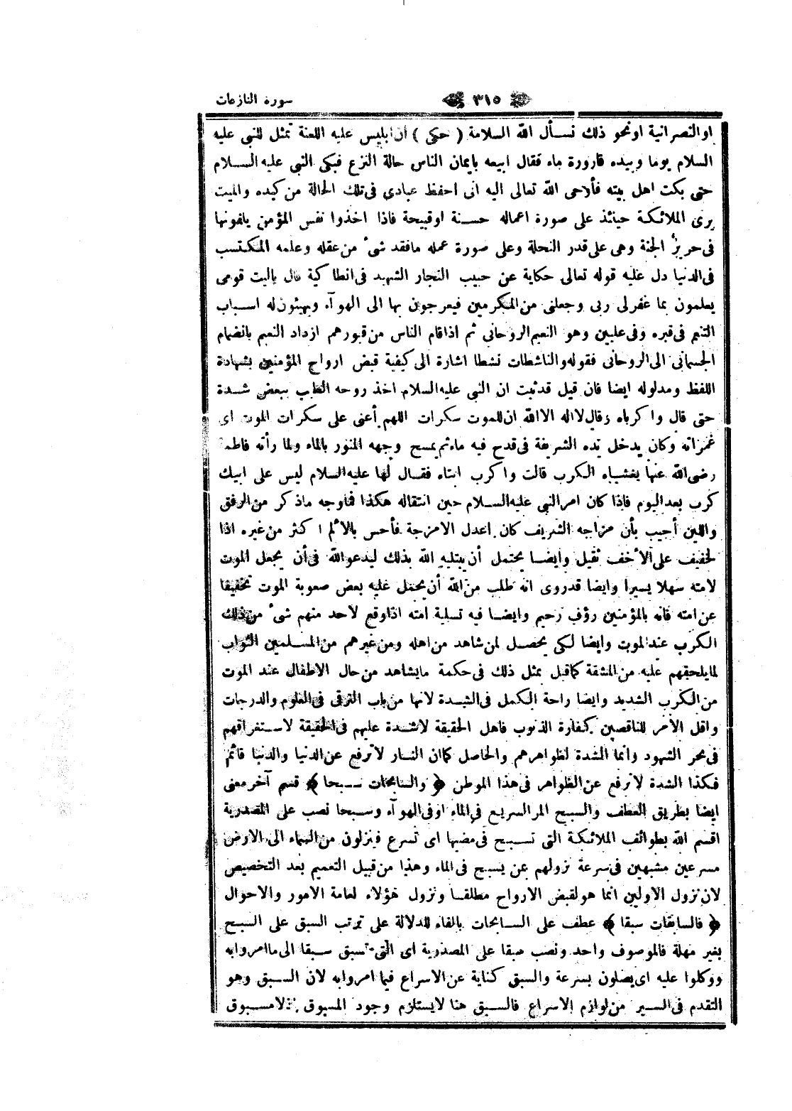 او النصرانية او نحو ذلك نسأل الله السلامة (حكى) ان إبليس عليه اللعنة تمثل للنبى عليه السلام يوما وبيده قارورة ماء فقال أبيعه بايمان الناس حالة النزع فبكى النبي عليه السلام حتى بكت اهل بيته فأوحى الله تعالى اليه انى احفظ عبادى فى تلك الحالة من كيده والميت يرى الملائكة حينئذ على صورة اعماله حسنة او قبيحة فاذا أخذوا نفس المؤمن يلفونها فى حرير الجنة وهى على قدر النحلة وعلى صورة عمله ما فقد شىء من عقله وعلمه المكتسب فى الدنيا دل عليه قوله تعالى حكاية عن حبيب النجار الشهيد فى انطاكية قال يا ليت قومى يعلمون بما غفر لى ربى وجعلنى من المكرمين فيعرجون بها الى الهولء ويهيئون له اسباب التنعم فى قبره وفى عليين وهو النعيم الروحاني ثم إذا قام الناس من قبورهم ازداد النعيم بانضمام الجسماني الى الروحاني فقوله والناشطات نشطا اشارة الى كيفية قبض أرواح المؤمنين بشهادة اللفظ ومدلوله ايضا فان قيل قد ثبت ان النبي عليه السلام أخذ روحه الطيب ببعض شدة حتى قال واكرباه وقال لا اله الا الله ان للموت سكرات اللهم أعنى على سكرات الموت اى غمزاته وكان يدخل يده الشريفة فى قدح فيه ماء ثم يمسح وجهه المنور بالماء ولما رأته فاطمة رضى الله عنها يغشاه الكرب قالت وا كرب أبتاه فقال لها عليه السلام ليس على أبيك كرب بعد اليوم فاذا كان امر النبي عليه السلام حين انتقاله هكذا فما وجه ما ذكر من الرفق واللين أجيب بأن مزاجه الشريف كان اعدل الامزجة فأحس بالألم اكثر من غيره إذا لخفيف على الأخف ثقيل وايضا يحتمل أن يبتليه الله بذلك ليدعو الله فى أن يجعل الموت لامته سهلا يسيرا وايضا قد روى انه طلب من الله أن يحمل عليه بعض صعوبة الموت تخفيفا عن أمته فانه بالمؤمنين رؤف رحيم وايضا فيه تسلية أمته إذا وقع لاحد منهم شىء من ذلك الكرب عند الموت وايضا لكى يحصل لمن شاهد من اهله ومن غيرهم من المسلمين الثواب لما يلحقهم عليه من المشقة كما قيل بمثل ذلك فى حكمة ما يشاهد من حال الأطفال عند الموت من الكرب الشديد وايضا راحة الكمل فى الشدة لانها من باب الترقي فى العلوم والدرجات واقل الأمر للناقصين كفارة الذنوب فاهل الحقيقة لا شدة عليهم فى الحقيقة لاستغراقهم فى بحر الشهود وانما الشدة لظواهرهم والحاصل كما ان النار لا ترفع عن الدنيا والدنيا قائم فكذا الشدة لا ترفع عن الظواهر فى هذا الموطن وَالسَّابِحاتِ سَبْحاً قسم آخر معنى ايضا بطريق العطف والسبح المر السريع فى الماء او فى الهولء وسبحا نصب على المصدرية اقسم الله بطوائف الملائكة التي تسبح فى مضيها اى تسرع فينزلون من السماء الى الأرض مسرعين مشبهين فى سرعة نزولهم بمن يسبح فى الماء وهذا من قبيل التعميم بعد التخصيص لان نزول الأولين انما هو لقبض الأرواح مطلقا ونزول هؤلاء لعامة الأمور والأحوال فَالسَّابِقاتِ سَبْقاً عطف على السابحات بالفاء للدلالة على ترتب السبق على السبح بغير مهلة فالموصوف واحد ونصب سبقا على المصدرية اى التي تسبق سبقا الى ما أمروا به ووكلوا عليه اى يصلون بسرعة والسبق كناية عن الاسراع فيما أمروا به لان السبق وهو التقدم فى السير من لوازم الاسراع فالسبق هنا لا يستلزم وجود المسبوق إذ لا مسبوق