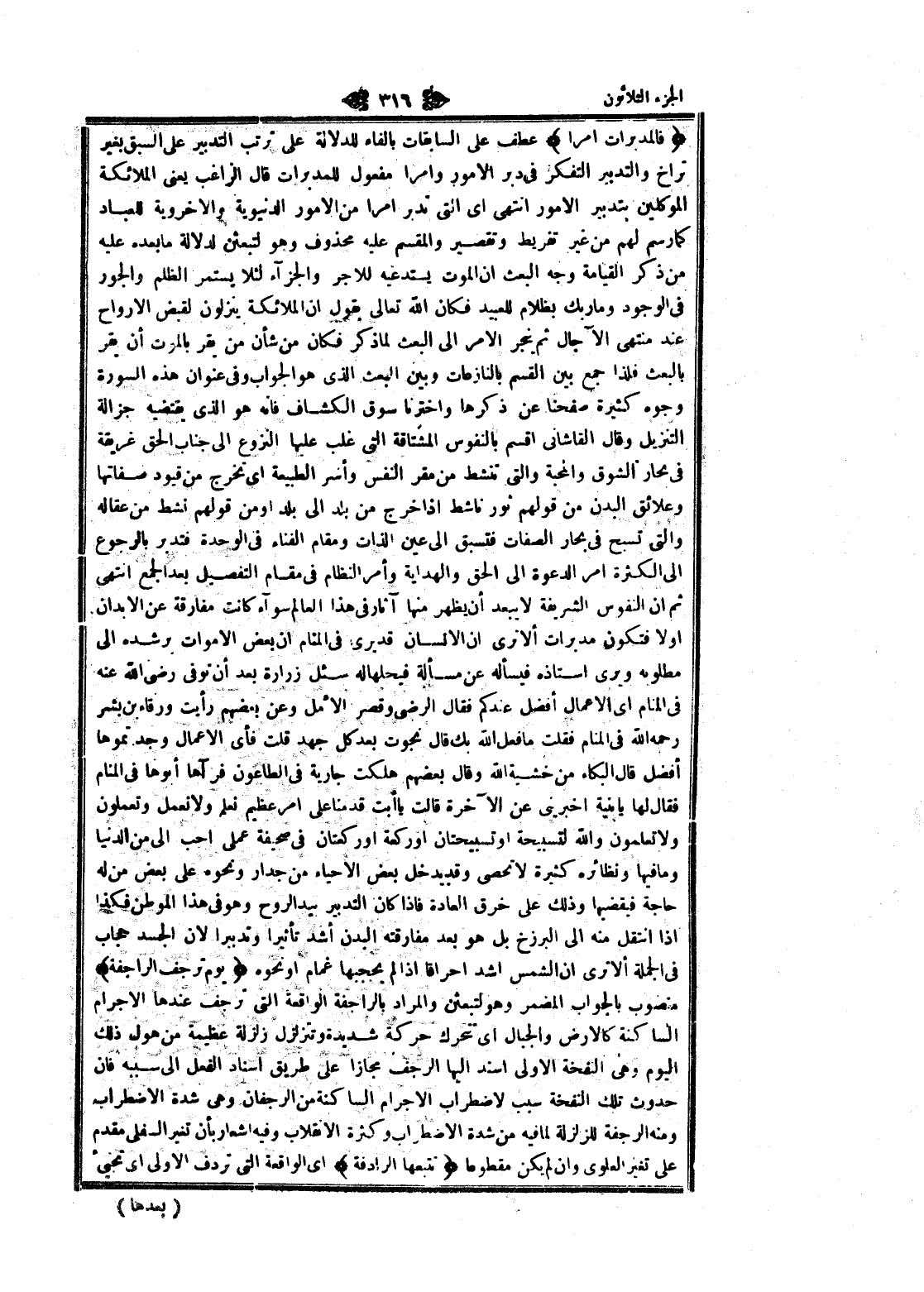 فَالْمُدَبِّراتِ أَمْراً عطف على السابقات بالفاء للدلالة على ترتب التدبير على السبق بغير تراخ والتدبير التفكر فى دبر الأمور وامرا مفعول للمدبرات قال الراغب يعنى الملائكة الموكلين بتدبير الأمور انتهى اى التي تدبر امرا من الأمور الدنيوية والاخروية للعباد كما رسم لهم من غير تفريط وتقصير والمقسم عليه محذوف وهو لتبعثن لدلالة ما بعده عليه من ذكر القيامة وجه البعث ان الموت يستدعيه للاجر والجزاء لئلا يستمر الظلم والجور فى الوجود وما ربك بظلام للعبيد فكان الله تعالى يقول ان الملائكة ينزلون لقبض الأرواح عند منتهى الآجال ثم ينجر الأمر الى البعث لما ذكر فكان من شأن من يقر بالموت أن يقر بالبعث فلذا جمع بين القسم بالنازعات وبين البعث الذي هو الجواب وفى عنوان هذه السورة وجوه كثيرة صفحنا عن ذكرها واخترنا سوق الكشاف فانه هو الذي يقتضيه جزالة التنزيل وقال القاشاني اقسم بالنفوس المشتاقة التي غلب عليها النزوع الى جناب الحق غريقة فى بحار الشوق والمحبة والتي تنشط من مقر النفس وأسر الطبيعة اى تخرج من قيود صفاتها وعلائق البدن من قولهم نور ناشط إذا خرج من بلد الى بلد او من قولهم نشط من عقاله والتي تسبح فى بحار الصفات فتسبق الى عين الذات ومقام الفناء فى الوحدة فتدبر بالرجوع الى الكثرة امر الدعوة الى الحق والهداية وأمر النظام فى مقام التفصيل بعد الجمع انتهى ثم ان النفوس الشريفة لا يبعد أن يظهر منها آثار فى هذا العالم سوآء كانت مفارقة عن الأبدان او لا فتكون مدبرات ألا ترى ان الإنسان قد يرى فى المنام ان بعض الأموات برشده الى مطلوبه ويرى استاذه فيسأله عن مسألة فيحلها له سئل زرارة بعد أن توفى رضى الله عنه فى المنام اى الأعمال أفضل عندكم فقال الرضى وقصر الأمل وعن بعضهم رأيت ورقاء بن بشر رحمه الله فى المنام فقلت ما فعل الله بك قال نجوت بعد كل جهد قلت فأى الأعمال وجدتموها أفضل قال البكاء من خشية الله وقال بعضهم هلكت جارية فى الطاعون فرآها أبوها فى المنام فقال لها يا بنية أخبريني عن الآخرة قالت يا أبت قدمنا على امر عظيم نعلم ولا نعمل وتعملون ولا تعلمون والله لتسبيحة او تسبيحتان او ركعة او ركعتان فى صحيفة عملى أحب الى من الدنيا وما فيها ونظائره كثيرة لا تحصى وقد يدخل بعض الاحياء من جدار ونحوه على بعض من له حاجة فبقضيها وذلك على خرق العادة فاذا كان التدبير بيد الروح وهو فى هذا الموطن فكذا إذا انتقل منه الى البرزخ بل هو بعد مفارقته البدن أشد تأثيرا وتدبيرا لان الجسد حجاب فى الجملة ألا ترى ان الشمس أشد احراقا إذا لم يحجبها غمام او نحوه يَوْمَ تَرْجُفُ الرَّاجِفَةُ منصوب بالجواب المضمر وهو لتبعثن والمراد بالراجفة الواقعة التي ترجف عندها الاجرام الساكنة كالارض والجبال اى تتحرك حركة شديدة وتتزلزل زلزلة عظيمة من هول ذلك اليوم وهى النفخة الاولى أسند إليها الرجف مجازا على طريق اسناد الفعل الى سببه فان حدوث تلك النفخة سبب لاضطراب الاجرام الساكنة من الرجفان وهى شدة الاضطراب ومنه الرجفة للزلزلة لما فيه من شدة الاضطراب وكثرة الانقلاب وفيه اشعار بأن تغير السفلى مقدم على تغير العلوي وان لم يكن مقطوعا تَتْبَعُهَا الرَّادِفَةُ اى الواقعة التي تردف الاولى اى تجيئ