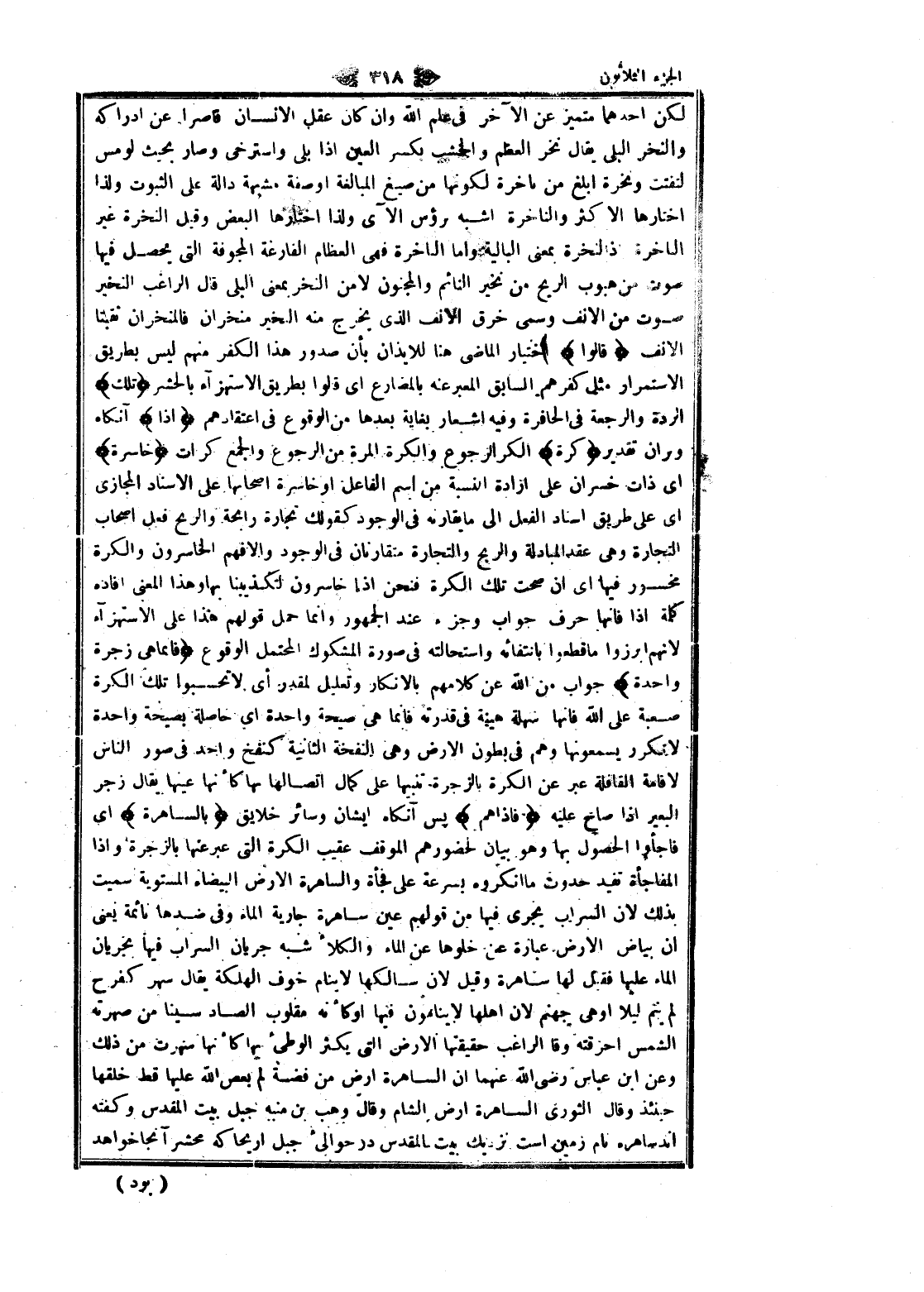 لكن أحدهما متميز عن الآخر فى علم الله وان كان عقل الإنسان قاصرا عن إدراكه والنخر البلى يقال نخر العظم والخشب بكسر العين إذا بلى واسترخى وصار بحيث لومس لتفتت ونخرة ابلغ من ناخرة لكونها من صيغ المبالغة او صفة مشبهة دالة على الثبوت ولذا اختارها الأكثر والناخرة أشبه برؤس الآي ولذا اختارها البعض وقيل النخرة غير الناخرة إذ النخرة بمعنى البالية واما الناخرة فهى العظام الفارغة المجوفة التي يحصل فيها صوت من هبوب الريح من نخير النائم والمجنون لا من النخير بمعنى البلى قال الراغب النخير صوت من الانف وسمى خرق الانف الذي يخرج منه النخير منخران فالمنخران ثقبتا الانف قالُوا اختيار الماضي هنا للايذان بأن صدور هذا الكفر منهم ليس بطريق الاستمرار مثل كفرهم السابق المعبر عنه بالمضارع اى قالوا بطريق الاستهزاء بالحشر تِلْكَ الردة والرجعة فى الحافرة وفيه اشعار بغاية بعدها من الوقوع فى اعتقادهم إِذاً آنگاه وبر ان تقدير كَرَّةٌ الكر الرجوع والكرة المرة من الرجوع والجمع كرات خاسِرَةٌ اى ذات خسران على ارادة النسبة من اسم الفاعل او خاسرة أصحابها على الاسناد المجازى اى على طريق اسناد الفعل الى ما يقارنه فى الوجود كقولك تجارة رابحة والربح فعل اصحاب التجارة وهى عقد المبادلة والريح والتجارة متقارنان فى الوجود والافهم الخاسرون والكرة مخسور فيها اى ان صحت تلك الكرة فنحن إذا خاسرون لتكذيبنا بها وهذا المعنى أفاده كلمة إذا فانها حرف جواب وجزء عند الجمهور وانما حمل قولهم هذا على الاستهزاء لانهم ابرزوا ما قطعوا بانتفائه واستحالته فى صورة المشكوك المحتمل الوقوع فَإِنَّما هِيَ زَجْرَةٌ واحِدَةٌ جواب من الله عن كلامهم بالإنكار وتعليل لمقدر أي لا تحسبوا تلك الكرة صعبة على الله فانها سهلة هينة فى قدرته فانما هى صيحة واحدة اى حاصلة بصيحة واحدة لا تكرر يسمعونها وهم فى بطون الأرض وهى النفخة الثانية كنفخ واحد فى صور الناس لاقامة القافلة عبر عن الكرة بالزجرة تنبيها على كمال اتصالها بها كأنها عينها يقال زجر البعير إذا صاح عليه فَإِذا هُمْ پس آنگاه ايشان وسائر خلايق بِالسَّاهِرَةِ اى فاجأوا الحصول بها وهو بيان لحضورهم الموقف عقيب الكرة التي عبر عنها بالزجرة وإذا المفاجأة تفيد حدوث ما أنكروه بسرعة على فجأة والساهرة الأرض البيضاء المستوية سميت بذلك لان السراب يجرى فيها من قولهم عين ساهرة جارية الماء وفى ضدها نائمة يعنى ان بياض الأرض عبارة عن خلوها عن الماء والكلأ شبه جريان السراب فيها بجريان الماء عليها فقيل لها ساهرة وقيل لان سالكها لا ينام خوف الهلكة يقال سهر كفرح لم ينم ليلا او هى جهنم لان أهلها لا ينامون فيها او كأنه مقلوب الصاد سينا من صهرته الشمس أحرقته وقال الراغب حقيقتها الأرض التي يكثر الوطئ بها كأنها سهرت من ذلك وعن ابن عباس رضى الله عنهما ان الساهرة ارض من فضة لم يعص الله عليها قط خلقها حينئذ وقال الثوري الساهرة ارض الشام وقال وهب بن منبه جبل بيت المقدس وگفته اند ساهره نام زمين است نزديك بيت المقدس در حوالئ جبل أريحا كه محشر آنجا خواهد