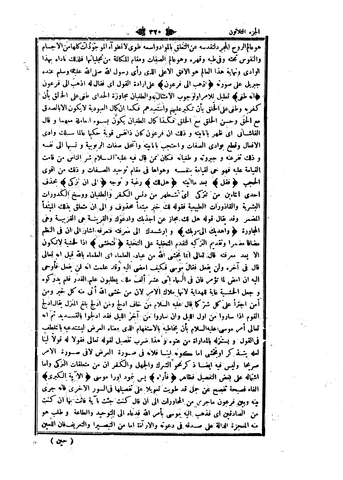 هو عالم الروح المجرد لتقدسه عن التعلق بالمواد واسمه طوى لانطوآء الموجودات كلها من الأجسام والنفوس تحته وفى طبه وقهره وهو عالم الصفات ومقام المكالمة من تجلياتها فلذلك ناداه بهذا الوادي ونهاية هذا العالم هو الأفق الأعلى الذي رأى رسول الله صلى الله عليه وسلم عنده جبريل على صورته اذْهَبْ إِلى فِرْعَوْنَ على ارادة القول اى فقال له اذهب الى فرعون إِنَّهُ طَغى تعليل للامر او لوجوب الامتثال به والطغيان مجاوزة الحد أي طغى على الخالق بأن كفر به وطغى على الخلق بأن تكبر عليهم واستعبدهم فكما ان كمال العبودية لا يكون الا بالصدق مع الحق وحسن الخلق مع الخلق فكذا كمال الطغيان يكون بسوء المعاملة معهما وقال القاشاني اى ظهر بانانيته وذلك ان فرعون كان ذا نفس قوية حكيما عالما سلك وادي الافعال وقطع بوادي الصفات واحتجب بانانيته وانتحل صفات الربوبية ونسبها الى نفسه وذلك تفرعنه وجبروته وطغيانه فكان ممن قال فيه عليه السلام شر الناس من قامت القيامة عليه فهو حى لقيامة بنفسه وهواها فى مقام توحيد الصفات وذلك من أقوى الحجب فَقُلْ بعد ما أتيته هَلْ لَكَ رغبة وتوجه إِلى أَنْ تَزَكَّى بحذف احدى التاءين من تتزكى اى تتطهر من دنس الكفر والطغيان ووسخ الكدورات البشرية والقاذورات الطبيعية فقوله لك خبر مبتدأ محذوف والى ان متعلق بذلك المبتدأ المضمر وقد يقال قوله هل لك مجاز عن اجذبك وأدعوك والقرينة هى القربية وهى المجاورة وَأَهْدِيَكَ إِلى رَبِّكَ وأرشدك الى معرفته فتعرفه أشار الى ان فى النظم مضافا مضمرا وتقديم التزكية لتقدم التخلية على التحلية فَتَخْشى إذا لخشية لا تكون الا بعد معرفته قال تعالى انما يخشى الله من عباده العلماء اى العلماء بالله قيل انه تعالى قال فى آخره ولن يفعل فقال موسى فكيف امضى اليه وقد علمت انه لن يفعل فأوحى اليه ان امض لما تؤمر فان فى السماء اثنى عشر ألف ملك يطلبون علم القدر فلم يدركوه وجعل الخشية غاية للهداية لانها ملاك الأمر لان من خشى الله أتى منه كل خير ومن أمن اجترأ على كل شر كما قال عليه السلام من خاف ادلج ومن ادلج بلغ المنزل يقال ادلج القوم إذا ساروا من أول الليل وان ساروا من آخر الليل فقد ادلجوا بالتسديد ثم انه تعالى أمر موسى عليه السلام بأن يخاطبه بالاستفهام الذي معناه العرض ليشتدعيه بالتلطف فى القول ويستنزله بالمداراة من عتوه وهذا ضرب تفصيل لقوله تعالى فقولا له قولا لينا لعله يتذكر او بخشى اما كونه لينا فلانه فى صورة العرض لا فى صورة الأمر صريحا وليس فيه ايضا ذكر نحو الشرك والجهل والكفران من متعلقات التزكى واما اشتماله على بعض التفصيل فظاهر فَأَراهُ پس بنمود او را موسى الْآيَةَ الْكُبْرى الفاء فصيحة تفصح عن جمل قد طويت تعويلا على تفصيلها فى السور الاخرى فانه جرى بينه وبين فرعون ما جرى من المحاورات الى ان قال كنت جئت بآية فائت بها ان كنت من الصادقين اى فذهب اليه موسى بأمر الله فدعاه الى التوحيد والطاعة وطلب هو منه المعجزة الدالة على صدقه فى دعوته والإراءة اما من التبصير أو التعريف فان اللعين