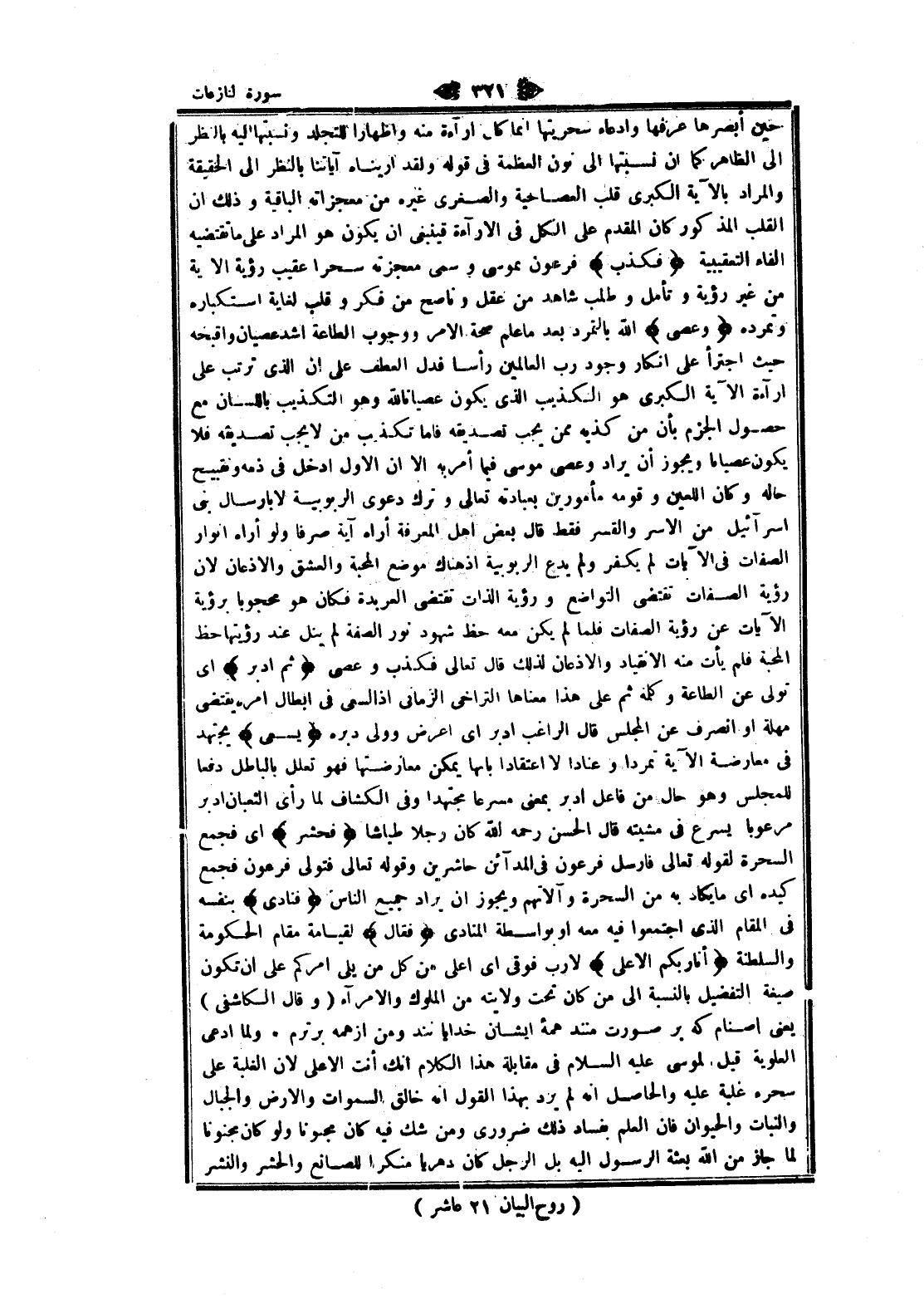 حين أبصرها عرفها وادعاء سحريتها انما كل إراءة منه وإظهارا للتجلد ونسبتها اليه بالنظر الى الظاهر كما ان نسبتها الى نون العظمة فى قوله ولقد أريناه آياتنا بالنظر الى الحقيقة والمراد بالآية الكبرى قلب العصا حية والصغرى غيره من معجزاته الباقية وذلك ان القلب المذكور كان المقدم على الكل فى الإراءة قينبغى ان يكون هو المراد على ما تقتضيه الفاء التعقيبية فَكَذَّبَ فرعون بموسى وسمى معجزته سحرا عقيب رؤية الاية من غير رؤية وتأمل وطلب شاهد من عقل وناصح من فكر وقلب لغاية استكباره وتمرده وَعَصى الله بالتمرد بعد ما علم صحة الأمر ووجوب الطاعة أشد عصيان واقبحه حيث اجترأ على انكار وجود رب العالمين رأسا فدل العطف على ان الذي ترتب على إراءة الآية الكبرى هو التكذيب الذي يكون عصيانا لله وهو التكذيب باللسان مع حصول الجزم بأن من كذبه ممن يجب تصديقه فاما تكذيب من لا يجب تصديقه فلا يكون عصيانا ويجوز أن يراد وعصى موسى فيما أمر به الا ان الاول ادخل فى ذمه ونقبيح حاله وكان اللعين وقومه مأمورين بعبادته تعالى وترك دعوى الربوبية لا بإرسال بنى إسرائيل من الاسر والقسر فقط قال بعض اهل المعرفة أراه آية صرفا ولو أراه أنوار الصفات فى الآيات لم يكفر ولم يدع الربوبية إذ هناك موضع المحبة والعشق والإذعان لان رؤية الصفات تقتضى التواضع ورؤية الذات تقتضى العربدة فكان هو محجوبا برؤية الآيات عن رؤية الصفات فلما لم يكن معه حظ شهود نور الصفة لم ينل عند رؤيتها حظ المحبة فلم يأت منه الانقياد والإذعان لذلك قال تعالى فكذب وعصى ثُمَّ أَدْبَرَ اى تولى عن الطاعة وكلمه ثم على هذا معناها التراخي الزمانى إذ السعى فى ابطال امره يقتضى مهلة او انصرف عن المجلس قال الراغب أدبر اى اعرض وولى دبره يَسْعى يجتهد فى معارضة الآية تمردا وعنادا لا اعتقادا بانها يمكن معارضتها فهو تعلل بالباطل دفعا للمجلس وهو حال من فاعل أدبر بمعنى مسرعا مجتهدا وفى الكشاف لما رأى الثعبان أدبر مرعوبا يسرع فى مشيته قال الحسن رحمه الله كان رجلا طياشا فَحَشَرَ اى فجمع السحرة لقوله تعالى فارسل فرعون فى المدائن حاشرين وقوله تعالى فتولى فرعون فجمع كيده اى ما يكاد به من السحرة وآلاتهم ويجوز ان يراد جميع الناس فَنادى بنفسه فى المقام الذي اجتمعوا فيه معه او بواسطة المنادى فَقالَ لقيامة مقام الحكومة والسلطنة أَنَا رَبُّكُمُ الْأَعْلى لا رب فوقى اى أعلى من كل من يلى أمركم على ان تكون صيغة التفضيل بالنسبة الى من كان تحت ولايته من الملوك والأمراء (وقال الكاشفى) يعنى أصنام كه بر صورت منند همه ايشان خدايانند ومن از همه برترم. ولما ادعى العلوية قيل لموسى عليه السلام فى مقابلة هذا الكلام انك أنت الأعلى لان الغلبة على سحره غلبة عليه والحاصل انه لم يرد بهذا القول انه خالق السموات والأرض والجبال والنبات والحيوان فان العلم بفساد ذلك ضرورى ومن شك فيه كان مجنونا ولو كان مجنونا لما جاز من الله بعثة الرسول اليه بل الرجل كان دهريا منكرا للصانع والحشر والنشر