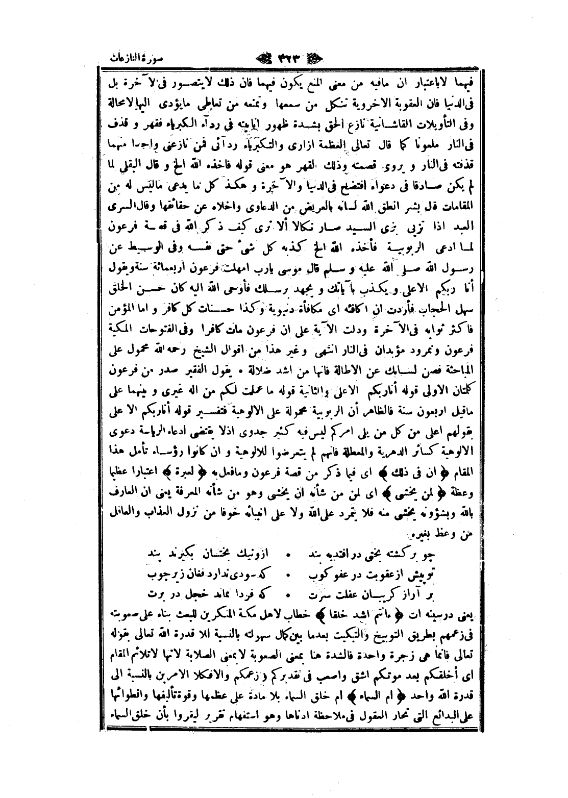فيهما لا باعتبار ان ما فيه من معنى المنع يكون فيهما فان ذلك لا يتصور فى الآخرة بل فى الدنيا فان العقوبة الاخروية تنكل من سمعها وتمنعه من تعاطى ما يؤدى إليها لا محالة وفى التأويلات القاشانية نازع الحق بشدة ظهور انانيته فى ردآء الكبرياء فقهر وقذف فى النار ملعونا كما قال تعالى العظمة إزاري والكبرياء ردآئى فمن نازعنى واحدا منهما قذفته فى النار ويروى قصمته وذلك القهر هو معنى قوله فاخذه الله إلخ وقال البقلى لما لم يكن صادقا فى دعواه افتضح فى الدنيا والآخرة وهكذا كل ما يدعى ما ليس له من المقامات قال بشر انطق الله لسانه بالعريض من الدعاوى وأخلاه عن حقائقها وقال السرى العبد إذا تزيى بزى السيد صار نكالا ألا ترى كيف ذكر الله فى قصة فرعون لما ادعى الربوبية فأخذه الله إلخ كذبه كل شىء حتى نفسه وفى الوسيط عن رسول الله صلى الله عليه وسلم قال موسى يا رب أمهلت فرعون اربعمائة سنة ويقول أنا ربكم الأعلى ويكذب بآياتك ويجهد برسلك فأوحى الله اليه كان حسن الخلق سهل الحجاب فأردت ان أكافئه اى مكافأة دنيوية وكذا حسنات كل كافر واما المؤمن فاكثر ثوابه فى الآخرة ودلت الآية على ان فرعون مات كافرا وفى الفتوحات المكية فرعون ونمرود مؤبدان فى النار انتهى وغير هذا من اقوال الشيخ رحمه الله محمول على المباحثة فصن لسانك عن الاطالة فانها من أشد ضلالة. يقول الفقير صدر من فرعون كلمتان الاولى قوله أنا ربكم الأعلى والثانية قوله ما علمت لكم من اله غيرى وبينهما على ما قيل أربعون سنة فالظاهر أن الربوبية محمولة على الالوهية فتفسير قوله أنا ربكم الأعلى بقولهم أعلى من كل من يلى أمركم ليس فيه كثير جدوى إذ لا يقتضى ادعاء الرياسة دعوى الالوهية كسائر الدهرية والمعطلة فانهم لم يتعرضوا للالوهية وان كانوا رؤساء تأمل هذا المقام إِنَّ فِي ذلِكَ اى فيما ذكر من قصة فرعون وما فعل به لَعِبْرَةً اعتبارا عظيما وعظة لِمَنْ يَخْشى اى لمن من شأنه ان يخشى وهو من شأنه المعرفة يعنى ان العارف بالله وبشؤونه يخشى منه فلا يتمرد على الله ولا على أنبيائه خوفا من نزول العذاب والعاقل من وعظ بغيره