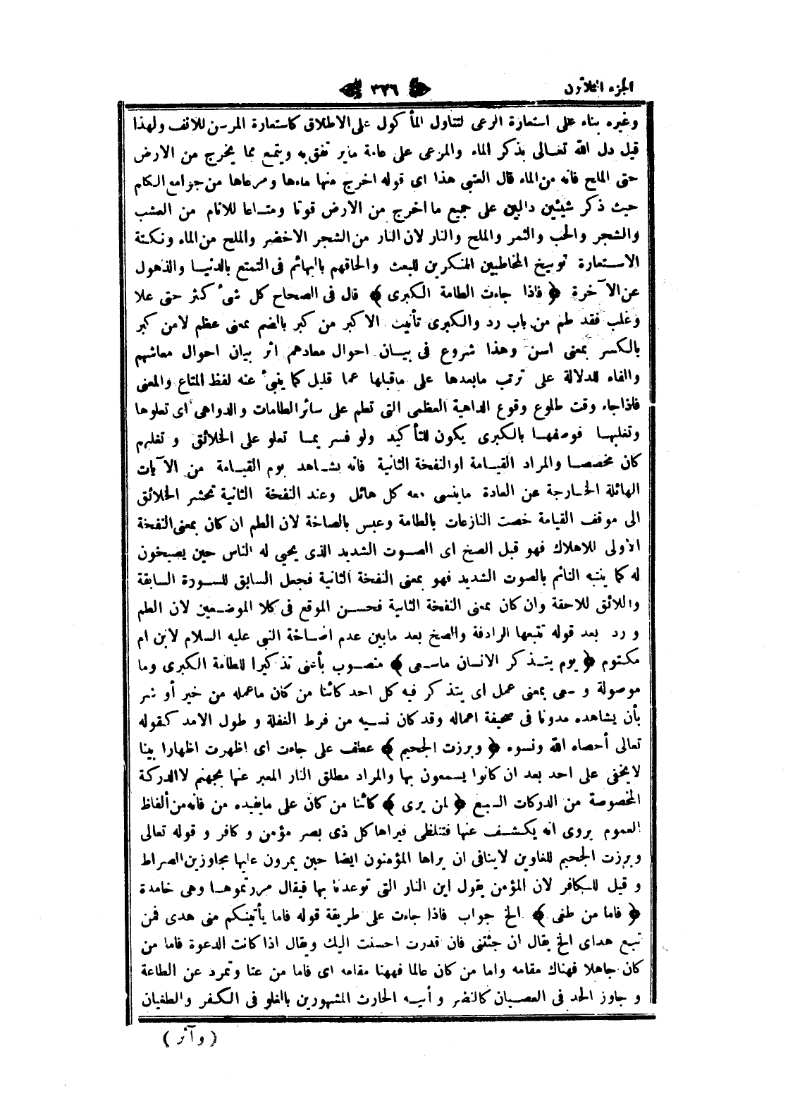 وغيره بناء على استعارة الرعي لتناول المأكول على الإطلاق كاستعارة المرسن للانف ولهذا قيل دل الله تعالى بذكر الماء والمرعى على عامة ما ير تفق به ويتمع مما يخرج من الأرض حتى الملح فانه من الماء قال العتبى هذا اى قوله اخرج منها ماءها ومرعاها من جوامع الكلم حيث ذكر شيئين دالين على جميع ما اخرج من الأرض قوتا ومتاعا للانام من العشب والشجر والحب والثمر والملح والنار لان النار من الشجر الأخضر والملح من الماء ونكتة الاستعارة توبيخ المخاطبين المنكرين للبعث وإلحاقهم بالبهائم فى التمتع بالدنيا والذهول عن الآخرة فَإِذا جاءَتِ الطَّامَّةُ الْكُبْرى قال فى الصحاح كل شىء كثر حتى علا وغلب فقد طم من باب رد والكبرى تأنيث الأكبر من كبر بالضم بمعنى عظم لا من كبر بالكسر بمعنى أسن وهذا شروع فى بيان احوال معادهم اثر بيان احوال معاشهم والفاء للدلالة على ترتب ما بعدها على ما قبلها عما قليل كما ينبئ عنه لفظ المتاع والمعنى فاذا جاء وقت طلوع وقوع الداهية العظمى التي تطم على سائر الطامات والدواهي اى تعلوها وتغلبها فوصفها بالكبرى يكون للتأكيد ولو فسر بما تعلو على الخلائق وتغلبهم كان مخصصا والمراد القيامة او النفخة الثانية فانه يشاهد يوم القيامة من الآيات الهائلة الخارجة عن العادة ما ينسى معه كل هائل وعند النفخة الثانية تحشر الخلائق الى موقف القيامة خصت النازعات بالطامة وعبس بالصاخة لان الطم ان كان بمعنى النفخة الاولى للاهلاك فهو قبل الصخ اى الصوت الشديد الذي يحيى له الناس حين يصيخون له كما ينتبه النائم بالصوت الشديد فهو بمعنى النفخة الثانية فجعل السابق للسورة السابقة واللائق للاحقة وان كان بمعنى النفخة الثانية فحسن الموقع فى كلا الموضعين لان الطم ورد بعد قوله تتبعها الرادفة والصخ بعد ما بين عدم إصاخة النبي عليه السلام لابن أم مكتوم يَوْمَ يَتَذَكَّرُ الْإِنْسانُ ما سَعى منصوب بأعني تذكيرا للطامة الكبرى وما موصولة وسعى بمعنى عمل اى يتذكر فيه كل أحد كائنا من كان ما عمله من خير أو شر بأن يشاهده مدونا فى صحيفة اعماله وقد كان نسيه من فرط الغفلة وطول الأمد كقوله تعالى أحصاه الله ونسوه وَبُرِّزَتِ الْجَحِيمُ عطف على جاءت اى أظهرت إظهارا بينا لا يخفى على أحد بعد ان كانوا يسمعون بها والمراد مطلق النار المعبر عنها بجهنم لا الدركة المخصوصة من الدركات السبع لِمَنْ يَرى كائنا من كان على ما يفيده من فانه من ألفاظ العموم يروى انه يكشف عنها فتنلظى فيراها كل ذى بصر مؤمن وكافر وقوله تعالى وبرزت الجحيم للغاوين لا ينافى ان يراها المؤمنون ايضا حبن يمرون عليها مجاوزين الصراط وقيل للكافر لان المؤمن يقول اين النار التي توعدنا بها فيقال مررتموها وهى خامدة فَأَمَّا مَنْ طَغى إلخ جواب فاذا جاءت على طريقة قوله فاما يأتينكم منى هدى فمن تبع هداى إلخ يقال ان جئتنى فان قدرت أحسنت إليك ويقال إذا كانت الدعوة فاما من كان جاهلا فهناك مقامه واما من كان عالما فههنا مقامه اى فاما من عتا وتمرد عن الطاعة وجاوز الحد فى العصيان كالنضر وأبيه الحارث المشهورين بالغلو فى الكفر والطغيان
