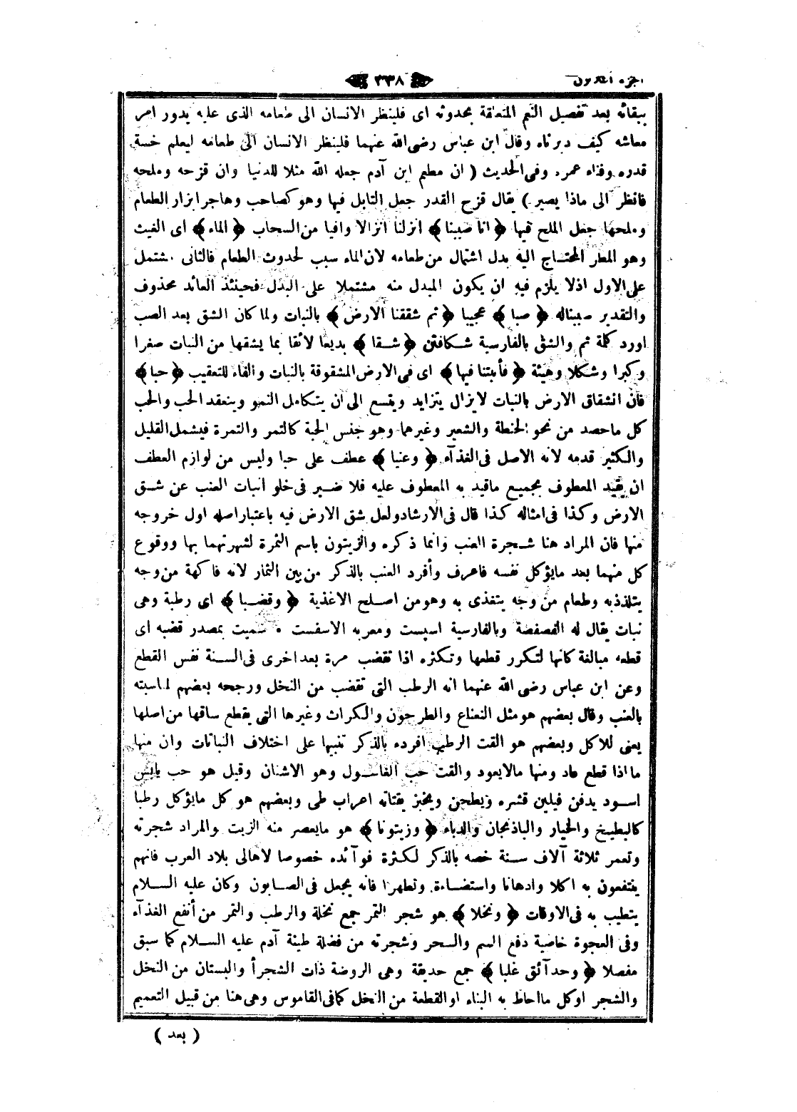 ببقائه بعد تفصيل النعم المتعلقة بحدوثه اى فلينظر الإنسان الى طعامه الذي عليه يدور امر معاشه كيف دبرناه وقال ابن عباس رضى الله عنهما فلينظر الإنسان الى طعامه ليعلم خسة قدره وفناء عمره وفى الحديث (ان مطعم ابن آدم جعله الله مثلا للدنيا وان قزحه وملحه فانظر الى ماذا يصير) يقال قزح القدر جعل التابل فيها وهو كصاحب وهاجر ابزار الطعام وملحها جعل الملح فيها أَنَّا صَبَبْنَا أنزلنا انزالا وافيا من السحاب الْماءَ اى الغيث وهو المطر المحتاج اليه بدل اشتمال من طعامه لان الماء سبب لحدوث الطعام فالثانى مشتمل على الاول إذ لا يلزم فيه ان يكون المبدل منه مشتملا على البدل فحينئذ العائد محذوف والتقدير صببنا له صَبًّا عجيبا ثُمَّ شَقَقْنَا الْأَرْضَ بالنبات ولما كان الشق بعد الصب أورد كلمة ثم والشق بالفارسية شكافتن شَقًّا بديعا لائقا بما يشقها من النبات صغرا وكبرا وشكلا وهيئة فَأَنْبَتْنا فِيها اى فى الأرض المشقوقة بالنبات والفاء للتعقيب حَبًّا فان انشقاق الأرض بالنبات لا يزال يتزايد ويتسع الى ان يتكامل النمو وينعقد الحب والحب كل ما حصد من نحو الحنطة والشعير وغيرهما وهو جنس الحبة كالتمر والتمرة فيشمل القليل والكثير قدمه لانه الأصل فى الغذاء وَعِنَباً عطف على حبا وليس من لوازم العطف ان يقيد المعطوف بجميع ما قيد به المعطوف عليه فلا ضير فى خلو إنبات العنب عن شق الأرض وكذا فى أمثاله كذا قال فى الإرشاد ولعل شق الأرض فيه باعتبار أصله أول خروجه منها فان المراد هنا شجرة العنب وانما ذكره والزيتون باسم الثمرة لشهرتهما بها ووقوع كل منهما بعد ما يؤكل نفسه فاعرف وأفرد العنب بالذكر من بين الثمار لانه فاكهة من وجه يتلذذ به وطعام من وجه يتغذى به وهو من أصلح الاغذية وَقَضْباً اى رطبة وهى نبات يقال له الفصفصة وبالفارسية اسپست ومعربه الاسفست. سميت بمصدر قضبه اى قطعه مبالغة كانها لتكرر قطعها وتكثره إذا تقضب مرة بعد اخرى فى السنة نفس القطع وعن ابن عباس رضى الله عنهما انه الرطب التي تقضب من النخل ورجحه بعضهم لما سبته بالعنب وقال بعضهم هو مثل النعناع والطرخون والكراث وغيرها التي يقطع ساقها من أصلها يعنى للاكل وبعضهم هو القت الرطب أفرده بالذكر تنبيها على اختلاف النباتات وان منها ما إذا قطع عاد ومنها ما لا يعود والقت حب الغاسول وهو الأشنان وقيل هو حب يا بس اسود يدفن فيلين قشره ويطحن ويخبز يقتاته اعراب طى وبعضهم هو كل ما يؤكل رطبا كالبطيخ والخيار والباذنجان والدباء وَزَيْتُوناً هو ما يعصر منه الزبت والمراد شجرته وتعمر ثلاثة آلاف سنة خصه بالذكر لكثرة فوائده خصوصا لاهالى بلاد العرب فانهم ينتفعون به أكلا وادهانا واستضاءة وتطهرا فانه يجعل فى الصابون وكان عليه السلام يتطيب به فى الأوقات وَنَخْلًا هو شجر التمر جمع نخلة والرطب والتمر من أنفع الغذاء وفى العجوة خاصية دفع السم والسحر وشجرته من فضلة طينة آدم عليه السلام كما سبق مفصلا وَحَدائِقَ غُلْباً جمع حديقة وهى الروضة ذات الشجر أو البستان من النخل والشجر او كل ما أحاط به البناء او القطعة من النخل كما فى القاموس وهى هنا من قبيل التعميم