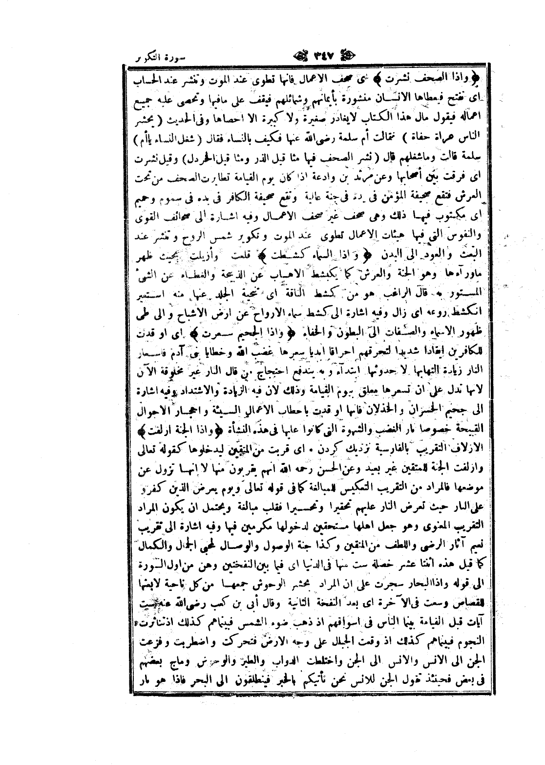 وَإِذَا الصُّحُفُ نُشِرَتْ ى صحف الأعمال فانها تطوى عند الموت وتنشر عند الحساب اى تفتح فيعطاها الإنسان منشورة بأيمانهم وشمائلهم فيقف على ما فيها وتحصى عليه جميع اعماله فيقول مال هذا الكتاب لا يغادر صغيرة ولا كبيرة الا أحصاها وفى الحديث (يحشر الناس عراة حفاة) فقالت أم سلمة رضى الله عنها فكيف بالنساء فقال (شغل النساء يا أم) سلمة قالت وما شغلهم قال (نشر الصحف فيها مثاقيل الذر ومثاقيل الخردل) وقيل نشرت اى فرقت بين أصحابها وعن مرثد بن وادعة إذا كان يوم القيامة تطايرت الصحف من تحت العرش فتقع صحيفة المؤمن فى يده فى جنة عالية وتقع صحيفة الكافر فى يده فى سموم وحميم اى مكتوب فيها ذلك وهى صحف غير صحف الأعمال وفيه اشارة الى صحائف القوى والنفوس التي فيها هيئات الأعمال تطوى عند الموت وتكوير شمس الروح وتنشر عند البعث والعود الى البدن وَإِذَا السَّماءُ كُشِطَتْ قلعت وأزيلت بحيث ظهر ماوراءها وهو الجنة والعرش كما يكبشط الإهاب عن الذبيحة والغطاء عن الشيء المستور به قال الراغب هو من كشط الناقة اى تنحية الجلد عنها منه استعير انكشط روعه اى زال وفيه اشارة الى كشط سماء الأرواح عن ارض الأشباح والى طى ظهور الأسماء والصفات الى البطون والخفاء وَإِذَا الْجَحِيمُ سُعِّرَتْ اى او قدت للكافرين إيقادا شديدا لتحرقهم احراقا ابديا سعرها غضب الله وخطايا بنى آدم فاسعار النار زيادة التهابها لا حدوثها ابتداء وبه يندفع احتجاج من قال النار غير مخلوقة الآن لانها تدل على ان تسعرها معلق بيوم القيامة وذلك لان فيه الزيادة والاشتداد وفيه اشارة الى جحيم الخسران والخذلان فانها أوقدت بأحطاب الأعمال السيئة وأحجار الأحوال القبيحة خصوصا نار الغضب والشهوة التي كانوا عليها فى هذه النشأة وَإِذَا الْجَنَّةُ أُزْلِفَتْ الازلاف التقريب بالفارسية نزديك كردن. اى قربت من المتقين ليدخلوها كقوله تعالى وأزلفت الجنة للمتقين غير بعيد وعن الحسن رحمه الله انهم يقربون منها لا انها تزول عن موضعها فالمراد من التقريب التعكيس للمبالغة كما فى قوله تعالى ويوم يعرض الذين كفرو على النار حيث تعرض النار عليهم تحقيرا وتحسيرا فقلب مبالغة ويحتمل ان يكون المراد التقريب المعنوي وهو جعل أهلها مستحقين لدخولها مكرمين فيها وفيه اشارة الى تقريب نعيم آثار الرضى واللطف من المتقين وكذا جنة الوصول والوصال لمحبى الجمال والكمال كما قيل هذه اثنتا عشر خصلة ست منها فى الدنيا اى فيما بين النفختين وهن من أول السورة الى قوله وإذا البحار سجرت على ان المراد بحشر الوحوش جمعها من كل ناحية لا بعثها للقصاص وسعت فى الآخرة اى بعد النفخة الثانية وقال أبى بن كعب رضى الله عنه ست آيات قبل القيامة بينما الناس فى أسواقهم إذ ذهب ضوء الشمس فبينما هم كذلك إذ تناثرت النجوم فبينما هم كذلك إذ وقعت الجبال على وجه الأرض فتحركت واضطربت وفزعت الجن الى الانس والانس الى الجن واختلطت الدواب والطير والوحوش وماج بعضهم فى بعض فحينئذ تقول الجن للانس نحن نأتيكم بالخبر فينطلقون الى البحر فاذا هو نار