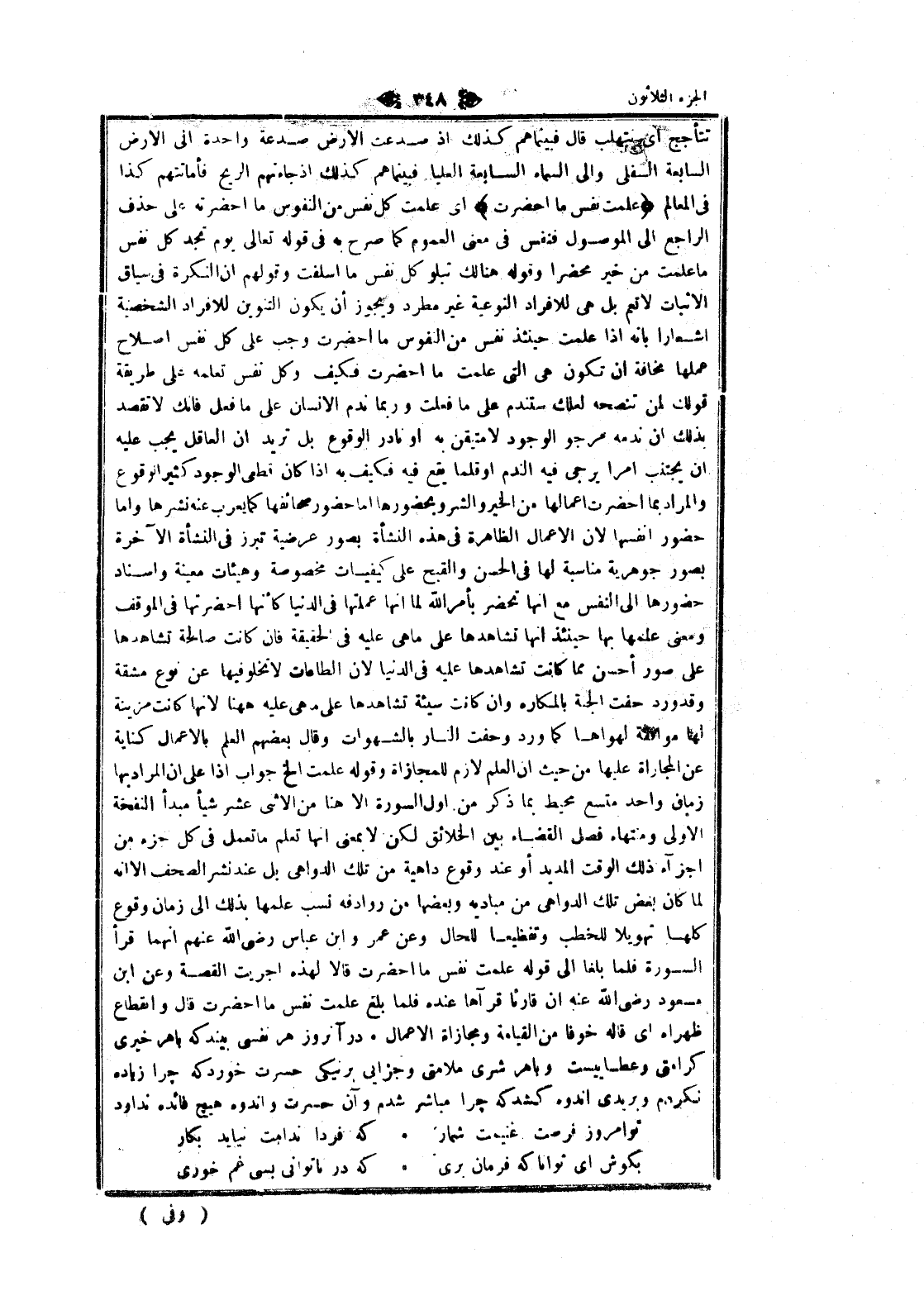 تتأجج اى نتهلب قال فبينما هم كذلك إذ صدعت الأرض صدعة واحدة الى الأرض السابعة السفلى والى السماء السابعة العليا فبينما هم كذلك إذ جاءتهم الريح فأماتتهم كذا فى المعالم عَلِمَتْ نَفْسٌ ما أَحْضَرَتْ اى علمت كل نفس من النفوس ما أحضرته على حذف الراجع الى الموصول فنفس فى معنى العموم كما صرح به فى قوله تعالى يوم تجد كل نفس ما علمت من خير محضرا وقوله هنالك تبلو كل نفس ما أسلفت وقولهم ان النكرة فى سياق الإثبات لا تعم بل هى للافراد النوعية غير مطرد ويجوز أن يكون التنوين للافراد الشخصية اشعارا بانه إذا علمت حينئذ نفس من النفوس ما أحضرت وجب على كل نفس إصلاح عملها مخافة ان تكون هى التي علمت ما أحضرت فكيف وكل نفس تعلمه على طريقة قولك لمن تنصحه لعلك ستندم على ما فعلت وربما ندم الإنسان على ما فعل فانك لا تقصد بذلك ان ندمه مرجو الوجود لا متيقن به او نادر الوقوع بل تريد ان العاقل يجب عليه ان يجتنب امرا يرجى فيه الندم او قلما يقع فيه فكيف به إذا كان قطعى الوجود كثير الوقوع والمراد بما أحضرت أعمالها من الخير والشر وبحضورها اما حضور صحائفها كما يعرب عنه نشرها واما حضور أنفسها لان الأعمال الظاهرة فى هذه النشأة بصور عرضية تبرز فى النشأة الآخرة بصور جوهرية مناسبة لها فى الحسن والقبح على كيفيات مخصوصة وهيئات معينة واسناد حضورها الى النفس مع انها تحضر بأمر الله لما انها عملتها فى الدنيا كأنها احضرتها فى الموقف ومعنى علمها بها حينئذ انها تشاهدها على ما هى عليه فى الحقيقة فان كانت صالحة تشاهدها على صور أحسن مما كانت تشاهدها علميه فى الدنيا لان الطاعات لا تخلو فيها عن نوع مشقة وقدورد حفت الجنة بالمكاره وان كانت سيئة تشاهدها على ما هى عليه هاهنا لانها كانت مزينة لها موافقة لهواها كما ورد وحفت النار بالشهوات وقال بعضهم العلم بالأعمال كناية عن المجاراة عليها من حيث ان العلم لازم للمجازاة وقوله علمت إلخ جواب إذا على ان المراد بها زمان واحد متسع محيط بما ذكر من أول السورة الا هنا من الاثني عشر شيأ مبدأ النفخة الاولى ومنتهاء فصل القضاء بين الخلائق لكن لا بمعنى انها تعلم ما تعمل فى كل جزء من اجزاء ذلك الوقت المديد أو عند وقوع داهية من تلك الدواهي بل عند نشر الصحف الا انه لما كان بعض تلك الدواهي من مباديه وبعضها من روادفه نسب علمها بذلك الى زمان وقوع كلها تهويلا للخطب وتفظيعا للحال وعن عمر وابن عباس رضى الله عنهم انهما قرأ السورة فلما بلغا الى قوله علمت نفس ما أحضرت قالا لهذه أجريت القصة وعن ابن مسعود رضى الله عنه ان قارئا قرآها عنده فلما بلغ علمت نفس ما أحضرت قال وانقطاع ظهراه اى قاله خوفا من القيامة ومجازاة الأعمال. در آن روز هر نفسى بيند كه با هر خيرى كرامتى وعطاييست وبا هر شرى ملامتى وجزايى بر نيكى حسرت خورد كه چرا زياده نكردم وبريدى اندوه كشد كه چرا مباشر شدم وآن حسرت واندوه هيچ فائده ندارد