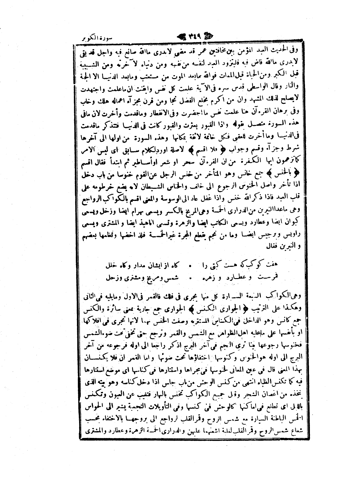 وفى الحديث العبد المؤمن بين مخافتين عمر قد مضى لا تدرى ما الله صانع فيه وأجل قد بقي لا يدرى ما الله قاض فيه فليتزود العبد لنفسه من نفسه ومن دنياه لآخرته ومن الشبيبة قبل الكبر ومن الحياة قبل الممات فو الله ما بعد الموت من مستعتب وما بعد الدنيا الا الجنة والنار وقال الواسطي قدس سره فى الآية علمت كل نفس وأيقنت ان ما علمت واجتهدت لا يصلح لذلك المشهد وان من أكرم بخلع الفضل نجا ومن قرن بجزاء اعماله هلك وخاب وفى برهان القرآن هنا علمت نفس ما أحضرت وفى الانفطار وما قدمت وأخرت لان ما فى هذه السورة متصل بقوله وإذا القبور بعثرت والقبور كانت فى الدنيا فتتذكر ما قدمت فى الدنيا وما أخرت للعقبى فكل خاتمة لائقة بمكانها وهذه السورة من أولها الى آخرها شرط وجزاء وقسم وجواب فَلا أُقْسِمُ لا صلة أورد لكلام سابق اى ليس الأمر كما تزعمون ايها الكفرة من ان القرآن سحر او شعر او أساطير ثم ابتدأ فقال اقسم بِالْخُنَّسِ جمع خانس وهو المتأخر من خنس الرجل عن القوم خنوسا من باب دخل إذا تأخر واصل الخنوس الرجوع الى خلف والخناس الشيطان لانه يضع خرطومه على قلب العبد فاذا ذكر الله خنس وإذا غفل عاد الى الوسوسة والمعنى اقسم بالكواكب الرواجع وهى ما عدا النيرين من الدراري الخمسة وهى المريخ بالكسر ويسمى بهرام ايضا وزخل ويسمى كيوان ايضا وعطارد ويسمى الكاتب ايضا والزهرة وتسمى اناهيذ ايضا والمشترى ويسمى راويس وبرجيس ايضا وما من نجم يقطع المجرة غير الخمسة فلذا خصها ونظمها بعضهم والنيرين فقال