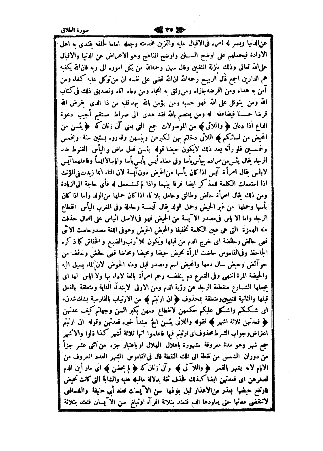 عن الدنيا ويسر له امره فى الإقبال عليه والتزين بخدمته وجعله اماما لخلقه يقتدى به اهل الارادة فيحملهم على أوضح السنن وأوضح المناهج وهو الاعراض عن الدنيا والإقبال على الله تعالى وذلك منزلة المتقين وقال سهل رحمه الله من يكل أموره الى ربه فان الله يكفيه هم الدارين اجمع قال الربيع رحمه الله ان الله قضى على نفسه ان من توكل عليه كفاه ومن آمن به هداه ومن أقرضه جازاه ومن وثق به أنجاه ومن دعاه أتاه وتصديق ذلك فى كتاب الله ومن يتوكل على الله فهو حسبه ومن يؤمن بالله يهد قلبه من ذا الذي يقرض الله قرضا حسنا فيضاعفه له ومن يعتصم بالله فقد هدى الى صراط مستقيم أجيب دعوة الداع إذا دعان وَاللَّائِي من الموصولات جمع التي يعنى آن زنان كه يَئِسْنَ مِنَ الْمَحِيضِ مِنْ نِسائِكُمْ اللاتي دخلتم بهن لكبرهن ويبسهن وقدروه بستين سنة وبخمس وخمسين فلو رأته بعد ذلك لا يكون حيضا قوله يئسن فعل ماض واليأس القنوط ضد الرجاء يقال يئس من مراده ييأس يأسا وفى معناه أيس يأيس يأسا وإياسا لا ايسا وفاعلهما آيس لا يائس يقال امرأة آيس إذا كان يأسها من الحيض دون آيسة لان التاء انما زيدت فى المؤنث إذا استعملت الكلمة للمذكر ايضا فرقا بينهما وإذا لم تستعمل له فأى حاجة الى الزيادة ومن ذلك يقال امرأة حائض وطالق وحامل بلا تاء إذا كان حملها من الولد واما إذا كان يأسها وحملها من غير الحيض وحمل الولد يقال آيسة وحاملة وفى المغرب اليأس انقطاع الرجاء واما الا ياس فى مصدر الآيسة من الحيض فهو فى الأصل ائياس على افعال حذفت منه الهمزة التي هى عين الكلمة تخفيفا والمحيض الحيض وهو فى اللغة مصدر حاضت الأنثى فهى حائض وحائضة اى خرج الدم من قبلها ويكون للأرنب والضبع والخفاش كما ذكره الجاحظ وفى القاموس حاضت المرأة تحيض حيضا ومحيضا ومحاضا فهى حائض وحائضا من حوائض وحيض سال دمها والمحيض اسم ومصدر قيل ومنه الحوض لان الماء يسيل اليه والحيضة المرة انتهى وفى الشرع دم ينفضه رحم امرأة بالغة لا داء بها ولا إياس لها اى يجعلها الشارع منقطعة الرجاء عن رؤية الدم ومن الاولى لابتداء الغاية ومتعلقة بالفعل قبلها والثانية للتبيين ومتعلقة بمحذوف إِنِ ارْتَبْتُمْ من الارتياب بالفارسية بشك شدن.