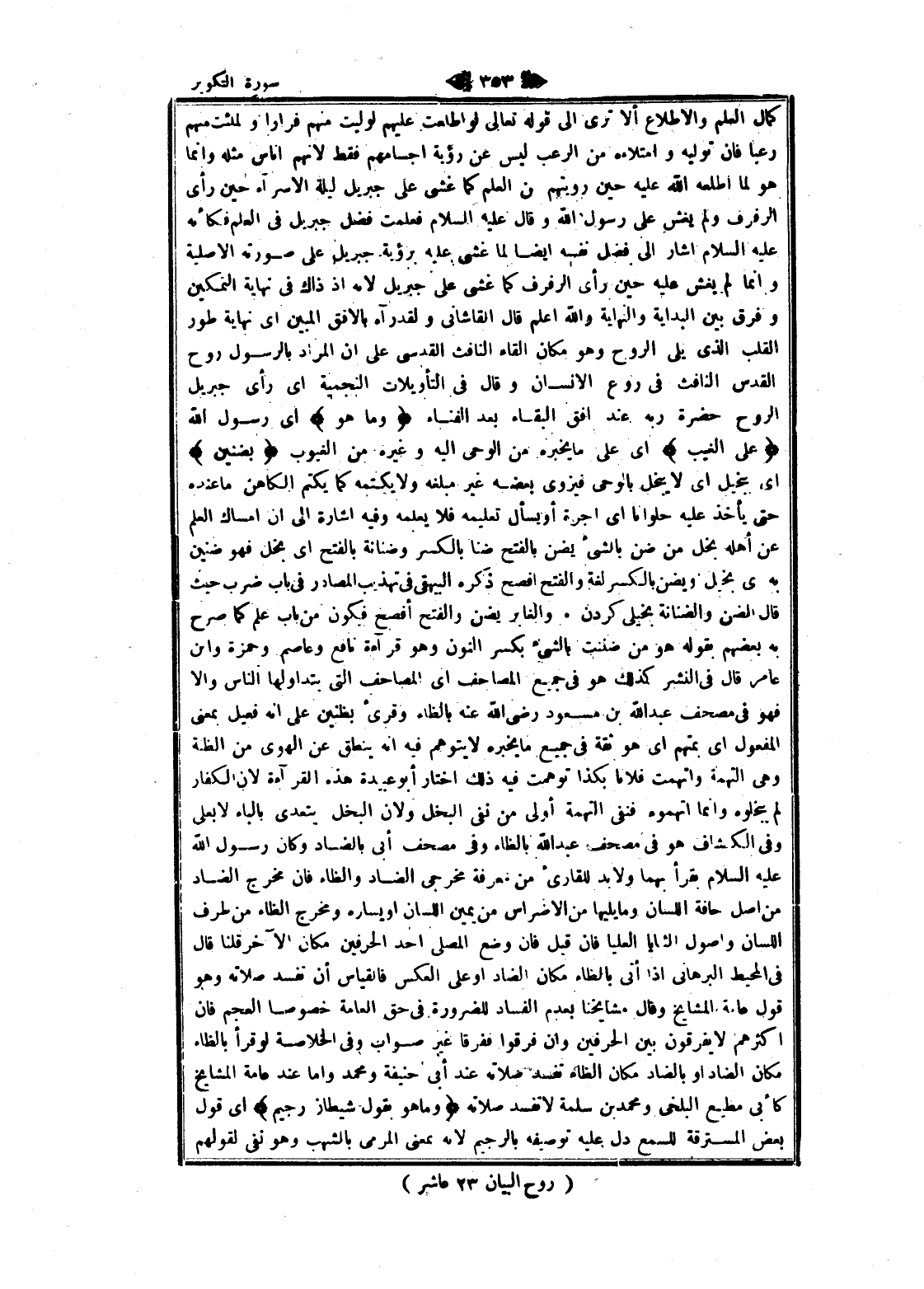 كمال العلم والاطلاع ألا ترى الى قوله تعالى لو اطلعت عليهم لوليت منهم فرارا ولملئت منهم رعبا فان توليه وامتلاءه من الرعب ليس عن رؤية أجسامهم فقط لانهم أناس مثله وانما هو لما اطلعه الله عليه حين رويتهم من العلم كما غشى على جبريل ليلة الإسراء حين رأى الرفرف ولم يغش على رسول الله وقال عليه السلام فعلمت فضل جبريل فى العلم فكأنه عليه السلام أشار الى فضل نفسه ايضا لما غشى عليه برؤية جبريل على صورته الاصلية وانما لم يغش عليه حين رأى الرفرف كما غشى على جبريل لانه إذ ذاك فى نهاية التمكين وفرق بين البداية والنهاية والله اعلم قال القاشاني ولقدرآء بالأفق المبين اى نهاية طور القلب الذي يلى الروح وهو مكان إلقاء النافث القدسي على ان المراد بالرسول روح القدس النافث فى روع الإنسان وقال فى التأويلات النجمية اى رأى جبريل الروح حضرة ربه عند أفق البقاء بعد الفناء وَما هُوَ اى رسول الله عَلَى الْغَيْبِ اى على ما يخبره من الوحى اليه وغيره من الغيوب بِضَنِينٍ اى ببخيل اى لا يبخل بالوحى فيزوى بعضه غير مبلغه ولا يكتمه كما يكتم الكاهن ما عنده حتى يأخذ عليه حلوانا اى اجرة أو يسأل تعليمه فلا يعلمه وفيه اشارة الى ان إمساك العلم عن أهله بخل من ضن بالشيء يضن بالفتح ضنا بالكسر وضنانة بالفتح اى بخل فهو ضنين به ى بخيل ويضن بالكسر لغة والفتح افصح ذكره البيهقي فى تهذيب المصادر فى باب ضرب حيث قال الضن والضنانة بخيلي كردن. والغابر يضن والفتح أفصح فيكون من باب علم كما صرح به بعضهم بقوله هو من ضننت بالشيء بكسر النون وهو قراءة نافع وعاصم وحمزة وابن عامر قال فى النشر كذلك هو فى جميع المصاحف اى المصاحف التي يتداولها الناس والا فهو فى مصحف عبد الله بن مسعود رضى الله عنه بالظاء وقرئ بظنين على انه فعيل بمعنى المفعول اى بمتهم اى هو ثقة فى جميع ما يخبره لا يتوهم فيه انه ينطق عن الهوى من الظنة وهى التهمة واتهمت فلانا بكذا توهمت فيه ذلك اختار أبو عبيدة هذه القراءة لان الكفار لم يبخلوه وانما اتهموه فنفى التهمة أولى من نفى البخل ولان البخل يتعدى بالباء لا بعلى وفى الكشاف هو فى مصحف عبد الله بالظاء وفى مصحف أبى بالضاد وكان رسول الله عليه السلام يقرأ بهما ولا بد للقارئ من معرفة مخرجى الضاد والظاء فان مخرج الضاد من اصل حافة اللسان وما يليها من الأضراس من يمين اللسان او يساره ومخرج الظاء من طرف اللسان واصول الثنايا العليا فان قيل فان وضع المصلى أحد الحرفين مكان الآخر قلنا قال فى المحيط البرهاني إذا أتى بالظاء مكان الضاد او على العكس فالقياس أن تفسد صلاته وهو قول عامة المشايخ وقال مشايخنا بعدم الفساد للضرورة فى حق العامة خصوصا العجم فان أكثرهم لا يفرقون بين الحرفين وان فرقوا ففرقا غير صواب وفى الخلاصة لو قرأ بالظاء مكان الضاد او بالضاد مكان الظاء تفسد صلاته عند أبى حنيفة ومحمد واما عند عامة المشايخ كأبى مطيع البلخي ومحمد بن سلمة لا تفسد صلاته وَما هُوَ بِقَوْلِ شَيْطانٍ رَجِيمٍ اى قول بعض المسترقة للسمع دل عليه توصيفه بالرجيم لانه بمعنى المرمى بالشهب وهو نفى لقولهم