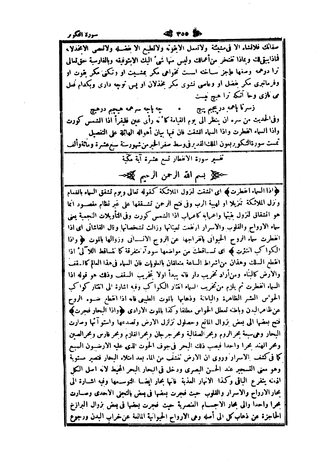 وفى الحديث من سره ان ينظر الى يوم القيامة كأنه رأى عين فليقرأ إذا الشمس كورت وإذا السماء انفطرت وإذا السماء انشقت فان فيها بيان أهواله الهائلة على التفصيل تمست سورة التكوير بعون الملك القدير فى وسط صفر الخير من شهور سنة سبع عشرة ومائة وألف