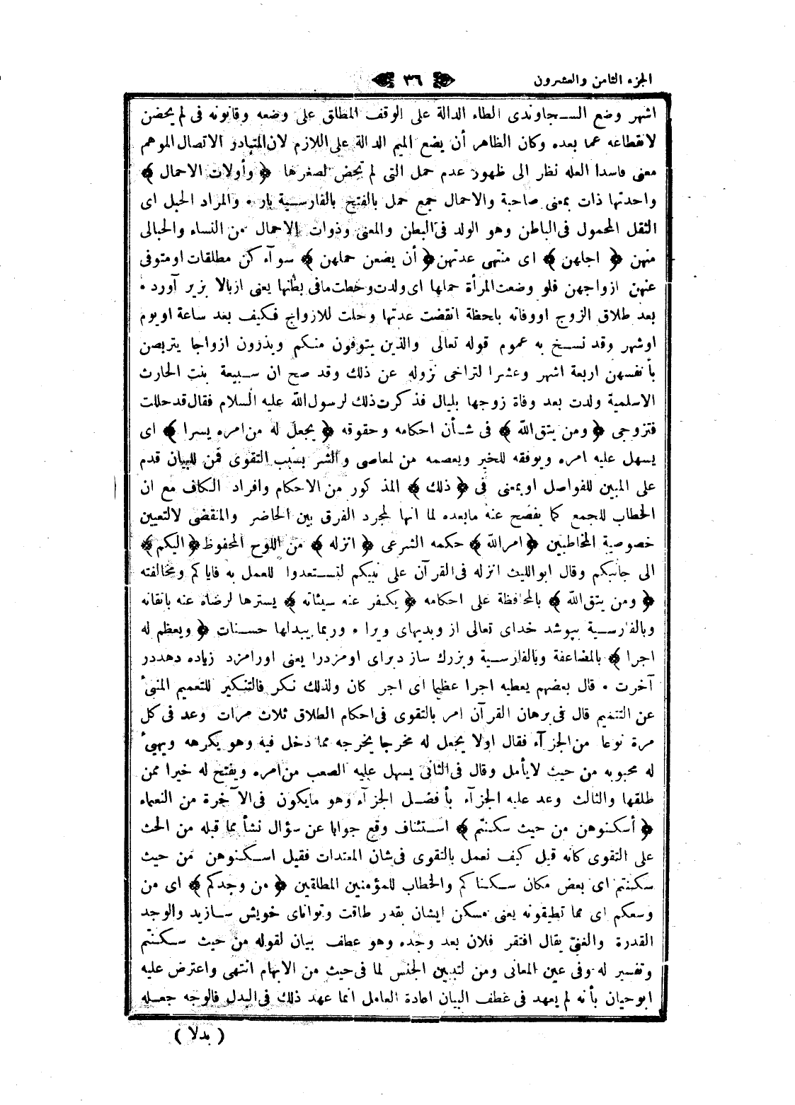 بعد طلاق الزوج او وفاته بلحظة انقضت عدتها وحلت للازواج فكيف بعد ساعة او يوم او شهر وقد نسخ به عموم قوله تعالى والذين يتوفون منكم ويذرون أزواجا يتربصن بأنفسهن اربعة أشهر وعشرا لتراخى نزوله عن ذلك وقد صح ان سبيعة بنت الحارث الاسلمية ولدت بعد وفاة زوجها بليال فذكرت ذلك لرسول الله عليه السلام فقال قد حللت فتزوجى وَمَنْ يَتَّقِ اللَّهَ فى شأن أحكامه وحقوقه يَجْعَلْ لَهُ مِنْ أَمْرِهِ يُسْراً اى يسهل عليه امره ويوفقه للخير ويعصمه من لمعاصى والشر بسبب التقوى فمن للبيان قدم على المبين للفواصل او بمعنى فى ذلِكَ المذكور من الاحكام وافراد الكاف مع ان الخطاب للجمع كما يفصح عنه ما بعده لما انها لمجرد الفرق بين الحاضر والمنقضى لا لتعيين خصوصية المخاطبين أَمْرُ اللَّهِ حكمه الشرعي أَنْزَلَهُ من اللوح المحفوظ إِلَيْكُمْ الى جانبكم وقال ابو الليث أنزله فى القرآن على نبيكم لتستعدوا للعمل به فاياكم ومخالفته وَمَنْ يَتَّقِ اللَّهَ بالمحافظة على أحكامه يُكَفِّرْ عَنْهُ سَيِّئاتِهِ يسترها لرضاه عنه باتقانه وبالفارسية بپوشد خداى تعالى از وبديهاى ويرا. وربما يبدلها حسنات وَيُعْظِمْ لَهُ أَجْراً بالمضاعفة وبالفارسية وبزرك سازد براى او مزد را يعنى او را مزد زياده دهد در آخرت. قال بعضهم يعطيه اجرا عظيما اى اجر كان ولذلك نكر فالتنكير للتعميم المنبئ عن التتميم قال فى برهان القرآن امر بالتقوى فى احكام الطلاق ثلاث مرات وعد فى كل مرة نوعا من الجزاء فقال اولا يجعل له مخرجا يخرجه مما دخل فيه وهو يكرهه ويهيئ له محبوبه من حيث لا يأمل وقال فى الثاني يسهل عليه الصعب من امره ويفتح له خيرا ممن طلقها والثالث وعد عليه الجزاء بأفضل الجزاء وهو ما يكون فى الآخرة من النعماء أَسْكِنُوهُنَّ مِنْ حَيْثُ سَكَنْتُمْ استئناف وقع جوابا عن سؤال نشأ مما قبله من الحث على التقوى كانه قيل كيف نعمل بالتقوى فى شان المعتدات فقيل أسكنوهن من حيث سكنتم اى بعض مكان سكناكم والخطاب للمؤمنين المطلقين مِنْ وُجْدِكُمْ اى من وسعكم اى مما تطيقونه يعنى مسكن ايشان بقدر طاقت وتواناى خويش سازيد والوجد القدرة والغنى يقال افتقر فلان بعد وجده وهو عطف بيان لقوله من حيث سكنتم وتفسير له وفى عين المعاني ومن لتبين الجنس لما فى حيث من الإبهام انتهى واعترض عليه ابو حيان بأنه لم يعهد فى عطف البيان إعادة العامل انما عهد ذلك فى البدل فالوجه جعله