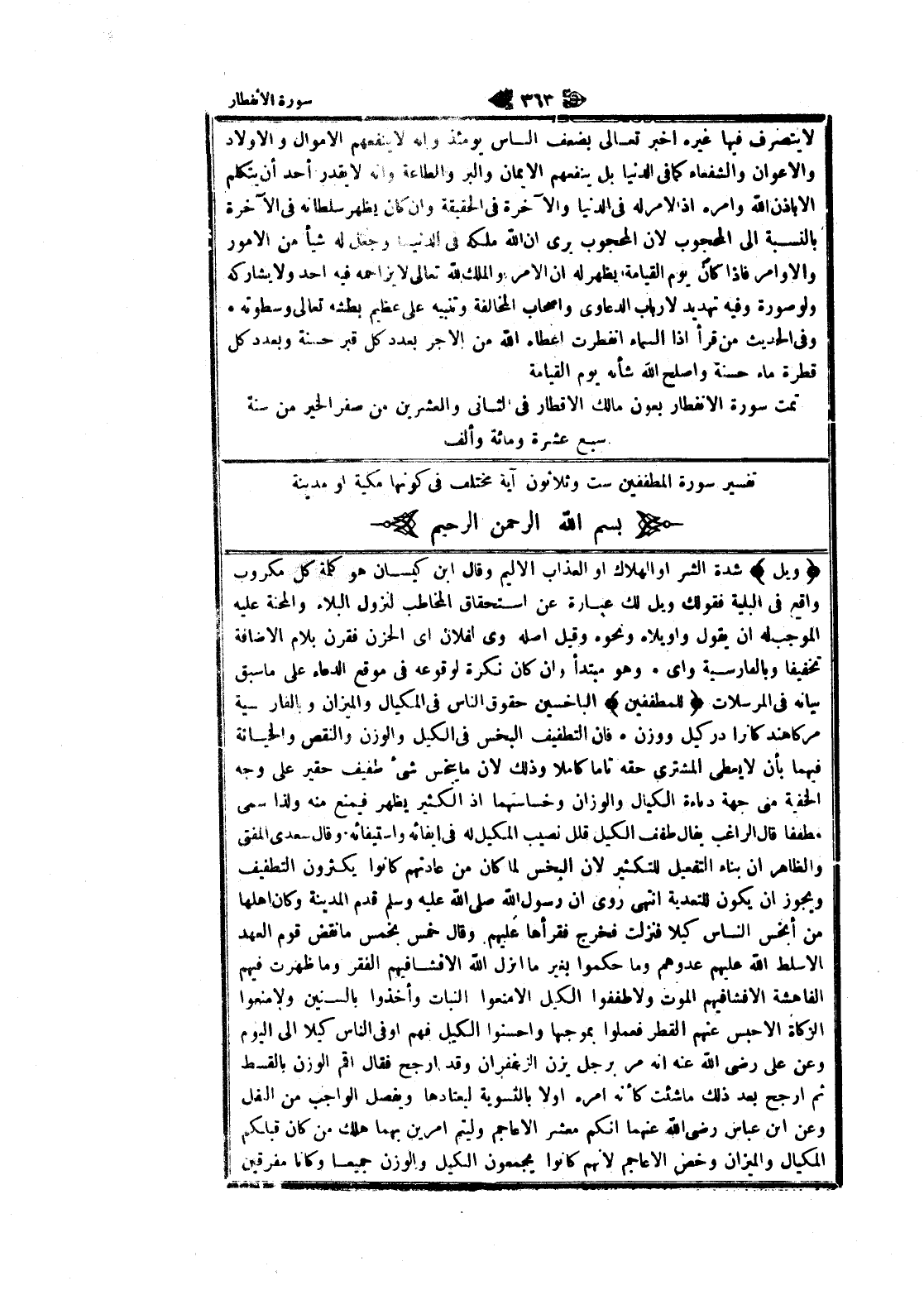 وفى الحديث من قرأ إذا السماء انفطرت أعطاه الله من الاجر بعدد كل قبر حسنة وبعدد كل قطرة ماء حسنة وأصلح الله شأنه يوم القيامة تمت سورة الانفطار بعون مالك الأقطار فى الثاني والعشرين من صفر الخير من سنة سبع عشرة ومائة وألف