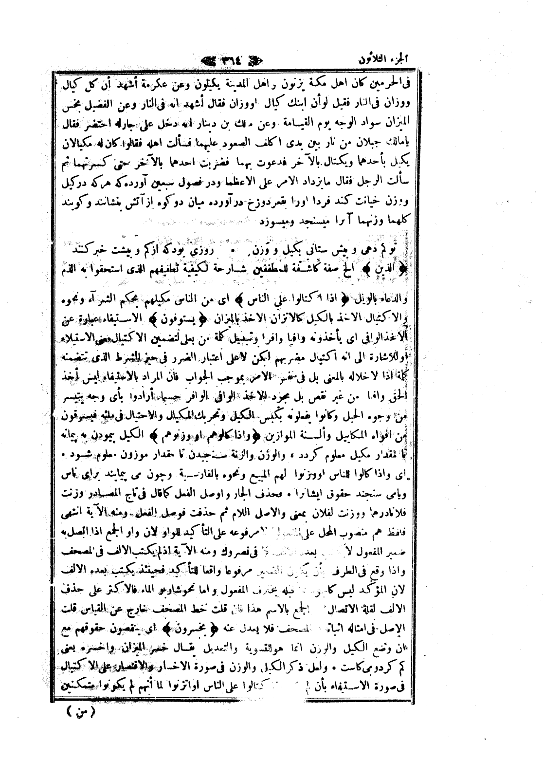 فى الحرمين كان اهل مكة يزنون واهل المدينة يكيلون وعن عكرمة أشهد أن كل كيال ووزان فى النار فقيل لو أن ابنك كيال او وزان فقال أشهد انه فى النار وعن الفضيل بخس الميزان سواد الوجه يوم القيامة وعن مالك بن دينار انه دخل على جار له احتضر فقال يا مالك جبلان من نار بين يدى أكلف الصعود عليهما فسألت اهله فقالوا كان له مكيالان يكيل بأحدهما ويكتال بالآخر فدعوت بهما فضربت أحدهما بالآخر حتى كسرتهما ثم سألت الرجل فقال ما يزداد الأمر على إلا عظما ودر فصول سبعين آورده كه هر كه در كيل ووزن خيانت كند فردا او را بقعر دوزخ در آورده ميان دو كوه از آتش بنشانند وكوبند كلهما وزنهما آنرا ميسنجد وميسوزد