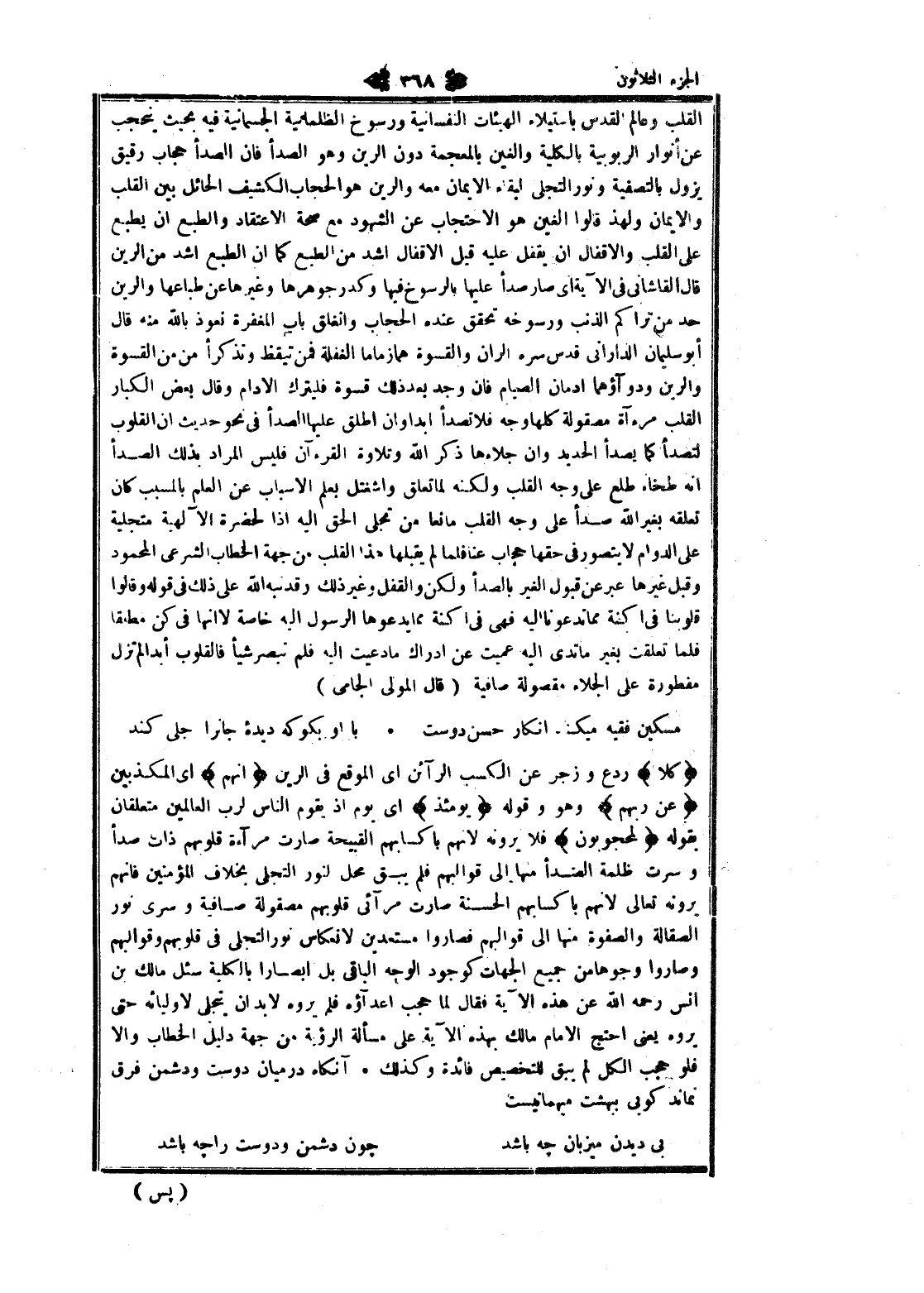 القلب وعالم القدس باستيلاء الهيئات النفسانية ورسوخ الظلمانية الجسمانية فيه بحيث ينحجب عن أنوار الربوبية بالكلية والغين بالمعجمة دون الرين وهو الصدأ فان الصدأ حجاب رقيق يزول بالتصفية ونور التجلي لبقاء الايمان معه والرين هو الحجاب الكثيف الحائل بين القلب والايمان ولهذا قالوا الغين هو الاحتجاب عن الشهود مع صحة الاعتقاد والطبع ان يطبع على القلب والأقفال ان يقفل عليه قيل الأقفال أشد من الطبع كما ان الطبع أشد من الرين قال القاشاني فى الآية اى صار صدأ عليها بالرسوخ فيها وكدر جوهرها وغيرها عن طباعها والرين حد من تراكم الذنب ورسوخه تحقق عنده الحجاب وانغلق باب المغفرة نعوذ بالله منه قال أبو سليمان الداراني قدس سره الران والقسوة هماز ماما الغفلة فمن تيقظ وتذكرأ من من القسوة والرين ودوآؤهما إدمان الصيام فان وجد بعد ذلك قسوة فليترك الادام وقال بعض الكبار القلب مرءاة مصقولة كلها وجه فلا تصدأ ابدا وان اطلق عليها الصدأ فى نحو حديث ان القلوب لتصدأ كما يصدأ الحديد وان جلاءها ذكر الله وتلاوة القرآن فليس المراد بذلك الصدأ انه طخاء طلع على وجه القلب ولكنه لما تعلق واشتغل بعلم الأسباب عن العلم بالمسبب كان تعلقه بغير الله صدأ على وجه القلب مانعا من تجلى الحق اليه إذا لحضرة الإلهية متجلية على الدوام لا يتصور فى حقها حجاب عنا فلما لم يقبلها هذا القلب من جهة الخطاب الشرعي المحمود وقبل غيرها عبر عن قبول الغير بالصدأ ولكن والقفل وغير ذلك وقد نبه الله على ذلك فى قوله وقالوا قلوبنا فى اكنة مما تدعونا اليه فهى فى اكنة مما يدعوها الرسول اليه خاصة لا انها فى كن مطلقا فلما تعلقت بغير ماتدى اليه عميت عن ادراك ما دعيت اليه فلم تبصر شيأ فالقلوب أبدا لم تزل مفطورة على الجلاء مقصولة صافية (قال المولى الجامى)