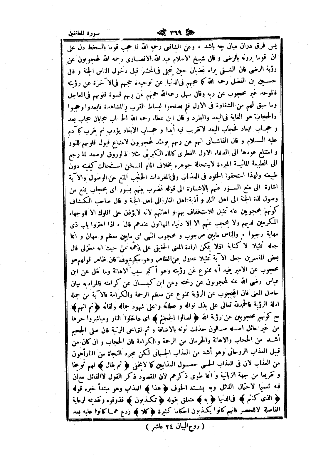 پس فرق در ان ميان چهـ باشد. وعن الشافعي رحمه الله لما حجب قوما بالسخط دل على ان قوما يرونه بالرضى وقال شيخ الإسلام عبد الله الأنصاري رحمه الله لمحجوبون عن رؤية الرضى فان الشقي يراه غضبان حين يتجلى فى المحشر قبل دخول الناس الجنة وقال حسين بن الفضل رحمه الله كما حجبهم فى الدنيا عن توحيده حجبهم فى الآخرة عن رؤيته فالموحد غير محجوب عن ربه وقال سهل رحمه الله حجبهم عن ربهم قسوة قلوبهم فى العاجل وما سبق لهم من الشقاوة فى الأزل فلم يصلحوا لبساط القرب والمشاهدة فابعدوا وحجبوا والحجاب هو الغاية فى البعد والطرد وقال ابن عطاء رحمه الله الحجاب حجابان حجاب بعد وحجاب ابعاد فحجاب البعد لا تقريب فيه أبدا وحجاب الابعاد يؤدب ثم يقرب كآدم عليه السلام وقال القاشاني انهم عن ربهم يومئذ لمحجوبون لامتاع قبول قلوبهم للنور وامتناع عودها الى الصفاء الاول الفطري كالماء الكبريتي مثلا إذ لو روق او صعد لما رجع الى الطبيعة المائية المبردة لاستحالة جوهره بخلاف الماء المسخن استحالت كيفيته دون طبيعته ولهذا استحقوا الخلود فى العذاب وفى المفردات الحجب المنع عن الوصول والآية اشارة الى منع السور عنهم بالاشارة الى قوله فضرب بينهم بسور اى بحجاب يمنع من وصول لذة الجنة الى اهل النار وأذية اهل النار الى اهل الجنة وقال لصاحب الكشاف كونهم محجوبين عنه تمثيل للاستخفاف بهم واهانتهم لانه لا يؤذن على الملوك الا للوجهاء المكرمين لديهم ولا يحجب عنهم الا الأدنياء المهانون عندهم قال. إذا اعتروا باب ذى مهابة رجبوا. والناس ما بين مرجوب ومحجوب انتهى اى ما بين معظم ومهان وانما جعله تمثيلا لا كناية إذ لا يمكن ارادة المعنى الحقيقي على زعمه من حيث انه معتزلى قال بعض المفسرين جعل الآية تمثيلا عدول عن الظاهر وهو مكشوف فان ظاهر قولهم هو محجوب عن الأمير يفيد أنه ممنوع غن رؤيته وهو أكبر سبب الاهانة وما نقل عن ابن عباس رضى الله عنه لمحجوبون عن رحمته وعن ابن كيسان عن كرامته فالمراد به بيان حاصل المعنى فان المحجوب عن الرؤية ممنوع عن معظم الرحمة والكرامة فالآية من جملة ادلة الرؤية فالحمد لله تعالى على بذل نواله وعطائه وعلى شهود جماله ولقائه ثُمَّ إِنَّهُمْ مع كونهم محجوبين عن رؤية الله لَصالُوا الْجَحِيمِ اى داخلوا النار ومباشروا حرها من غير حائل أصله صالون حذفت نونه بالاضافة وثم لتراخى الرتبة فان صلى الجحيم أشد من الحجاب والاهانة والحرمان من الرحمة والكرامة فان الحجاب وان كان من قبيل العذاب الروحاني وهو أشد من العذاب الجسماني لكن مجرد النجاة من النار أهون من العذاب لان فى العذاب الحسى حصول العذابين كما لا يخفى ثُمَّ يُقالُ لهم توبيخا وتقريعا من جهة الزبانية وانما طوى ذكرهم لان المقصود ذكر القول لا القائل مع ان فيه تعميما لاحتمال القائل وبه يشتد الخوف هذَا العذاب وهو مبتدأ خبره قوله الَّذِي كُنْتُمْ فى الدنيا بِهِ متعلق بقوله تُكَذِّبُونَ فذوقوه وتقديمه لرعاية الفاصلة لا للحصر فانهم كانوا يكذبون احكاما كثيرة كَلَّا ردع عما كانوا عليه بعد