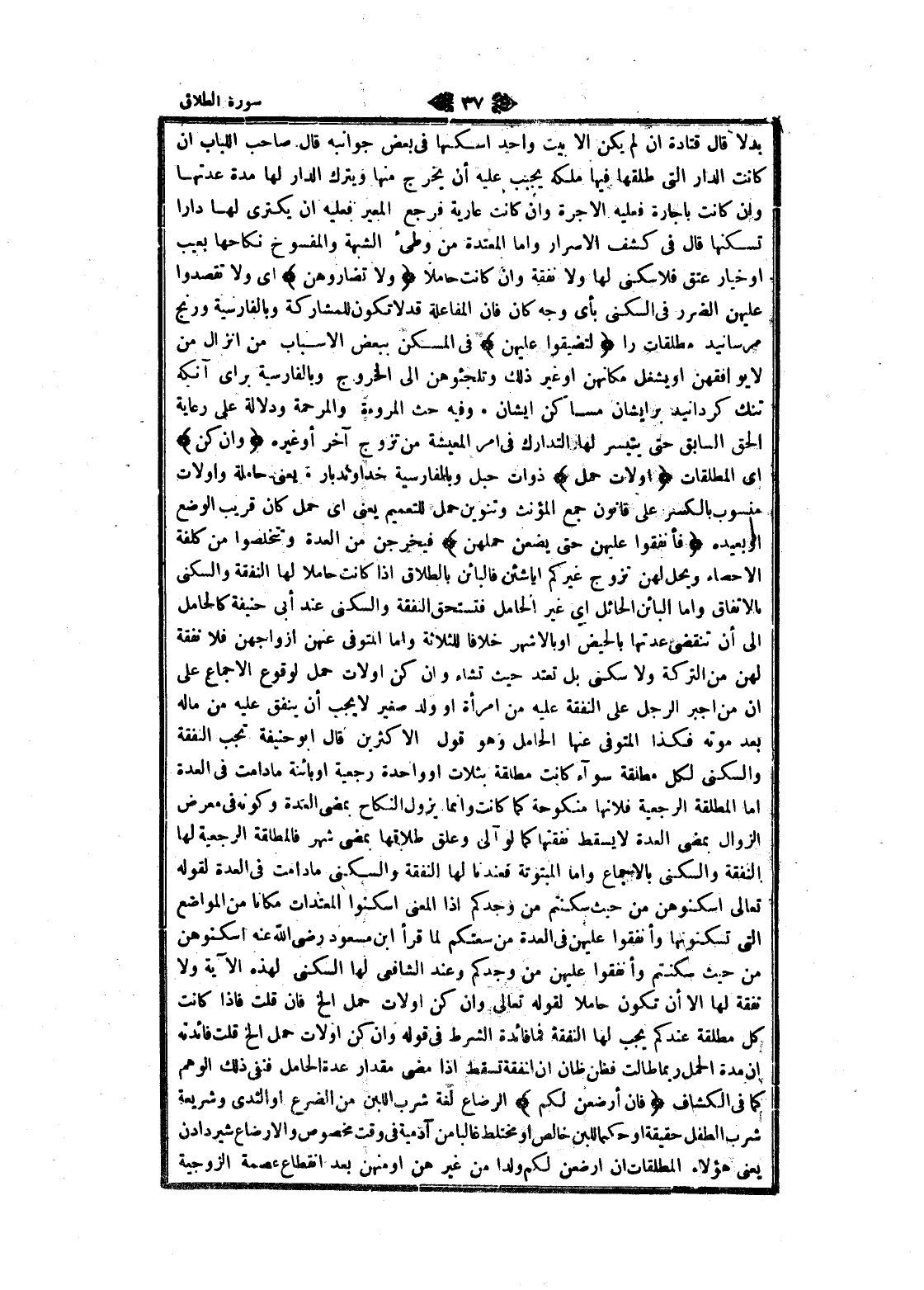 بدلا قال قتادة ان لم يكن الا بيت واحد أسكنها فى بعض جوانبه قال صاحب اللباب ان كانت الدار التي طلقها فيها ملكه يجيب عليه أن يخرج منها ويترك الدار لها مدة عدتها وان كانت باجارة فعليه الاجرة وان كانت عارية فرجع المعير فعليه ان يكترى لها دارا تسكنها قال فى كشف الاسرار واما المعتدة من وطئ الشبهة والمفسوخ نكاحها بعيب او خيار عتق فلا سكنى لها ولا نفقة وان كانت حاملا وَلا تُضآرُّوهُنَّ اى ولا تقصدوا عليهن الضرر فى السكنى بأى وجه كان فان المفاعلة قد لا تكون للمشاركة وبالفارسية ورنج مرسانيد مطلقات را لِتُضَيِّقُوا عَلَيْهِنَّ فى المسكن ببعض الأسباب من إنزال من لا يوافقهن او يشغل مكانهن او غير ذلك وتلجئوهن الى الخروج وبالفارسية براى آنكه تنك كردانيد بر ايشان مساكن ايشان. وفيه حث المروءة والمرحمة ودلالة على رعاية الحق السابق حتى يتيسر لها التدارك فى امر المعيشة من تزوج آخر أو غيره وَإِنْ كُنَّ اى المطلقات أُولاتِ حَمْلٍ ذوات حبل وبالفارسية خداوند بار. يعنى حاملة وأولات منسوب بالكسر على قانون جمع المؤنث وتنوين حمل للتعميم يعنى اى حمل كان قريب الوضع او بعيده فَأَنْفِقُوا عَلَيْهِنَّ حَتَّى يَضَعْنَ حَمْلَهُنَّ فيخرجن من العدة وتتخلصوا من كلفة الإحصاء ويحل لهن تزوج غيركم أيا شئن فالبائن بالطلاق إذا كانت حاملا لها النفقة والسكنى بالاتفاق واما البائن الحائل اى غير الحامل فتستحق النفقة والسكنى عند أبى حنيفة كالحامل الى أن تنقضى عدتها بالحيض او بالأشهر خلافا للثلاثة واما المتوفى عنهن أزواجهن فلا نفقة لهن من التركة ولا سكنى بل تعتد حيث تشاء وان كن أولات حمل لوقوع الإجماع على ان من اجبر الرجل على النفقة عليه من امرأة او ولد صغير لا يجب أن ينفق عليه من ماله بعد موته فكذا المتوفى عنها الحامل