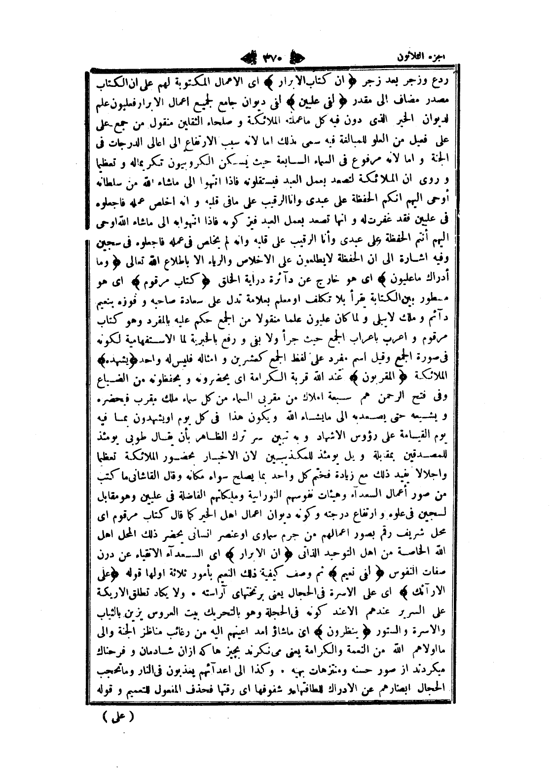 ردع وزجر بعد زجر إِنَّ كِتابَ الْأَبْرارِ اى الأعمال المكتوبة لهم على ان الكتاب مصدر مضاف الى مقدر لَفِي عِلِّيِّينَ لفى ديوان جامع لجميع اعمال الأبرار فعليون علم لديوان الخير الذي دون فيه كل ما عملته الملائكة وصلحاء الثقلين منقول من جمع على على فعيل من العلو للمبالغة فيه سمى بذلك اما لانه سبب الارتفاع الى أعالي الدرجات فى الجنة واما لانه مرفوع فى السماء السابعة حيث يسكن الكروبيون تكريما له وتعظيما وروى ان الملائكة لتصعد بعمل العبد فيستقلونه فاذا انتهوا الى ما شاء الله من سلطانه أوحى إليهم انكم الحفظة على عبدى وانا الرقيب على ما فى قلبه وانه أخلص عمله فاجعلوه فى عليين فقد غفرت له وانها تصعد بعمل العبد فيزكونه فاذا انتهوا به الى ما شاء الله اوحى إليهم أنتم الحفظة على عبدى وأنا الرقيب على قلبه وانه لم يخلص فى عمله فاجعلوه فى سجين وفيه اشارة الى ان الحفظة لا يطلعون على الإخلاص والرياء الا باطلاع الله تعالى وَما أَدْراكَ ما عِلِّيُّونَ اى هو خارج عن دائرة دراية الخلق كِتابٌ مَرْقُومٌ اى هو مسطور بين الكتابة يقرأ بلا تكلف او معلم بعلامة تدل على سعادة صاحبه وفوزه بنعيم دائم وملك لا يبلى ولما كان عليون علما منقولا من الجمع حكم عليه بالمفرد وهو كتاب مرقوم وأعرب باعراب الجمع حيث جرأ ولا بفي ورفع بالخبرية لما الاستفهامية لكونه فى صورة الجمع وقيل اسم مفرد على لفظ الجمع كعشرين وأمثاله فليس له واحد يَشْهَدُهُ الملائكة الْمُقَرَّبُونَ عند الله قربة الكرامة اى يحضرونه ويحفظونه من الضياع وفى فتح الرحمن هم سبعة املاك من مقربى السماء من كل سماء ملك مقرب فيحضره ويشيعه حتى يصعد به الى ما يشاء الله ويكون هذا فى كل يوم او يشهدون بما فيه يوم القيامة على رؤوس الاشهاد وبه تبين سر ترك الظاهر بأن يقال طوبى يومئذ للمصدقين بمقابلة ويل يومئذ للمكذبين لان الاخبار بحضور الملائكة تعظيما وإجلالا يفيد ذلك مع زيادة فختم كل واحد بما يصلح سواه مكانه وقال القاشاني ما كتب من صور أعمال السعداء وهيئات نفوسهم النورانية وملكاتهم الفاضلة فى عليين وهو مقابل لسجين فى علوه وارتفاع درجته وكونه ديوان اعمال اهل الخير كما قال كتاب مرقوم اى محل شريف رقم بصور أعمالهم من جرم سماوى او عنصر انسانى يحضر ذلك المحل اهل الله الخاصة من اهل التوحيد الذاتي إِنَّ الْأَبْرارَ اى السعداء الأتقياء عن درن صفات النفوس لَفِي نَعِيمٍ ثم وصف كيفية ذلك النعيم بأمور ثلاثة أولها قوله عَلَى الْأَرائِكِ اى على الاسرة فى الحجال يعنى بر تختهاى آراسته. ولا يكاد تطلق الاريكة على السرير عندهم الا عند كونه فى الحجلة وهو بالتحريك بيت العروس يزين بالثياب والاسرة والستور يَنْظُرُونَ اى ما شاؤا مد أعينهم اليه من رغائب مناظر الجنة والى ما أولاهم الله من النعمة والكرامة يعنى مى نكرند بچيزها كه از ان شادمان وفرحناك ميكردند از صور حسنه ومنتزهات بهية. وكذا الى أعدائهم يعذبون فى النار وما تحجب الحجال أبصارهم عن الإدراك للطافتها وشفوفها اى رقتها فحذف المفعول للتعميم وقوله