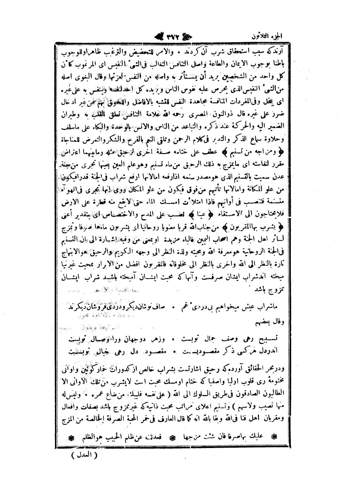 ودر بحر الحقائق آورده كه رحيق اشارتست بشراب خالص از كدورات خمار كونين وأواني مختومه رى قلوب أوليا واصفيا كه ختام او مسك محبت است لا يشرب من تلك الأواني الا الطالبون الصادقون فى طريق السلوك الى الله (على نفسه فليبك من ضاع عمره. وليس له منها نصيب ولا سهم) وتسنيم اعلاى مراتب محبت ذاتيه كه غير ممزوج باشد بصفات وافعال ومقربان اهل فنا فى الله وبقا بالله انه كما قال العارف فى خمر المحبة الصرفة الخالصة من المزج
