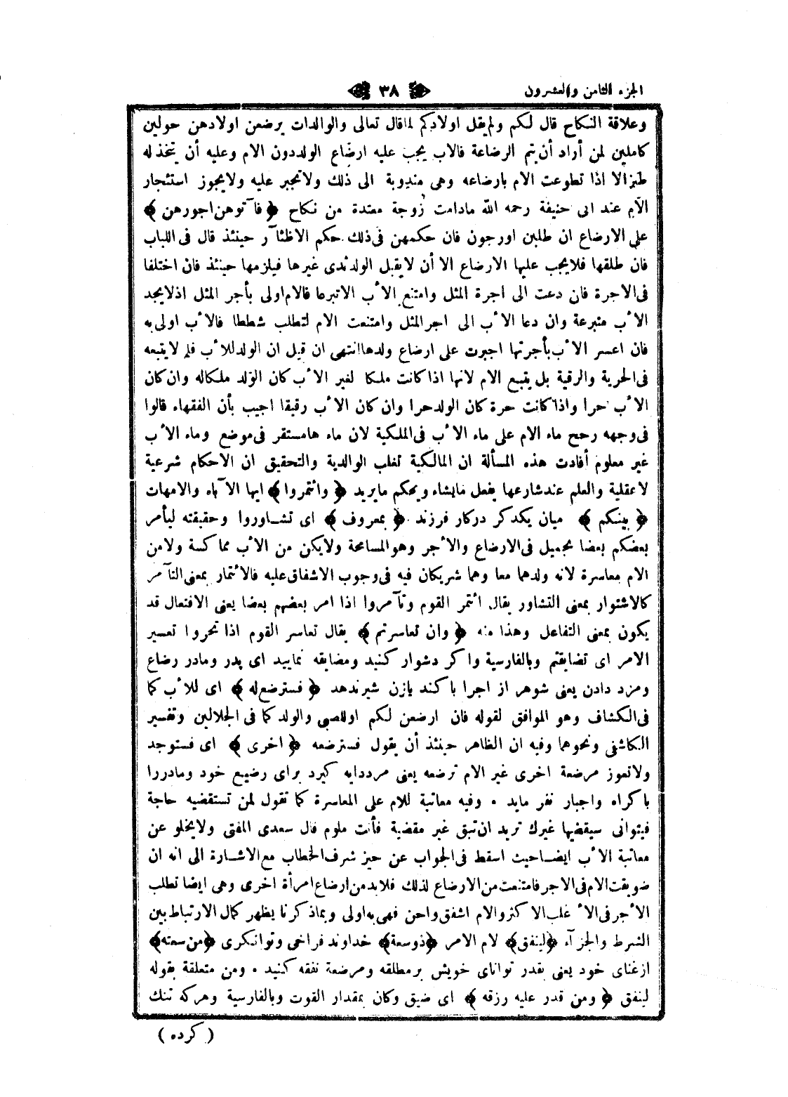 وعلاقة النكاح قال لكم ولم يقل أولادكم لما قال تعالى والوالدات يرضعن أولادهن حولين كاملين لمن أراد أن يتم الرضاعة فالاب يجب عليه إرضاع الولد دون الام وعليه أن يتخذ له ظئز الا إذا تطوعت الام بارضاعه وهى مندوبة الى ذلك ولا تجبر عليه ولا يجوز استئجار الام عند أبى حنيفة رحمه الله ما دامت زوجة معتدة من نكاح فَآتُوهُنَّ أُجُورَهُنَّ على الإرضاع ان طلبن اورجون فان حكمهن فى ذلك حكم الاظآر حينئذ قال فى اللباب فان طلقها فلا يجب عليها الإرضاع الا أن لا يقبل الولد ثدى غيرها فيلزمها حينئذ فان اختلفا فى الاجرة فان دعت الى اجرة المثل وامتنع الأب إلا تبرعا فالام اولى بأجر المثل إذ لا يجد الأب متبرعة وان دعا الأب الى اجر المثل وامتنعت الام لتطلب شططا فالأب اولى به فان أعسر الأب بأجرتها أجبرت على إرضاع ولدها انتهى ان قيل ان الولد للأب فلم لا يتبعه فى الحرية والرقية بل يتبع الام لانها إذا كانت ملكا لغير الأب كان الولد ملكا له وان كان الأب حرا وإذا كانت حرة كان الولد حرا وان كان الأب رقيقا أجيب بأن الفقهاء قالوا فى وجهه رجح ماء الام على ماء الأب فى الملكية لان ماءها مستقر فى موضع وماء الأب غير معلوم أفادت هذه المسألة ان المالكية تغلب الوالدية والتحقيق ان الاحكام شرعية لا عقلية والعلم عند شارعها يفعل ما يشاء ويحكم ما يريد وَأْتَمِرُوا ايها الآباء والأمهات بَيْنَكُمْ ميان يكدكر در كار فرزند بِمَعْرُوفٍ اى تشاوروا وحقيقته ليأمر بعضكم بعضا بجميل فى الإرضاع والأجر وهو المسامحة ولا يكن من الأب مماكسة ولا من الام معاسرة لانه ولدهما معا وهما شريكان فيه فى وجوب الإشفاق عليه فالائتمار بمعنى التآمر كالاشتوار بمعنى التشاور يقال ائتمر القوم وتآمروا إذا امر بعضهم بعضا يعنى الافتعال قد يكون بمعنى التفاعل وهذا منه وَإِنْ تَعاسَرْتُمْ يقال تعاسر القوم إذا تحروا تعسير الأمر اى تضايقتم وبالفارسية واگر دشوار كنيد ومضايقه نماييد اى پدر ومادر رضاع ومزد دادن يعنى شوهر از اجرا با كند يا زن شير ندهد فَسَتُرْضِعُ لَهُ اى للأب كما فى الكشاف وهو الموافق لقوله فان أرضعن لكم او للصبى والولد كما فى الجلالين وتفسير الكاشفى ونحوهما وفيه ان الظاهر حينئذ أن يقول فسترضعه أُخْرى اى فستوجد ولا تعوز مرضعة اخرى غير الام ترضعه يعنى مرد دايه كيرد براى رضيع خود ومادر را بإكراه وإجبار نفرمايد. وفيه معاتبة للام على المعاسرة كما تقول لمن تستقضيه حاجة فيتوانى سيقضيها غيرك تريد ان تبق غير مقضية فأنت ملوم قال سعدى المفتى ولا يخلو عن معاتبة الأب ايضا حيث أسقط فى الجواب عن حيز شرف الخطاب مع الاشارة الى انه ان ضوبقت الام فى الاجر فامتنعت من الإرضاع لذلك فلا بد من إرضاع امرأة اخرى وهى ايضا تطلب الأجر فى الأغلب الأكثر والام اشفق واحن فهى به اولى وبما ذكرنا يظهر كمال الارتباط بين الشرط والجزاء لِيُنْفِقْ لام الأمر ذُو سَعَةٍ خداوند فراخى وتوانكرى مِنْ سَعَتِهِ از غناى خود يعنى بقدر تواناى خويش بر مطلقه ومرضعة نفقه كنيد. ومن متعلقة بقوله لينفق وَمَنْ قُدِرَ عَلَيْهِ رِزْقُهُ اى ضيق وكان بمقدار القوت وبالفارسية وهر كه تنك