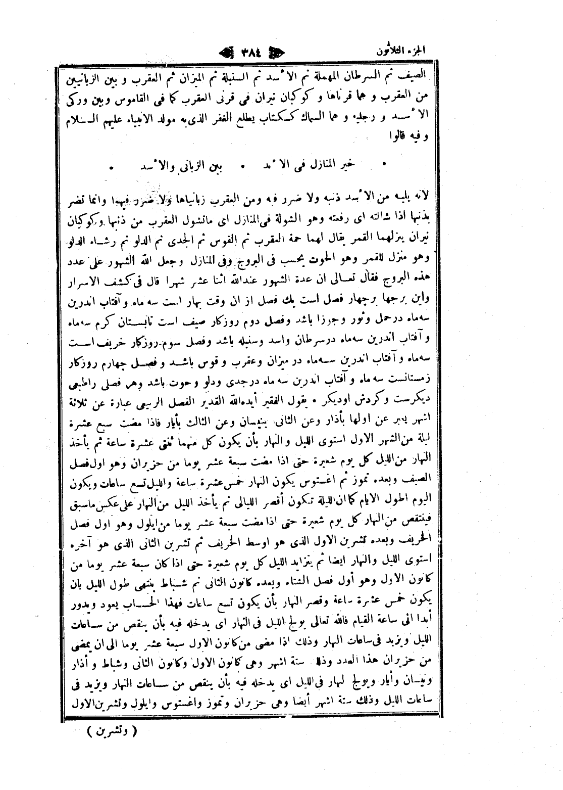 لانه يليه من الأسد ذنبه ولا ضرر فيه ومن العقرب زبانياها ولا ضرر فيهما وانما تضر بذنبها إذا شالته اى رفعته وهو الشولة فى المنازل اى ما تشول العقرب من ذنبها وكوكبان نيران ينزلهما القمر يقال لهما حمة العقرب ثم القوس ثم الجدى ثم الدلو ثم رشاء الدلو وهو منزل للقمر وهو الحوت يحسب فى البروج وفى المنازل وجعل الله الشهور على عدد هذه البروج فقال تعالى ان عدة الشهور عند الله اثنا عشر شهرا قال فى كشف الاسرار واين برجها بر چهار فصل است يك فصل از ان وقت بهار است سه ماه وآفتاب اندرين سه ماه در حمل وثور وجوزا باشد وفصل دوم روزكار صيف است تابستان كرم سه ماه وآفتاب اندرين سه ماه در سرطان واسد وسنبله باشد وفصل سوم روزكار خريف است سه ماه وآفتاب اندرين سه ماه در ميزان وعقرب وقوس باشد وفصل چهارم روزكار زمستانست سه ماه وآفتاب اندرين سه ماه در جدى ودلو وحوت باشد وهر فصلى را طبعى ديكرست وكردش او ديكر. يقول الفقير أيده الله القدير الفصل الربيعي عبارة عن ثلاثة أشهر يعبر عن أولها بأذار وعن الثاني بنيسان وعن الثالث بأيار فاذا مضت سبع عشرة ليلة من الشهر الاول استوى الليل والنهار بأن يكون كل منهما ثنتى عشرة ساعة ثم يأخذ النهار من الليل كل يوم شعيرة حتى إذا مضت سبعة عشر يوما من حزيران وهو أول فصل الصيف وبعده تموز ثم اغستوس يكون النهار خمس عشرة ساعة والليل تسع ساعات ويكون اليوم أطول الأيام كما ان الليلة تكون أقصر الليالى ثم يأخذ الليل من النهار على عكس ما سبق فينتقص من النهار كل يوم شعيرة حتى إذا مضت سبعة عشر يوما من أيلول وهو أول فصل الخريف وبعده تشرين الاول الذي هو اوسط الخريف ثم تشرين الثاني الذي هو آخره استوى الليل والنهار ايضا ثم يتزايد الليل كل يوم شعيرة حتى إذا كان سبعة عشر يوما من كانون الاول وهو أول فصل الشتاء وبعده كانون الثاني ثم شباط ينتهى طول الليل بان يكون خمس عشرة ساعة وقصر النهار بأن يكون تسع ساعات فهذا الحساب يعود ويدور أبدا انى ساعة القيام فالله تعالى يولج الليل فى النهار اى يدخله فيه بأن ينقص من ساعات الليل