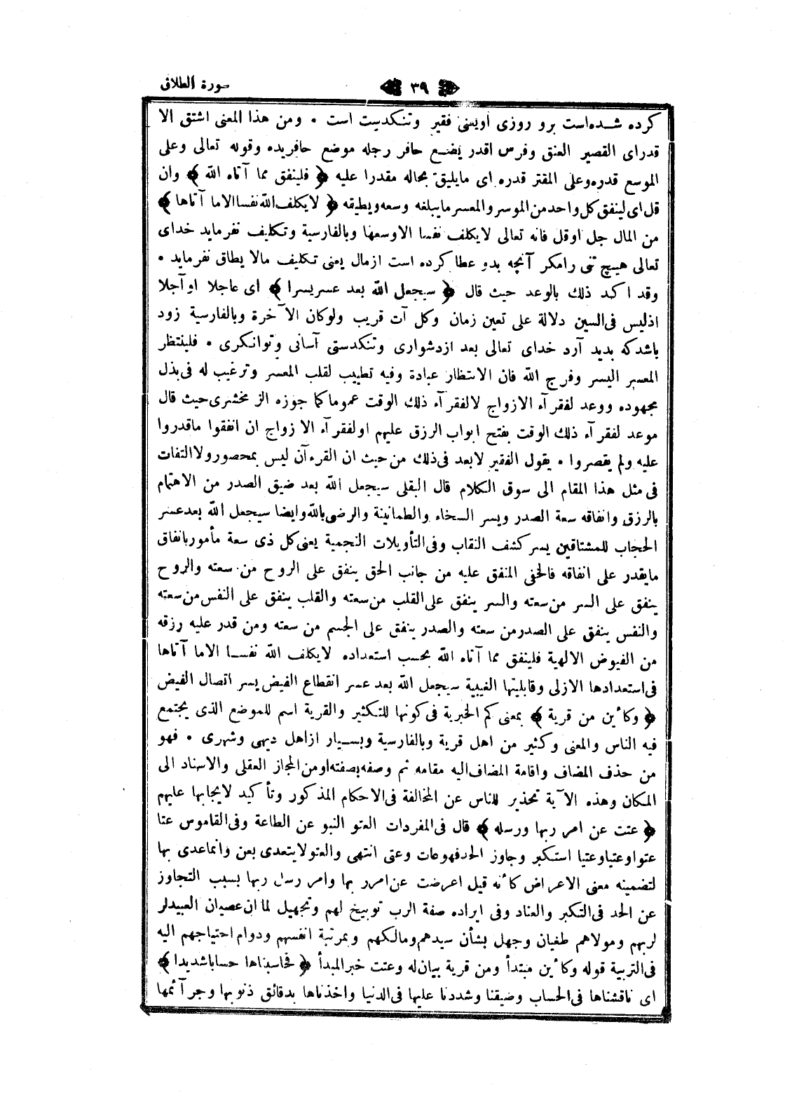 وقد أكد ذلك بالوعد حيث قال سَيَجْعَلُ اللَّهُ بَعْدَ عُسْرٍ يُسْراً اى عاجلا او آجلا إذ ليس فى السين دلالة على تعين زمان وكل آت قريب ولو كان الآخرة وبالفارسية زود باشد كه پديد آرد خداى تعالى بعد از دشوارى وتنكدستى آسانى وتوانكرى. فلينتظر المعسر اليسر وفرج الله فان الانتظار عبادة وفيه تطييب لقلب المعسر وترغيب له فى بذل مجهوده ووعد لفقراء الأزواج لا لفقراء ذلك الوقت عموما كما جوزه الزمخشري حيث قال موعد لفقراء ذلك الوقت بفتح أبواب الرزق عليهم او لفقراء الأزواج ان أنفقوا ما قدروا عليه ولم يقصروا. يقول الفقير لا بعد فى ذلك من حيث ان القرآن ليس بمحصور ولا التفات فى مثل هذا المقام الى سوق الكلام قال البقلى سيجعل الله بعد ضيق الصدر من الاهتمام بالرزق وإنفاقه سعة الصدر ويسر السخاء والطمأنينة والرضى بالله وايضا سيجعل الله بعد عسر الحجاب للمشتاقين يسر كشف النقاب وفى التأويلات النجمية يعنى كل ذى سعة مأمور بانفاق ما يقدر على إنفاقه فالخفى المنفق عليه من جانب الحق ينفق على الروح من سعته والروح ينفق على السر من سعته والسر ينفق على القلب من سعته والقلب ينفق على النفس من سعته والنفس ينفق على الصدر من سعته والصدر ينفق على الجسم من سعته ومن قدر عليه رزقه من الفيوض الالهية فلينفق مما آتاه الله بحسب استعداده لا يكلف الله نفسا الا ما آتاها فى استعدادها الأزلي وقابليتها الغيبية سيجعل الله بعد عسر انقطاع الفيض يسر اتصال الفيض وَكَأَيِّنْ مِنْ قَرْيَةٍ بمعنى كم الخبرية فى كونها للتكثير والقرية اسم للموضع الذي يجتمع فيه الناس والمعنى وكثير من اهل قرية وبالفارسية وبسيار از اهل ديهى وشهرى. فهو من حذف المضاف واقامة المضاف اليه مقامه ثم وصفه بصفته او من المجاز العقلي والاسناد الى المكان وهذه الآية تحذير للناس عن المخالفة فى الاحكام المذكور وتأكيد لا يجابها عليهم عَتَتْ عَنْ أَمْرِ رَبِّها وَرُسُلِهِ قال فى المفردات العتو النبو عن الطاعة وفى القاموس عتا عتو او عتيا وعتيا استكبر وجاوز الحد فهو عات وعتى انتهى والعتو لا يتعدى بعن وانما عدى بها لتضمينه معنى الاعراض كأنه قيل أعرضت عن امر ربها وامر رسل ربها بسبب التجاوز عن الحد فى التكبر والعناد وفى إيراده صفة الرب توبيخ لهم وتجهيل لما ان عصيان العبيد لربهم ومولاهم طغيان وجهل بشأن سيدهم ومالكهم وبمرتبة أنفسهم ودوام احتياجهم اليه فى التربية قوله وكأين مبتدأ ومن قرية بيان له وعتت خبر المبدأ فَحاسَبْناها حِساباً شَدِيداً اى ناقشناها فى الحساب وضيقنا وشددنا عليها فى الدنيا وأخذناها بدقائق ذنوبها وجرائمها
