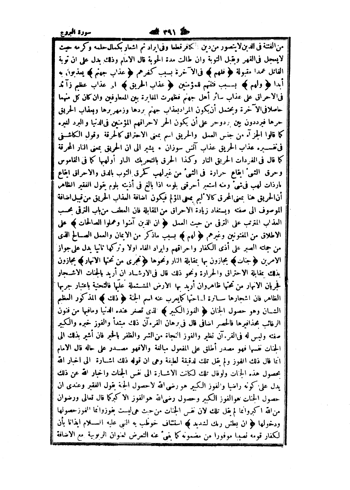 كما قال فى المفردات الحريق النار وكذا الحرق بالتحريك النار أو لهبها كما فى القاموس وحرق الشيء إيقاع حرارة فى الشيء من غير لهب كحرق الثوب بالدق والإحراق إيقاع نار ذات لهب فى شىء ومنه استعير أحرقنى بلومه إذا بالغ فى أذيته بلوم يقول الفقير الظاهر أن الحريق هنا بمعنى المحرق كالأليم بمعنى المؤلم فيكون اضافة العذاب الحريق من قبيل اضافة الموصوف الى صفته ويستفاد زيادة الإحراق من المقابلة فان العطف من باب الترقي بحسب العذاب المترتب على الترقي من حيث العمل إِنَّ الَّذِينَ آمَنُوا وَعَمِلُوا الصَّالِحاتِ على الإطلاق من المفتونين وغيرهم لَهُمْ بسبب ما ذكر من الايمان والعمل الصالح الذي من جملته الصبر على أذى الكفار وإحراقهم وإيراد الفاء اولا وتركها ثانيا يدل على جواز الامرين جَنَّاتٌ يجازون بها بمقابلة النار ونحوها تَجْرِي مِنْ تَحْتِهَا الْأَنْهارُ يجازون بذلك بمقابلة الاحتراق والحرارة ونحو ذلك قال فى الإرشاد ان أريد بالجنات الأشجار فجريان الأنهار من تحتها ظاهر وان أريد بها الأرض المشتملة عليها فالتحتية باعتبار جريها الظاهر فان أشجارها ساترة لساحتها كما يعرب عنه اسم الجنة ذلِكَ المذكور العظيم الشان وهو حصول الجنان الْفَوْزُ الْكَبِيرُ الذي تصغر عنده الدنيا وما فيها من فنون الرغائب بحذافيرها فالحصر إضافي قال فى برهان القرآن ذلك مبتدأ والفوز خبره والكبير صفته وليس له فى القرآن نظير والفوز النجاة من الشر والظفر بالخير فان أشير بذلك الى الجنات نفسها فهو مصدر أطلق على المفعول مبالغة والا فهو مصدر على حاله قال الامام انما قال ذلك الفوز ولم يقل تلك لدقيقة لطيفة وهى ان قوله ذلك اشارة الى اخبار الله بحصول هذه الجنات ولو قال تلك لكانت الاشارة الى نفس الجنات واخبار الله عن ذلك يدل على كونه راضيا والفوز الكبير هو رضى الله لا حصول الجنة يقول الفقير وعندى ان حصول الجنات هو الفوز الكبير وحصول رضى الله هو الفوز الأكبر كما قال تعالى ورضوان من الله اكبر وانما لم يقل تلك لان نفس الجنات من حيث هى ليست بفوز وانما الفوز حصولها ودخولها إِنَّ بَطْشَ رَبِّكَ لَشَدِيدٌ استئناف خوطب به النبي عليه السلام إيذانا بأن لكفار قومه نصيبا موفورا من مضمونه كما ينبئ عنه التعرض لعنوان الربوبية مع الاضافة