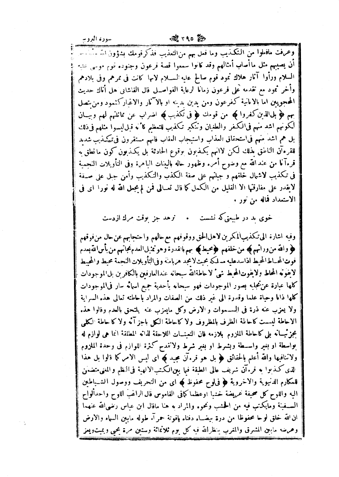 وفيه اشارة الى تكذيب المنكرين لاهل الحق ووقوفهم مع حالهم واحتجابهم عن حال من فوقهم وَاللَّهُ مِنْ وَرائِهِمْ من خلفهم مُحِيطٌ بهم بالقدرة وهو تمثيل العدم نجاتهم من بأس الله بعدم فوت المحاط المحيط إذا سد عليه مسلكه بحيث لا يجد هربا منه وفى التأويلات النجمية محيط والمحيط لا يفوته المحاط ولا يفوت المحيط شىء لا حاطة الله سبحانه عند العارفين بالكافرين بل الموجودات كلها عبارة عن تجليه بصور الموجودات فهو سبحانه بأحدية جميع أسمائه سار فى الموجودات كلها ذاتا وحياة علما وقدرة الى غير ذلك من الصفات والمراد بإحاطته تعالى هذه السراية ولا يعزب عنه ذرة فى السموات والأرض وكل ما يعزب عنه يلتحق بالعدم وقالوا هذه الإحاطة ليست كاحاطة الظرف بالمظروف ولا كاحاطة الكل بأجزائه ولا كاحاطة الكلى بجزئياته بلى كاحاطة الملزوم بلازمه فان التعينات اللاحقة لذاته المطلقة انما هى لوازم له بواسطة او بغير واسطة وبشرط او بغير شرط ولا تقدح كثرة اللوازم فى وحدة الملزوم ولا تنافيها والله أعلم بالحقائق بَلْ هُوَ قُرْآنٌ مَجِيدٌ اى ليس الأمر كما قالوا بل هذا الذي كذبوا به قرآن شريف عالى الطبقة فيما بين الكتب الالهية فى النظم والمعنى متضمن للمكارم الدنيوية والاخروية فِي لَوْحٍ مَحْفُوظٍ اى من التحريف ووصول الشياطين اليه واللوح كل صحيفة عريضة خشبا او عظما كما فى القاموس قال الراغب اللوح واحد ألواح السفينة وما يكتب فيه من الخشب ونحوه والمراد به هنا ما قال ابن عباس رضى الله عنهما ان الله خلق لوحا محفوظا من درة بيضاء دفناه ياقوتة حمراء طوله ما بين السماء والأرض وعرضه ما بين المشرق والمغرب ينظر الله فيه كل يوم ثلاثمائة وستين مرة يحيى ويميت ويعز