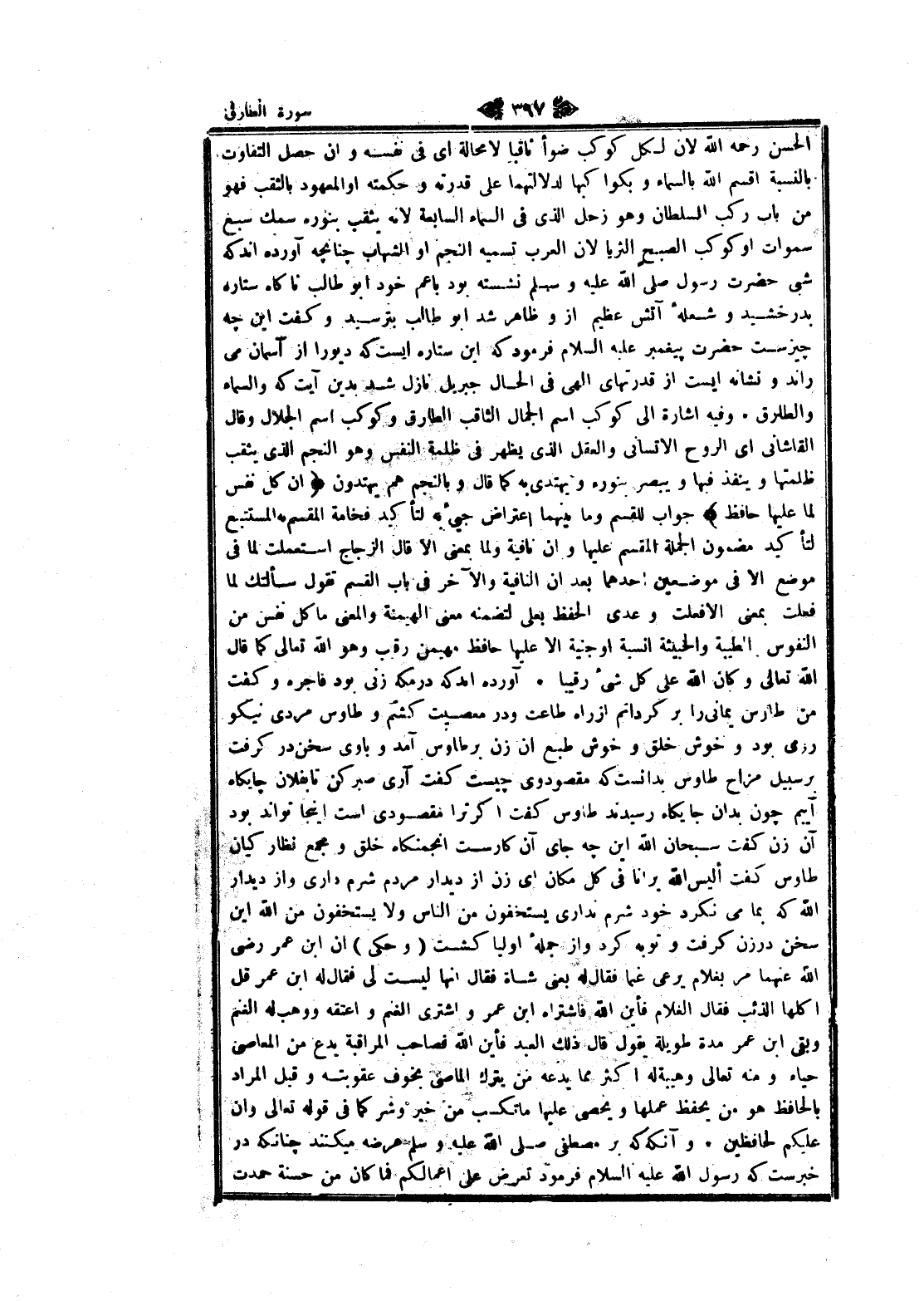 الحسن رحمه الله لان لكل كوكب ضوأ ثاقبا لا محالة اى فى نفسه وان حصل التفاوت بالنسبة اقسم الله بالسماء وبكواكبها لدلالتهما على قدرته وحكمته او المعهود بالثقب فهو من باب ركب السلطان وهو زحل الذي فى السماء السابعة لانه يثقب بنوره سمك سبع سموات او كوكب الصبح الثريا لان العرب تسميه النجم او الشهاب چنانچهـ آورده اند كه شبى حضرت رسول صلى الله عليه وسلم نشسته بود با عم خود ابو طالب ناكاه ستاره بدرخشيد وشعله آتش عظيم ازو ظاهر شد ابو طالب بترسيد وكفت اين چهـ چيزست حضرت پيغمبر عليه السلام فرمود كه اين ستاره ايست كه ديو را از آسمان مى راند ونشانه ايست از قدرتهاى الهى فى الحال جبريل نازل شد بدين آيت كه والسماء والطارق. وفيه اشارة الى كوكب اسم الجمال الثاقب الطارق وكوكب اسم الجلال وقال القاشاني اى الروح الإنساني والعقل الذي يظهر فى ظلمة النفس وهو النجم الذي يثقب ظلمتها وينفذ فيها ويبصر بنوره ويهتدى به كما قال وبالنجم هم يهتدون إِنْ كُلُّ نَفْسٍ لَمَّا عَلَيْها حافِظٌ جواب للقسم وما بينهما اعتراض جيئ به لتأكيد فخامة المقسم به المستتبع لتأكيد مضمون الجملة المقسم عليها وان نافية ولما بمعنى الا قال الزجاج استعملت لما فى موضع الا فى موضعين أحدهما بعد ان النافية والآخر فى باب القسم تقول سألتك لما فعلت بمعنى الا فعلت وعدى الحفظ بعلى لتضمنه معنى الهيمنة والمعنى ما كل نفس من النفوس الطيبة والخبيثة إنسية او جنية الا عليها حافظ مهيمن رقيب وهو الله تعالى كما قال الله تعالى وكان الله على كل شىء رقيبا. آورده اند كه در مكه زنى بود فاجره وكفت من طاوس يمانى را برگردانم از راه طاعت ودر معصيت كشم وطاوس مردى نيكو روى بود وخوش خلق وخوش طبع ان زن بر طاوس آمد وبا وى سخن در كرفت بر سبيل مزاح طاوس بدانست كه مقصودوى چيست كفت آرى صبر كن تا بفلان چايكاه آييم چون بدان جايكاه رسيدند طاوس كفت اگر ترا مقصودى است اينجا تواند بود آن زن كفت سبحان الله اين چهـ جاى آن كارست انجمنگاه خلق ومجمع نظار كيان طاوس كفت أليس الله يرانا فى كل مكان اى زن از ديدار مردم شرم دارى واز ديدار الله كه بما مى نكرد خود شرم ندارى يستخفون من الناس ولا يستخفون من الله اين سخن در زن كرفت وتوبه كرد واز جمله أوليا كشت (وحكى) ان ابن عمر رضى الله عنهما مر بغلام يرعى غنما فقال له يعنى شاة فقال انها ليست لى فقال له ابن عمر قل أكلها الذئب فقال الغلام فأين الله فاشتراه ابن عمر واشترى الغنم واعتقه ووهب له الغنم وبقي ابن عمر مدة طويلة يقول قال ذلك العبد فأين الله فصاحب المراقبة يدع من المعاصي حياء ومنه تعالى وهيبة له اكثر مما يدعه من يترك المعاصي بخوف عقوبته وقيل المراد بالحافظ هو من يحفظ عملها ويحصى عليها ما تكسب من خير وشر كما فى قوله تعالى وان عليكم لحافظين. وآنكه كه بر مصطفى صلى الله عليه وسلم عرضه ميكنند چنانكه در خبرست كه رسول الله عليه السلام فرمود تعرض على أعمالكم فما كان من حسنة حمدت