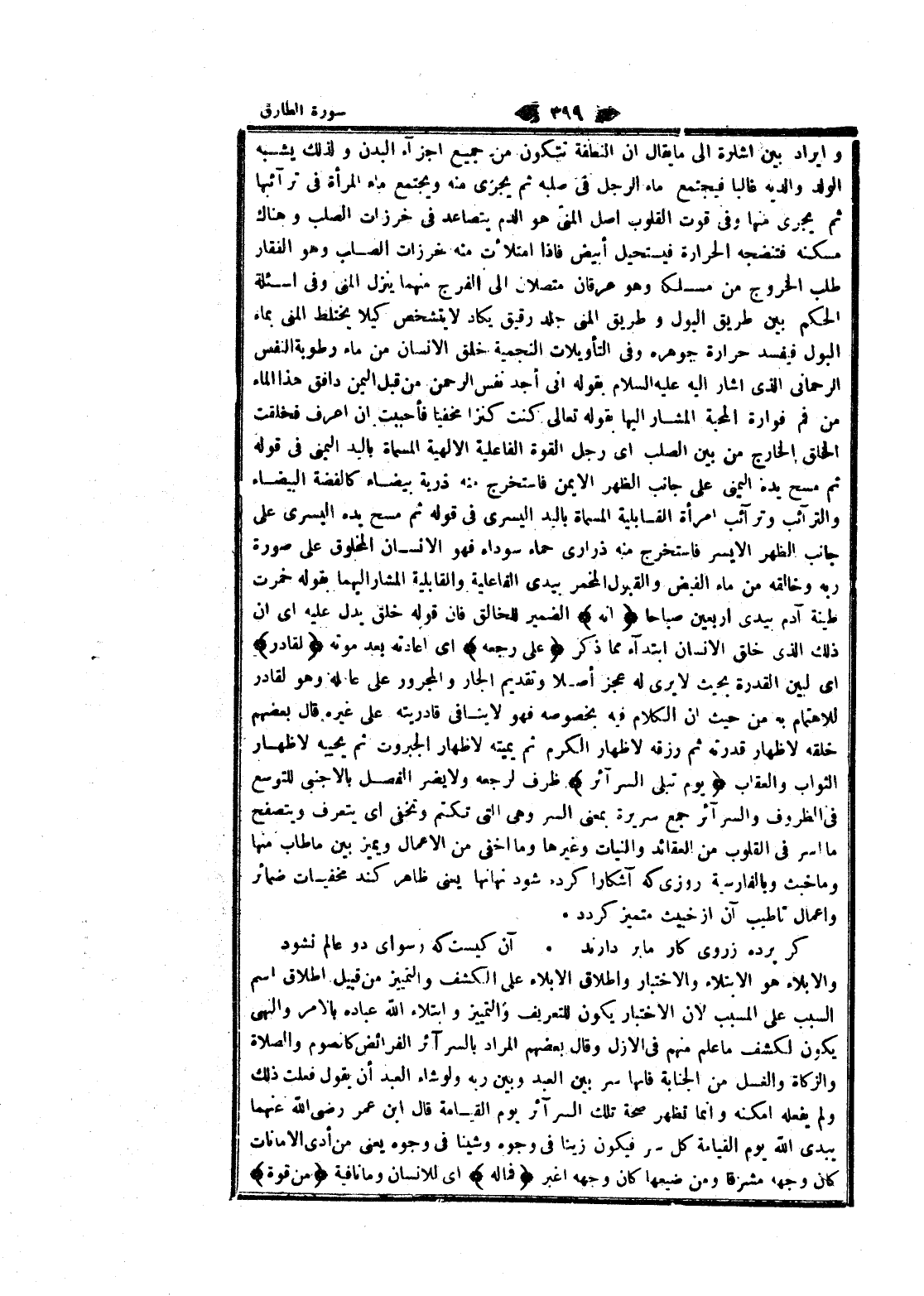 وإيراد بين اشارة الى ما يقال ان النطفة تتكون من جميع اجزاء البدن ولذلك يشبه الولد والديه غالبا فيجتمع ماء الرجل فى صلبه ثم يجرى منه ويجتمع ماء المرأة فى ترائبها ثم يجرى منها وفى قوت القلوب اصل المنى هو الدم يتصاعد فى خرزات الصلب وهناك مسكنه فتنضجه الحرارة فيستحيل أبيض فاذا امتلأت منه خرزات الصلب وهو الفقار طلب الخروج من مسلكه وهو عرقان متصلان الى الفرج منهما ينزل المنى وفى اسئلة الحكم بين طريق البول وطريق المنى جلد رقيق يكاد لا يتشخص كيلا يختلط المنى بماء البول فيفسد حرارة جوهره وفى التأويلات النجمية خلق الإنسان من ماء رطوبة النفس الرحمانى الذي أشار اليه عليه السلام بقوله انى أجد نفس الرحمن من قبل اليمن دافق هذا الماء من فم فوارة المحبة المشار إليها بقوله تعالى كنت كنزا مخفيا فأحببت ان اعرف فخلقت الخلق الخارج من بين الصلب اى رجل القوة الفاعلية الالهية المسماة باليد اليمنى فى قوله ثم مسح يده اليمنى على جانب الظهر الايمن فاستخرج منه ذرية بيضاء كالفضة البيضاء والترائب وترائب امرأة القابلية المسماة باليد اليسرى فى قوله ثم مسح يده اليسرى على جانب الظهر الأيسر فاستخرج منه ذرارى حماء سوداء فهو الإنسان المخلوق على صورة ربه وخالقه من ماء الفيض والقبول المخمر بيدي الفاعلية والقابلية المشار إليهما بقوله خمرت طينة آدم بيدي أربعين صباحا إِنَّهُ الضمير للخالق فان قوله خلق يدل عليه اى ان ذلك الذي خلق الإنسان ابتداء مما ذكر عَلى رَجْعِهِ اى إعادته بعد موته لَقادِرٌ اى لبين القدرة بحيث لا يرى له عجز أصلا وتقديم الجار والمجرور على عامله وهو لقادر للاهتمام به من حيث ان الكلام فيه بخصوصه فهو لا ينافى قادريته على غيره قال بعضهم خلقه لاظهار قدرته ثم رزقه لاظهار الكرم ثم يميته لاظهار الجبروت ثم يحييه لاظهار الثواب والعقاب يَوْمَ تُبْلَى السَّرائِرُ ظرف لرجعه ولا يضر الفصل بالجنبى للتوسع فى الظروف والسرائر جمع سريرة بمعنى السر وهى التي تكتم وتخفى اى يتعرف ويتصفح ما اسر فى القلوب من العقائد والنيات وغيرها وما أخفى من الأعمال ويميز بين ما طاب منها وما خبث وبالفارسية روزى كه آشكارا كرده شود نهانها يعنى ظاهر كند مخفيات ضمائر واعمال تا طيب آن از خبيث متميز كردد.