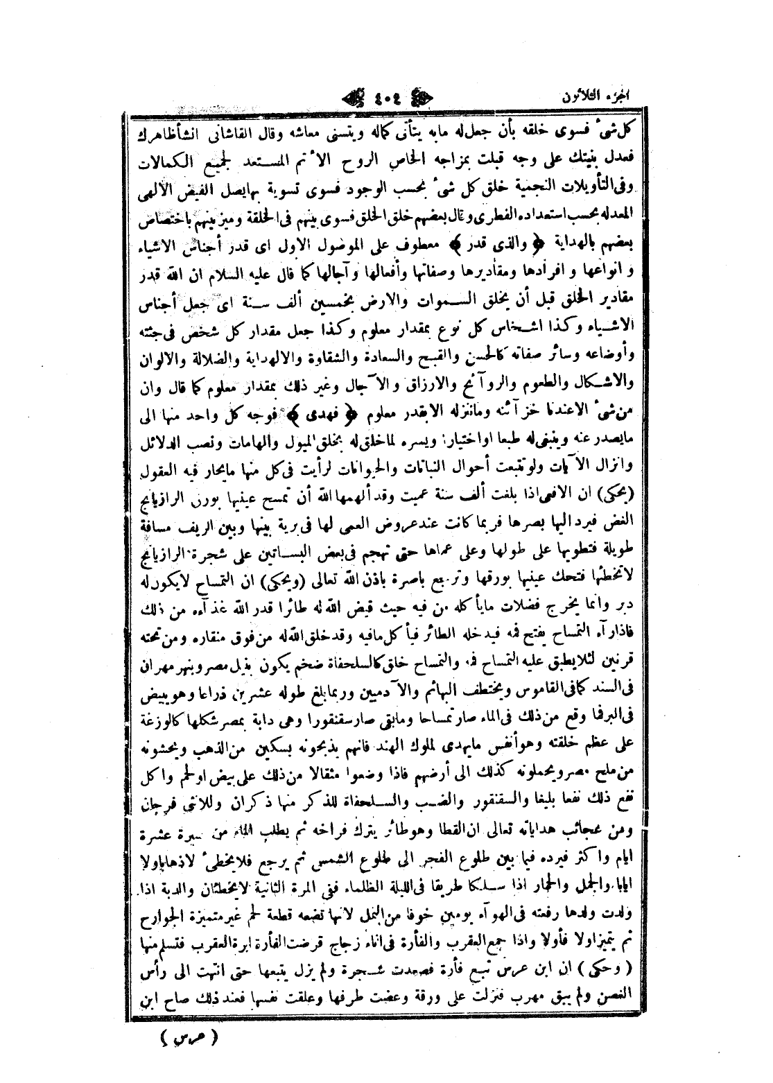 كل شىء فسوى خلقه بأن جعل له ما به يتأتى كماله ويتسنى معاشه وقال القاشاني انشأ ظاهرك فعدل بنيتك على وجه قبلت بمزاجه الخاص الروح الأتم المستعد لجميع الكمالات وفى التأويلات النجمية خلق كل شىء بحسب الوجود فسوى تسوية بها يصل الفيض الإلهي المعد له بحسب استعداده الفطري وقال بعضهم خلق الخلق فسوى بينهم فى الخلقة وميزينهم باختصاص بعضهم بالهداية وَالَّذِي قَدَّرَ معطوف على الموصول الاول اى قدر أجناس الأشياء وأنواعها وافرادها ومقاديرها وصفاتها وأفعالها وآجالها كما قال عليه السلام ان الله قدر مقادير الخلق قبل أن يخلق السموات والأرض بخمسين ألف سنة اى جعل أجناس الأشياء وكذا اشخاص كل نوع بمقدار معلوم وكذا جعل مقدار كل شخص فى جثته وأوضاعه وسائر صفاته كالحسن والقبح والسعادة والشقاوة والهداية والضلالة والألوان والاشكال والطعوم والروائح والأرزاق والآجال وغير ذلك بمقدار معلوم كما قال وان من شىء الا عندنا خزآئنه وما ننزله الا بقدر معلوم فَهَدى فوجه كل واحد منها الى ما يصدر عنه وينبغى له طبعا او اختيارا ويسره لما خلق له بخلق الميول والهامات ونصب الدلائل وإنزال الآيات ولو تتبعت أحوال النباتات والحيوانات لرأيت فى كل منها ما يحار فيه العقول (يحكى) ان الأفعى إذا بلغت ألف سنة عميت وقد ألهمها الله أن تمسح عينيها بورق الرازيانج الغض فيرد إليها بصرها فربما كانت عند عروض العمى لها فى برية بينها وبين الريف مسافة طويلة فتطويها على طولها وعلى عماها حتى تهجم فى بعض البساتين على شجرة الرازيانج لا تخطئها فتحك عينيها بورقها وترجع باصرة بإذن الله تعالى (ويحكى) ان التمساح لا يكون له دبر وانما يخرج فضلات ما يأكله من فيه حيث قيض الله له طائرا قدر الله غذآءه من ذلك فاذا رآه التمساح يفتح فمه فيدخله الطائر فيأكل ما فيه وقد خلق الله له من فوق منقاره ومن تحته قرنين لئلا يطبق عليه التمساح فمه والتمساح خلق كالسلحفاة ضخم يكون بنيل مصر وبنهر مهران فى السند كما فى القاموس ويختطف البهائم والآدميين وربما بلغ طوله عشرين ذراعا وهو يبيض فى البر فما وقع من ذلك فى الماء صار تمساحا وما بقي صار سقنقورا وهى دابة بمصر شكلها كالوزغة على عظم خلقته وهو أنفس ما يهدى لملوك الهند فانهم يذبحونه بسكين من الذهب ويحشونه من ملح مصر ويحملونه كذلك الى أرضهم فاذا وضعوا مثقالا من ذلك على بيض او لحم وأكل نفع ذلك نفعا بليغا والسقنقور والضب والسلحفاة للذكر منها ذكران وللانثى فرجان ومن عجائب هداياته تعالى ان القطا وهو طائر يترك فراخه ثم يطلب الماء من مسيرة عشرة ايام واكثر فيرده فيما بين طلوع الفجر الى طلوع الشمس ثم يرجع فلا يخطئ لا ذهابا ولا إيابا والجمل والحمار إذا سلكا طريقا فى الليلة الظلماء ففى المرة الثانية لا يخطئان والدبة إذا ولدت ولدها رفعته فى الهولء يومين خوفا من النمل لانها تضعه قطعة لحم غير متميزة الجوارح ثم يتميز اولا فأولا وإذا جمع العقرب والفأرة فى اناء زجاج قرضت الفأرة ابرة العقرب فتسلم منها (وحكى) ان ابن عرس تبع فأرة فصعدت شجرة ولم يزل يتبعها حتى انتهت الى رأس الغصن ولم يبق مهرب فنزلت على ورقة وعضت طرفها وعلقت نفسها فعند ذلك صاح ابن