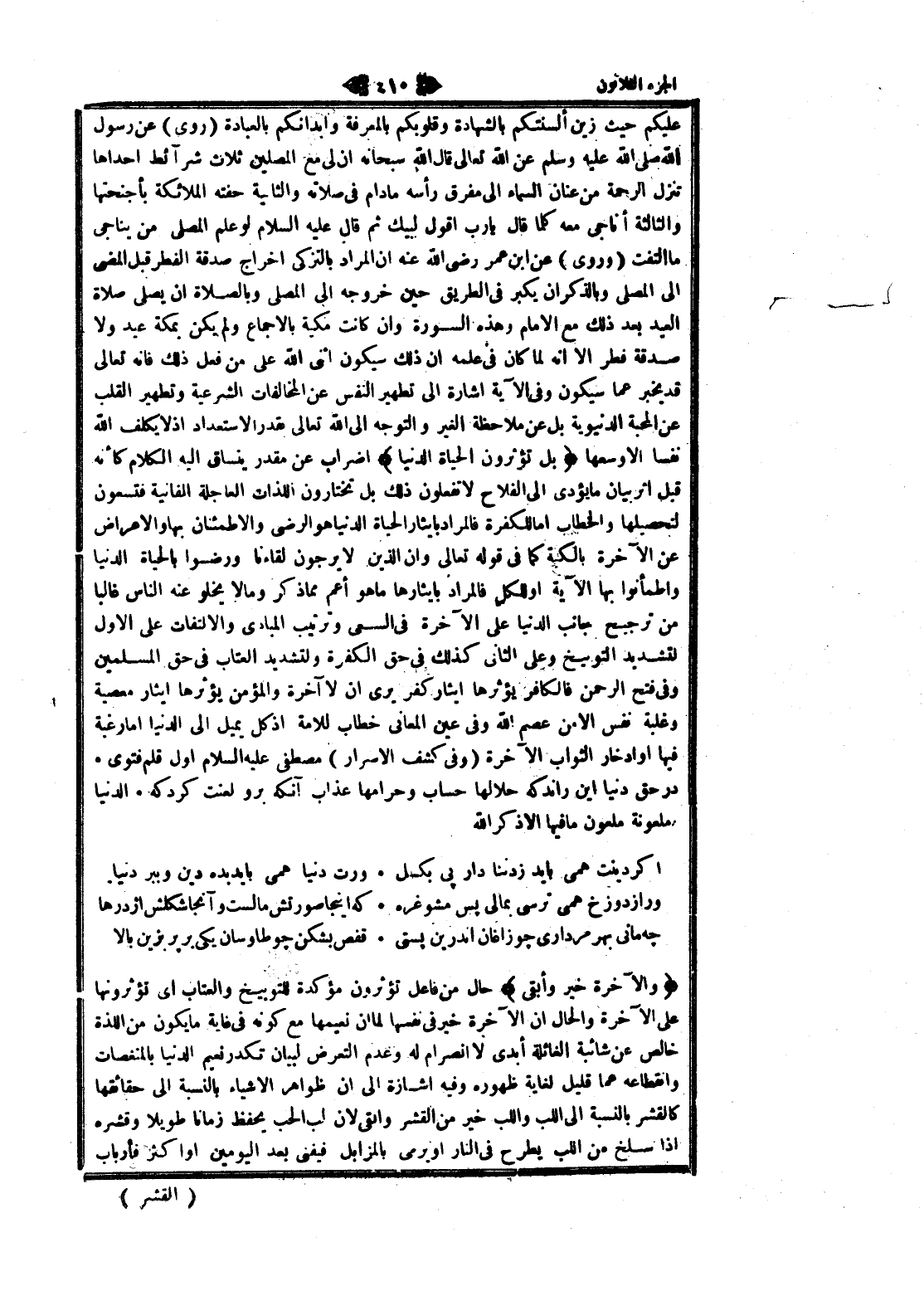 عليكم حيث زين ألسنتكم بالشهادة وقلوبكم بالمعرفة وأبدانكم بالعبادة (روى) عن رسول الله صلى الله عليه وسلم عن الله تعالى قال الله سبحانه ان لى مع المصلين ثلاث شرائط احداها تنزل الرحمة من عنان السماء الى مفرق رأسه مادام فى صلاته والثانية حفته الملائكة بأجنحتها والثالثة أناجى معه كلما قال يا رب أقول لبيك ثم قال عليه السلام لو علم المصلى من يناجى ما التفت (وروى) عن ابن عمر رضى الله عنه ان المراد بالتزكى إخراج صدقة الفطر قبل المضي الى المصلى وبالذكر ان يكبر فى الطريق حين خروجه الى المصلى وبالصلاة ان يصلى صلاة العيد بعد ذلك مع الامام وهذه السورة وان كانت مكية بالإجماع ولم يكن بمكة عيد ولا صدقة فطر الا انه لما كان فى علمه ان ذلك سيكون اثنى الله على من فعل ذلك فانه تعالى قد يخبر عما سيكون وفى الآية اشارة الى تطهير النفس عن المخالفات الشرعية وتطهير القلب عن المحبة الدنيوية بل عن ملاحظة الغير والتوجه الى الله تعالى بقدر الاستعداد إذ لا يكلف الله نفسا الا وسعها بَلْ تُؤْثِرُونَ الْحَياةَ الدُّنْيا إضراب عن مقدر ينساق اليه الكلام كأنه قبل اثر بيان ما يؤدى الى الفلاح لا تفعلون ذلك بل تختارون اللذات العاجلة الفانية فتسعون لتحصيلها والخطاب اما للكفرة فالمراد بايثار الحياة الدنيا هو الرضى والاطمئنان بها والاعراض عن الآخرة بالكلية كما فى قوله تعالى وان الذين لا يرجون لقاءنا ورضوا بالحياة الدنيا واطمأنوا بها الآية او للكل فالمراد بايثارها ما هو أعم مما ذكر وما لا يخلو عنه الناس غالبا من ترجيح جانب الدنيا على الآخرة فى السعى وترتيب المبادي والالتفات على الاول لتشديد التوبيخ وعلى الثاني كذلك فى حق الكفرة ولتشديد العتاب فى حق المسلمين وفى فتح الرحمن فالكافر يؤثرها إيثار كفر يرى ان لا آخرة والمؤمن يؤثرها إيثار معصية وغلبة نفس الا من عصم الله وفى عين المعاني خطاب للامة إذ كل يميل الى الدنيا اما رغبة فيها او ادخار الثواب الآخرة (وفى كشف الاسرار) مصطفى عليه السلام أول قلم فتوى.
