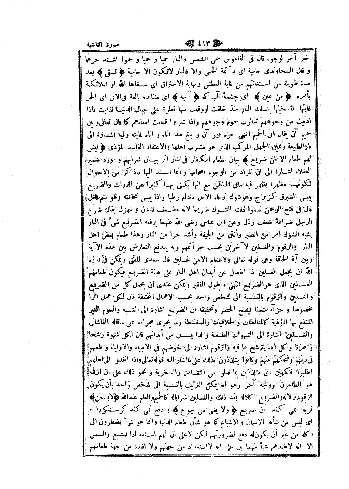 خبر آخر لوجوه قال فى القاموس حمى الشمس والنار حميا وحميا وحموا اشتد حرهما وقال السجاوندى حامية اى دائمة الحمى والا فالنار لا تكون الا حامية تُسْقى بعد مدة طويلة من استغاثتهم من غاية العطش ونهاية الاحتراق اى سقاها الله او الملائكة بأمره مِنْ عَيْنٍ اى چشمه آب كه آنِيَةٍ اى متناهية بالغة فى الانى اى الحر غايتها لتسخينها بتلك النار منذ خلقت لو وقعت منها قطرة على جبال الدنيا لذابت فاذا أدنيت من وجوههم تناثرت لحوم وجوههم وإذا شربوا قطعت أمعاءهم كما قال تعالى وبين حميم آن يقال انى الحميم انتهى حره فهو آن وبلغ هذا اناه واناه غايته وفيه اشارة الى نار الطبيعة وعين الجهل المركب الذي هو مشرب أهلها والاعتقاد الفاسد المؤذى لَيْسَ لَهُمْ طَعامٌ إِلَّا مِنْ ضَرِيعٍ بيان لطعام الكفار فى النار اثر بيان شرابهم وأورد ضمير العقلاء اشارة الى ان المراد من الوجوه أصحابها وانما أسند إليها ما ذكر من الأحوال لكونها مظهرا يظهر فيه ما فى الباطن مع انها يكنى بها كثيرا عن الذوات والضريع يبيس الشبرق كزبرج وهو شوك ترعاه الإبل مادام رطبا وإذا يبس تحامته وهو سم قاتل قال فى فتح الرحمن سموا ذلك الشوك ضريعا لانه مضعف للبدن ومهزل يقال ضرع الرجل ضراعة ضعف وذل وعن ابن عباس رضى الله عنهما يرفعه الضريع شىء فى النار يشبه الشوك امر من الصبر وأنتن من الجيفة وأشد حرا من النار وهذا طعام بعض اهل النار والزقوم والغسلين لآخرين بحسب جرائمهم وبه يندفع التعارض بين هذه الآية وبين آية الحاقة وهى قوله تعالى ولا طعام الا من غسلين قال سعدى المفتى ويمكن فى قدرة الله ان يجعل الغسلين إذا انفصل عن أبدان اهل النار على هئة الضريع فيكون طعامهم الغسلين الذي هو الضريع انتهى. يقول الفقير ويمكن عندى ان يجعل كل من الضريع والغسلين والزقوم بالنسبة الى شخص واحد بحسب الأعمال المختلفة فان لكل عمل اثرا مخصوصا وجزاء متعينا فيصح الحصر وتحقيقه ان الضريع اشارة الى الشبه والعلوم الغير المنتفع بها المؤذية كالمغالطات والخلافيات والسفسطة وما يجرى مجراها على ما قاله القاشاني والغسلين اشارة الى الشهوات الطبيعية ولذا يسيل من أبدانهم فان لكل شهوة رشحا وعرقا وكل اناء يترشح بما فيه والزقوم اشارة الى خوضهم فى الأنبياء والأولياء وطعنهم فى دينهم وضحكهم منهم وكانوا يتلذذون بذلك على ما أشار اليه قوله تعالى وإذا انقلبوا الى أهلهم انقلبوا فكهين اى متلذذين بما فعلوا من التغامز والسخرية ونحو ذلك على ان الزقمة هو الطاعون ووجه آخر وهو انه يمكن الترتيب بالنسبة الى شخص واحد بأن يكون الزقوم نزلاله والضريع أكلا له بعد ذلك والغسلين شرابا له كالحميم والعلم عند الله لا يُسْمِنُ فربه نمى كند آن ضريع وَلا يُغْنِي مِنْ جُوعٍ ودفع نمى كند كرسنكى را.