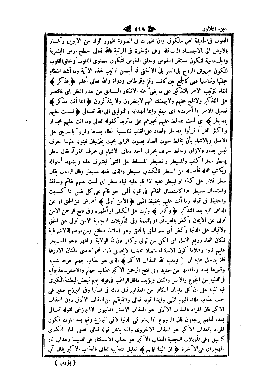 القلوب فى الحقيقة امر ملكوتى وان ظهرت فى الصورة ظهور الولد من الأبوين وأشار بالأرض الى الأجساد السافلة وهى مؤخرة فى المرتبة فالله تعالى سطح ارض البشرية والجسدانية لتكون مستقر النفوس وخلق النفوس لتكون مستوى القلوب وخلق القلوب لتكون عروش الروح بل السر بل الأخفى فما أحسن ترتيب هذه الآية وما أشد انتظام جملتها وتناسها فهى كالجمع بين كاتب وقلم وقرطاس ودواة والله تعالى أعلم فَذَكِّرْ الفاء لترتيب الأمر بالتذكير على ما ينبئ عنه الإنكار السابق من عدم النظر اى فاقتصر على التذكير ولا تلح عليهم ولا يهمنك انهم لا ينظرون ولا يتذكرون إِنَّما أَنْتَ مُذَكِّرٌ تعطيل للامر بما أمرت به اى مبلغ وانما للهداية والتوفيق الى الله تعالى لَسْتَ عَلَيْهِمْ بِمُصَيْطِرٍ اى لست بمسلط عليهم تجبرهم على ما تريد كقوله تعالى وما أنت عليهم بجبار واكثر القراء قرأوا بمصيطر بالصاد على القلب لمناسبة الطاء بعدها وقرئ بالسين على الأصل وبالاشمام بأن يخلط صوت الصاد بصوت الزاى بحيث يمتزجان فيتولد منهما حرف ليس بصاد ولا زاى وخلط حرف بحرف أحد معانى الإشمام فى عرف القراء يقال سطر يسطر سطرا كتب والمسيطر والمصيطر المسلط على الشيء ليشرف عليه ويتعهد أحواله ويكتب عمله فأصله من السطر فالكتاب مسيطر والذي يفعله مسيطر وقال الراغب يقال سطر فلان على كذا او تسطر عليه إذا قام عليه قيام سطر اى لست عليهم بقائم وحافظ واستعمال مسيطر هنا كاستعمال القائم فى قوله أفمن هو قائم على كل نفس بما كسبت والحفيظ فى قوله وما أنت عليهم بحفيظ انتهى إِلَّا مَنْ تَوَلَّى أعرض عن الحق او عن الداعي اليه بعد التذكير وَكَفَرَ وثبت على الكفر او أظهره وفى فتح الرحمن الا من تولى عن الايمان وكفر بالقرءان او بالنعمة وفى التأويلات النجمية الامن تولى عن الحق بالإقبال على الدنيا وكفر أي ستر الحق بالخلق وهو استثناء منقطع ومن موصولة لا شرطية لمكان الفاء ورفع الفعل اى لكن من تولى وكفر فان لله الولاية والقهر وهو المسيطر عليهم قالوا وعلامة كون الاستثناء متصلا محضا لا يحسن ذلك نحو عندى مائتان إلا درهما فلا يدخل عليه ان فَيُعَذِّبُهُ اللَّهُ الْعَذابَ الْأَكْبَرَ الذي هو عذاب جهنم حرها شديد وقعرها بعيد ومقامعها من حديد وفى فتح الرحمن الأكبر عذاب جهنم والأصغر ما عذبوا به فى الدنيا من الجوع والاسر والقتل ويؤيده ما قال الراغب فى قوله يوم نبطش البطشة الكبرى فيه تنبيه على ان كل ما ينال الكافر من العذاب قبل ذلك فى الدنيا وفى البرزخ صغير فى جنب عذاب ذلك اليوم انتهى وايضا قوله تعالى ولنذيقنهم من العذاب الأدنى دون العذاب الأكبر فان المراد بالعذاب الأدنى هو العذاب الأصغر الدنيوي لا البرزخى لقوله تعالى بعده لعلهم يرجعون فان الرجوع انما يعتبر فى الدنيا لا فى البرزخ وفيما بعد الموت فيكون المراد بالعذاب الأكبر هو العذاب الأخروي واليه ينظر قوله تعالى يصلى النار الكبرى كما سبق وفى تأويلات النجمية العذاب الأكبر هو عذاب الاستتار فى الدنيا وعذاب نار الهجران فى الآخرة إِنَّ إِلَيْنا إِيابَهُمْ تعليل لتعذيبه تعالى بالعذاب الأكبر يقال آب