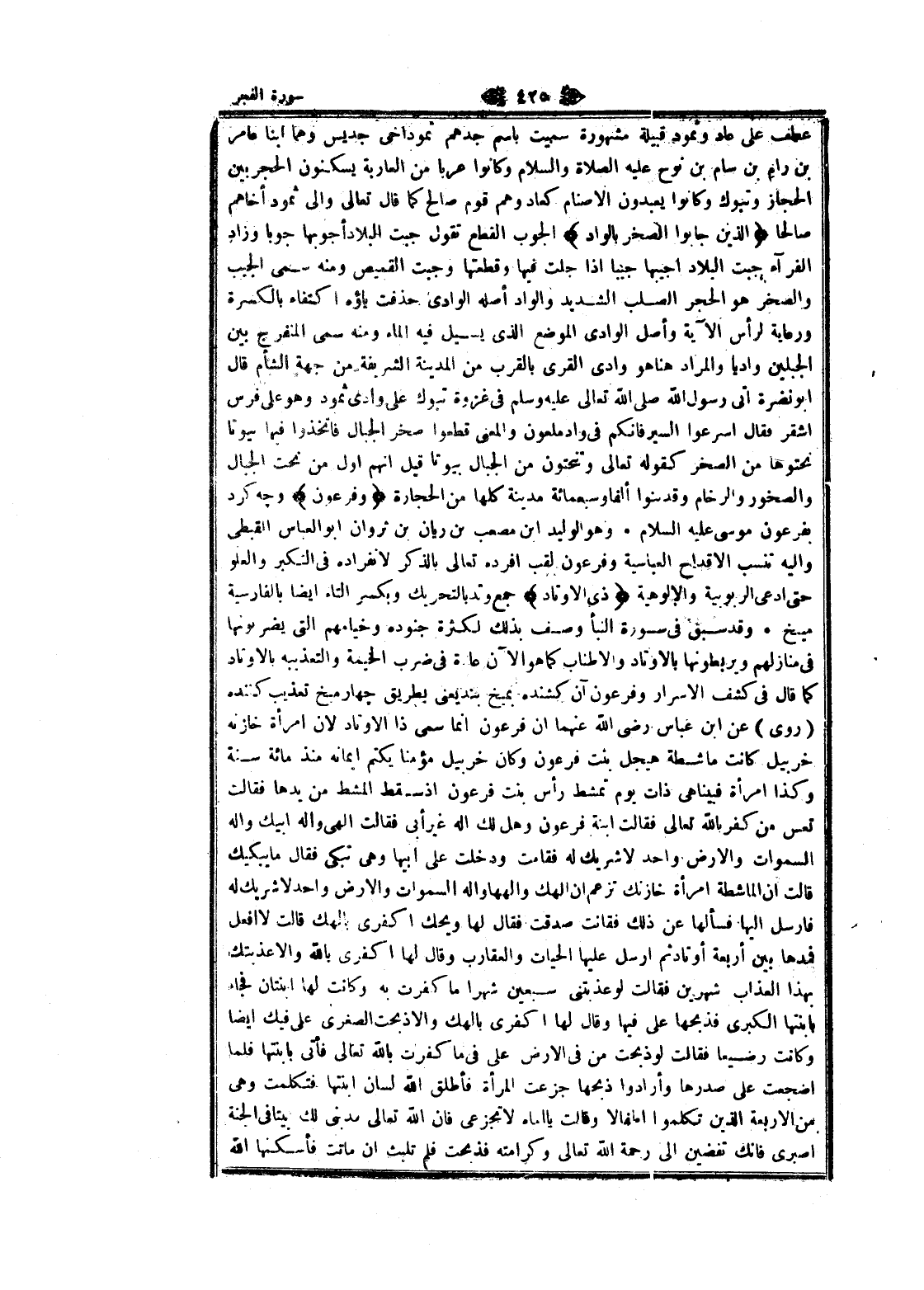 عطف على عاد وثمود قبيلة مشهورة سميت باسم جدهم ثمود أخي جديس وهما ابنا عامر بن رام بن سام بن نوح عليه الصلاة والسلام وكانوا عربا من العاربة يسكنون الحجر بين الحجاز وتبوك وكانوا يعبدون الأصنام كعاد وهم قوم صالح كما قال تعالى والى ثمود أخاهم صالحا الَّذِينَ جابُوا الصَّخْرَ بِالْوادِ الجوب القطع تقول جبت البلاد أجوبها جوبا وزاد الفراء جبت البلاد اجيبها جيبا إذا جلت فيها وقطعتها وجبت القميص ومنه سمى الجيب والصخر هو الحجر الصلب الشديد والواد أصله الوادي حذفت ياؤه اكتفاء بالكسرة ورعاية لرأس الآية وأصل الوادي الموضع الذي يسيل فيه الماء ومنه سمى المنفرج بين الجبلين واديا والمراد هنا هو وادي القرى بالقرب من المدينة الشريفة من جهة الشام قال ابو نضرة اتى رسول الله صلى الله تعالى عليه وسلم فى غزوة تبوك على وادي ثمود وهو على فرس أشقر فقال اسرعوا السير فانكم فى واد ملعون والمعنى قطعوا صخر الجبال فاتخذوا فيها بيوتا تحتوها من الصخر كقوله تعالى وتنحتون من الجبال بيوتا قيل انهم أول من تحت الجبال والصخور والرخام وقد بنوا ألفا وسبعمائة مدينة كلها من الحجارة وَفِرْعَوْنَ و چهـ كرد بفرعون موسى عليه السلام. وهو الوليد ابن مصعب بن ريان بن ثروان ابو العباس القبطي واليه تنسب الأقداح العباسية وفرعون لقب أفرده تعالى بالذكر لانفراده فى التكبر والعلو حتى ادعى الربوبية والالوهية ذِي الْأَوْتادِ جمع وتد بالتحريك وبكسر التاء ايضا بالفارسية ميخ. وقد سبق فى سورة النبأ وصف بذلك لكثرة جنوده وخيامهم التي يضربونها فى منازلهم ويربطونها بالأوتاد والاطناب كما هو الآن عادة فى ضرب الخيمة والتعذيبه بالأوتاد كما قال فى كشف الاسرار وفرعون آن كشنده بميخ بند يعنى بطريق چهار ميخ تعذيب كننده (روى) عن ابن عباس رضى الله عنهما ان فرعون انما سمى ذا الأوتاد لان امرأة خازنه خربيل كانت ماشطة هيجل بنت فرعون وكان خربيل مؤمنا يكتم إيمانه منذ مائة سنة وكذا امرأة فبيناهى ذات يوم تمشط رأس بنت فرعون إذ سقط المشط من يدها فقالت تعس من كفر بالله تعالى فقالت ابنة فرعون وهل لك اله غير أبى فقالت الهى واله أبيك واله السموات والأرض واحد لا شريك له فقامت ودخلت على أبيها وهى تبكى فقال ما يبكيك قالت ان الماشطة امرأة خازنك تزعم ان إلهك والهها واله السموات والأرض واحد لا شريك له فارسل إليها فسألها عن ذلك فقالت صدقت فقال لها ويحك اكفرى بإلهك قالت لا افعل فمدها بين أربعة أوتاد ثم أرسل عليها الحيات والعقارب وقال لها اكفرى بالله والا عذبتك بهذا العذاب شهرين فقالت لو عذبتنى سبعين شهرا ما كفرت به وكانت لها ابنتان فجاء بابنتها الكبرى فذبحها على فيها وقال لها اكفرى بإلهك والا ذبحت الصغرى على فيك ايضا وكانت رضيعا فقالت لو ذبحت من فى الأرض على فى ما كفرت بالله تعالى فأتى بابنتها فلما أضجعت على صدرها وأرادوا ذبحها جزعت المرأة فأطلق الله لسان ابنتها فتكلمت وهى من الاربعة الذين تكلموا أطفالا وقالت يا أماه لا تجزعى فان الله تعالى قد بنى لك بيتا فى الجنة اصبري فانك تفضين الى رحمة الله تعالى وكرامته فذبحت فلم تلبث ان ماتت فأسكنها الله