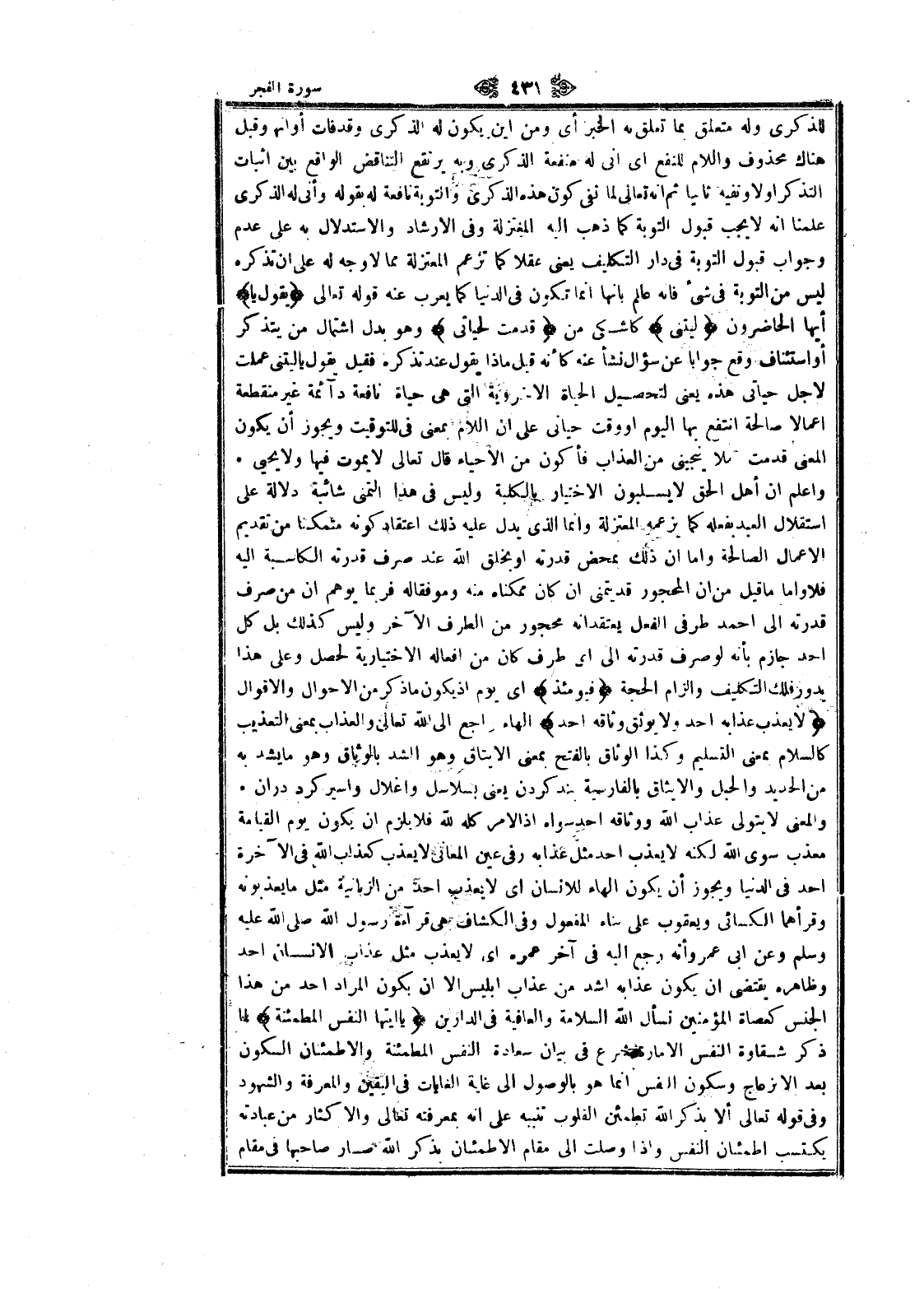والمعنى لا يتولى عذاب الله ووثاقه أحد سواه إذ الأمر كله لله فلا يلزم ان يكون يوم القيامة معذب سوى الله لكنه لا يعذب أحد مثل عذابه وفى عين المعاني لا يعذب كعذاب الله فى الآخرة أحد فى الدنيا ويجوز أن يكون الهاء للانسان اى لا يعذب أحد من الزبانية مثل ما يعذبونه وقرأهما الكسائي ويعقوب على بناء المفعول وفى الكشاف هى قراءة رسول الله صلى الله عليه وسلم وعن ابى عمر وأنه رجع اليه فى آخر عمره اى لا يعذب مثل عذاب الإنسان أحد وظاهره يقتضى ان يكون عذابه أشد من عذاب إبليس الا ان يكون المراد أحد من هذا الجنس كعصاة المؤمنين نسأل الله السلامة والعافية فى الدارين يا أَيَّتُهَا النَّفْسُ الْمُطْمَئِنَّةُ لما ذكر شقاوة النفس الامارة شرع فى بيان سعادة النفس المطمئنة والاطمئنان السكون بعد الإزعاج وسكون النفس انما هو بالوصول الى غاية الغايات فى اليقين والمعرفة والشهود وفى قوله تعالى ألا بذكر الله تطمئن القلوب تنبيه على انه بمعرفته تعالى والإكثار من عبادته يكتسب اطمئنان النفس وإذا وصلت الى مقام الاطمئنان بذكر الله صار صاحبها فى مقام