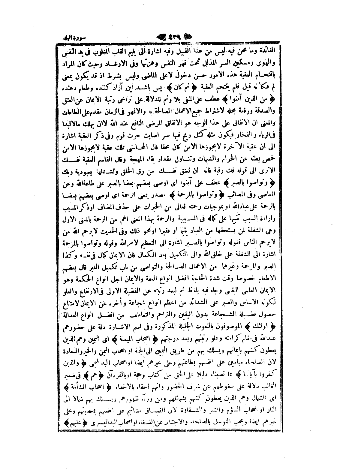 الفائدة وما نحن فيه ليس من هذا القبيل وفيه اشارة الى يتيم القلب المغلوب فى يد النفس والهوى ومسكين السر المذلل تحت قهر النفس وعزتها وفى الإرشاد وحيث كان المراد باقتحام العقبة هذه الأمور حسن دخول لا على الماضي وليس بشرط إذ قد يكون بمعنى لم فكأنه قيل فلم يقتحم العقبة ثُمَّ كانَ پس باشد اين آزاد كننده وطعام دهنده مِنَ الَّذِينَ آمَنُوا عطف على المنفي بلا وثم للدلالة على تراخى رتبة الايمان عن العتق والصدقة ورفعة محله لاشتراط جميع الأعمال الصالحة به والا فهو فى الزمان مقدم على الطاعات والمعنى ان الانفاق على هذا الوجه هو الانفاق المرضى النافع عند الله لا ان يهلك ما لا لبدا فى الرياء والفخار فيكون مثله كمثل ريح فيها صر أصابت حرث قوم وفى ذكر العقبة اشارة الى ان عقبة الآخرة لا يجوزها الا من كان محقا قال المحاسبى تلك عقبة لا يجوزها الا من خمص بطنه عن الحرام والشبهات وتناول مقدار بقاء المهجة وقال القاسم العقبة نفسك الا ترى الى قوله فك رقبة فانه ان تعتق نفسك من رق الخلق وتشغلها بعبودية ربك وَتَواصَوْا بِالصَّبْرِ عطف على آمنوا اى اوصى بعضهم بعضا بالصبر على طاعة الله وعن المعاصي وفى المصائب وَتَواصَوْا بِالْمَرْحَمَةِ مصدر بمعنى الرحمة اى اوصى بعضهم بعضا بالرحمة على عباد الله او بموجبات رحمته تعالى من الخيرات على حذف المضاف او ذكر المسبب وارادة السبب تنبيها على كماله فى السببية والرحمة بهذا المعنى أعم من الرحمة بالمعنى الاول وهى الشفقة لمن يستحقها من العباد يتيما او فقيرا او نحو ذلك وفى الحديث لا يرحم الله من لا يرحم الناس فقوله وتواصوا بالصبر اشارة الى التعظيم لامر الله وقوله وتواصوا بالمرحمة اشارة الى الشفقة على خلق الله والى التكميل بعد الكمال فان الايمان كمال فى نفسه وكذا الصبر والمرحمة وغيرهما من الأعمال الصالحة والتواصي من باب تكميل الغير قال بعضهم الإطعام خصوصا وقت شدة الحاجة أفضل انواع العفة والايمان أجل انواع الحكمة وهو الايمان العلمي اليقيني وجاء فيه بلفظ ثم لبعد رتبته عن الفضيلة الاولى فى الارتفاع والعلو لكونه الأساس والصبر على الشدائد من أعظم انواع شجاعة وأخره عن الايمان لامتناع حصول فضيلة الشجاعة بدون اليقين والتراحم والتعاطف من أفضل انواع العدالة أُولئِكَ الموصوفون بالنعوت الجليلة المذكورة وفى اسم الاشارة دلة على حضورهم عند الله فى مقام كرامته وعلو رتبتهم وبعد درجتهم أَصْحابُ الْمَيْمَنَةِ اى اليمين وهم الذين يعطون كتبهم بايمانهم ويسلك بهم من طريق اليمين الى الجنه او اصحاب اليمين والخير والسعادة لان الصلحاء ميامين على أنفسهم بطاعتهم وعلى غيرهم ايضا او اصحاب اليد اليمنى وَالَّذِينَ كَفَرُوا بِآياتِنا بما نصبناه دليلا على الحق من كتاب وحجة او بالقرءان هُمْ فى ضمير الغالب دلالة على سقوطهم عن شرف الحضور وانهم أحقاء بالإخفاء أَصْحابُ الْمَشْأَمَةِ اى الشمال وهم الذين يعطون كتبهم بشمائلهم ومن ورلء ظهورهم ويسلك بهم شمالا الى النار او اصحاب السؤم والشر والشقاوة لان الفساق مشائيم على أنفسهم بمعصيتهم وعلى غيرهم ايضا ويجب التوسل بالصلحاء والاجتناب عن الفسقاء او اصحاب اليد اليسرى عَلَيْهِمْ